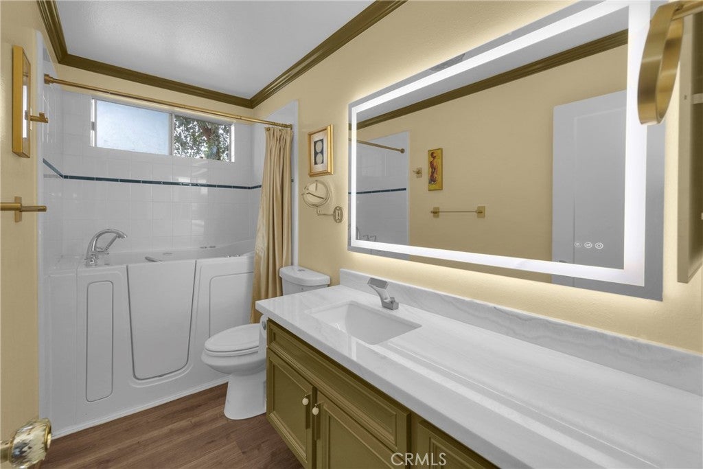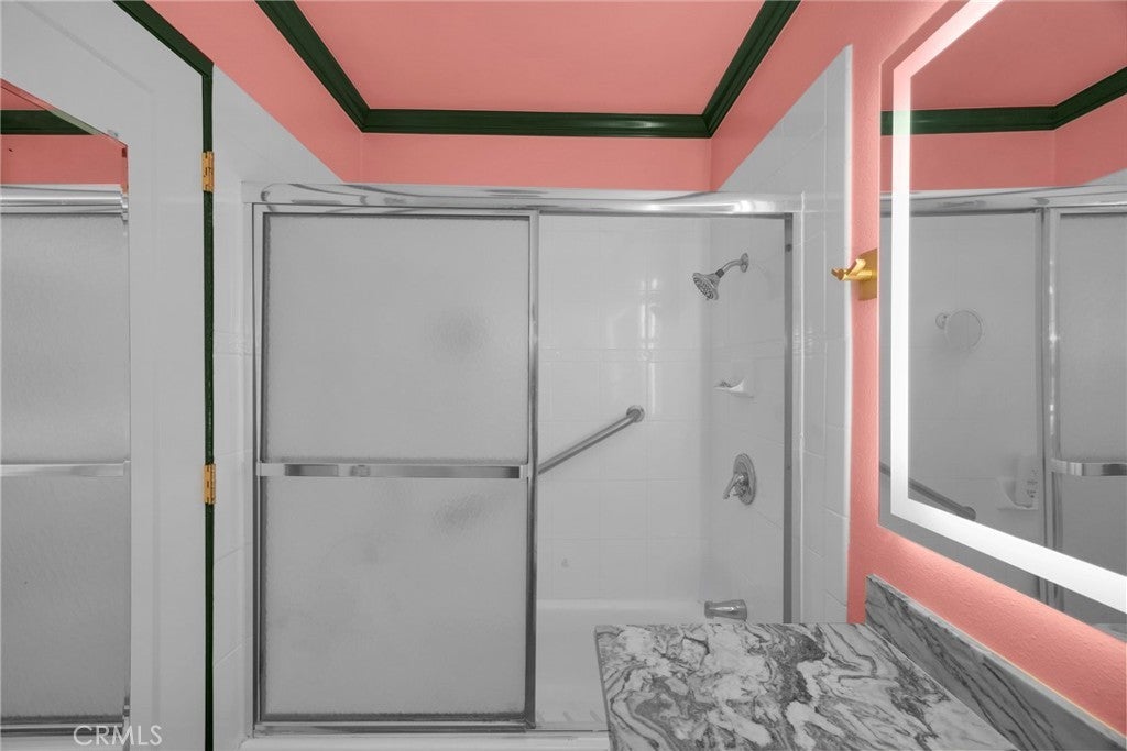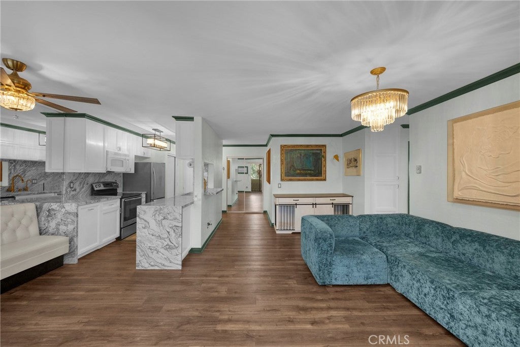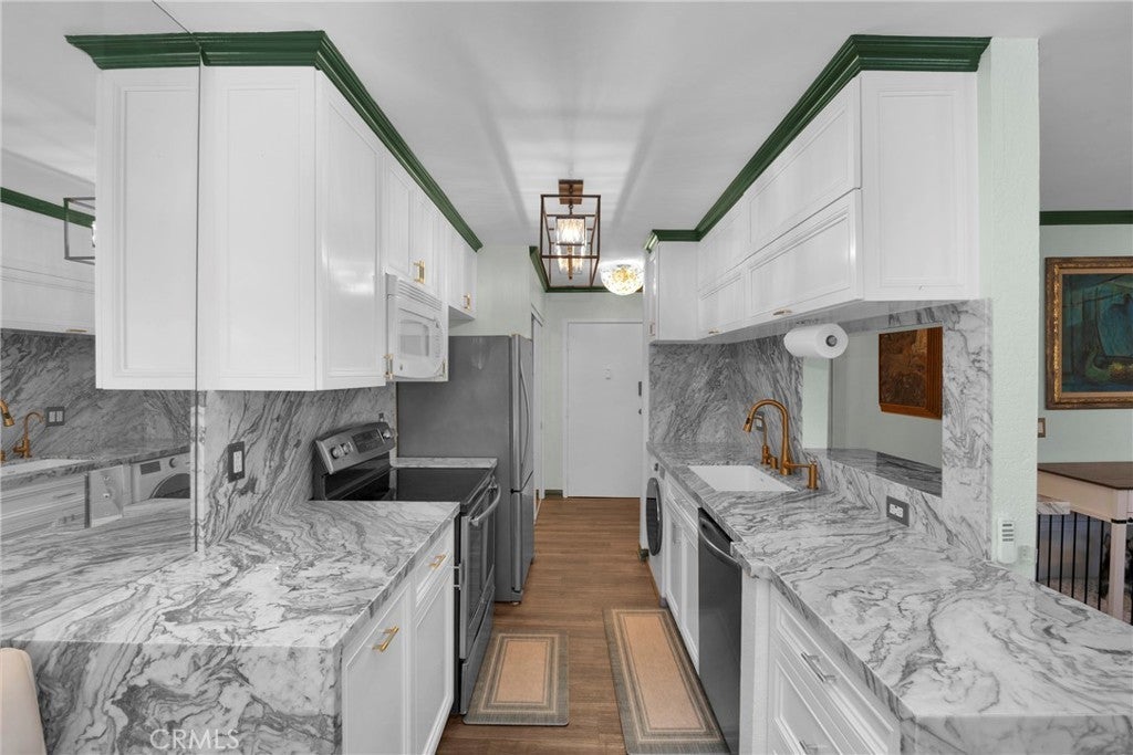 Perched on the top floor, this single-story 2-bedroom, 2-bath corner residence equipped with 2 private balconies and a private washer and dryer inside the home offers an unmatched level of convenience and exclusivity. Flooded with natural east-facing light, the home features elegant chandelier lighting, expansive windows, and two private balconies overlooking lush greenery for a tranquil Hollywood retreat. Over $50,000 in thoughtfully curated upgrades elevate the space, including an enlarged chef’s kitchen with stainless steel appliances, custom italian marble countertops and backsplash, and sleek modern finishes. Both bathrooms have been newly renovated to showcase luxurious onyx and Italian marble countertops, delivering a spa-inspired experience. Year-round comfort is ensured with a brand-new AC and heating system, while ample custom storage enhances everyday functionality. The residence includes three total parking spaces, featuring secure gated tandem parking for two plus an additional dedicated spot. Located moments from the Hollywood Bowl, theaters, dining, shopping, and major freeways, this sophisticated home offers the perfect balance of peaceful living and iconic Hollywood energy.
