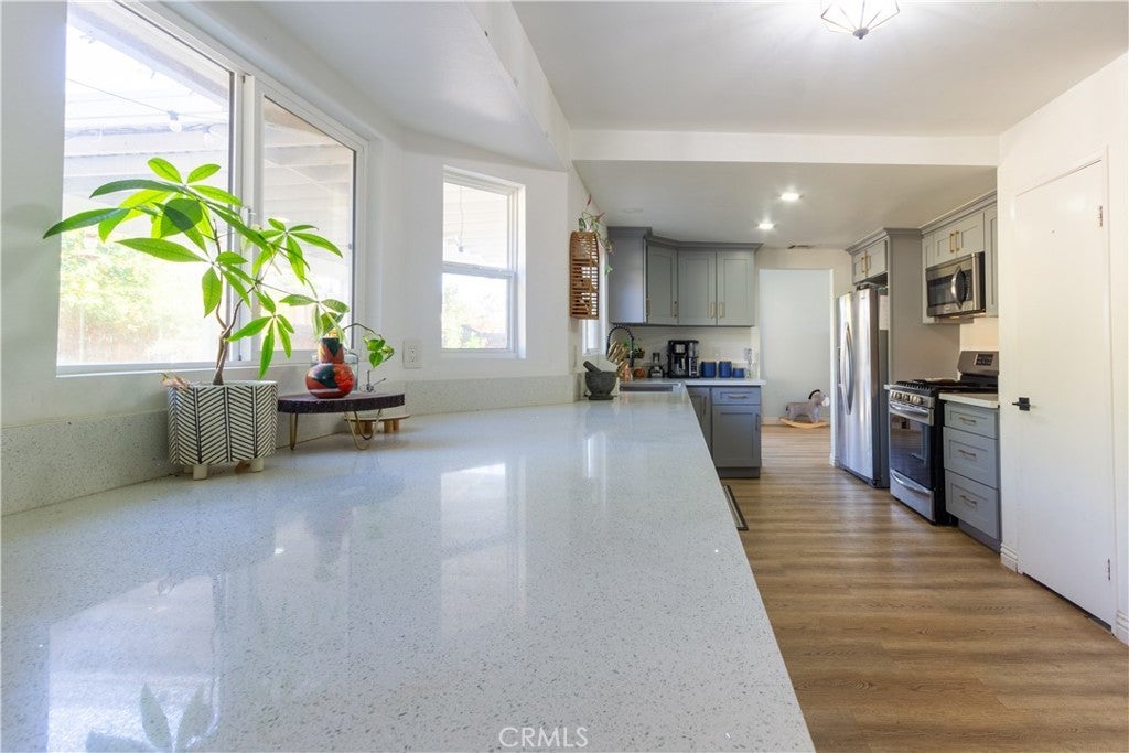 This 3-bedroom, 2.5-bath home offers a thoughtfully updated interior paired with an exceptional outdoor setting. The main living areas showcase upgraded luxury vinyl plank flooring, creating a cohesive and modern feel throughout. The remodeled kitchen features shaker-style cabinetry, quartz countertops, updated hardware, stainless steel appliances, and ample preparation space, making it both stylish and functional. A whole-house water softener system and WiFi-controlled front and rear irrigation system add everyday convenience. Generous windows invite abundant natural light while framing backyard views, enhancing the open and welcoming living environment. Experience the perfect blend of functionality and clean, contemporary design in a home designed for comfort and ease of living. The backyard showcases a mature collection of fruit trees, including Navel oranges, tangerine, kumquat, Meyer lemon, Bearss lime, Lisbon lemons, pomegranate, guava, avocado, banana, fig, and pear, offering both visual appeal and year-round harvest potential. Additional highlights include leased solar and NO HOA. Ideally located near local schools, shopping, parks, and convenient commuter access.
