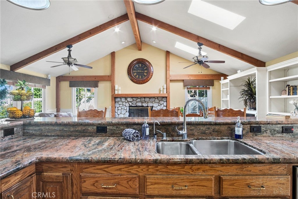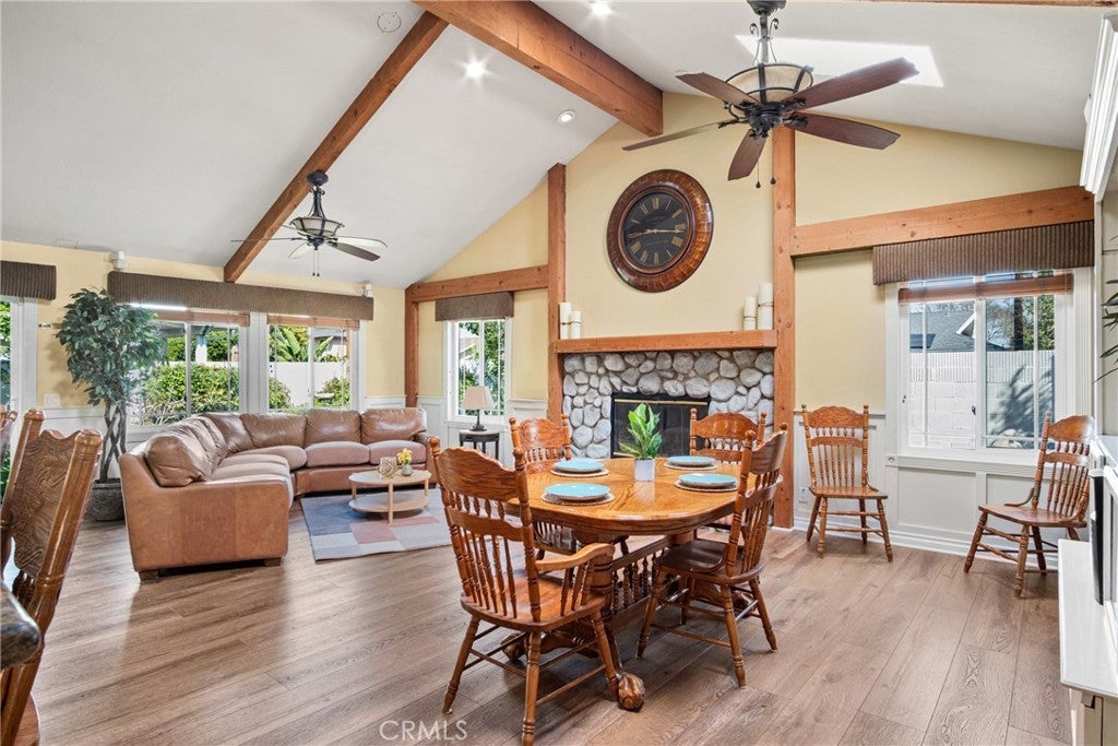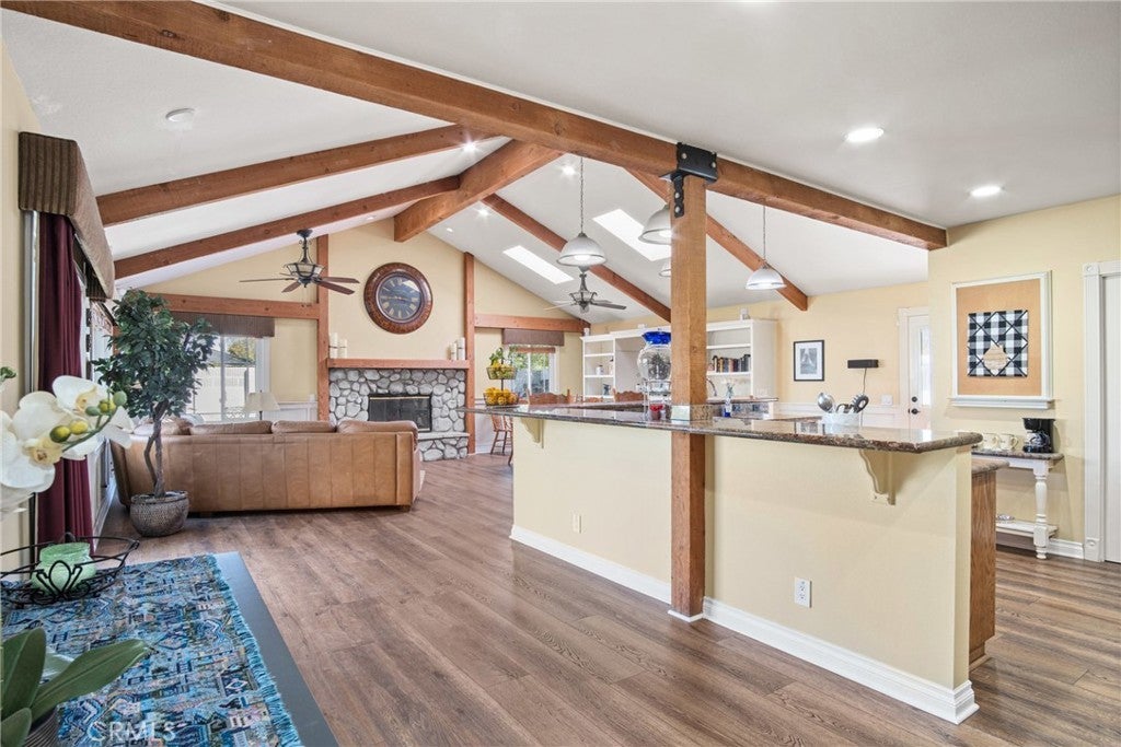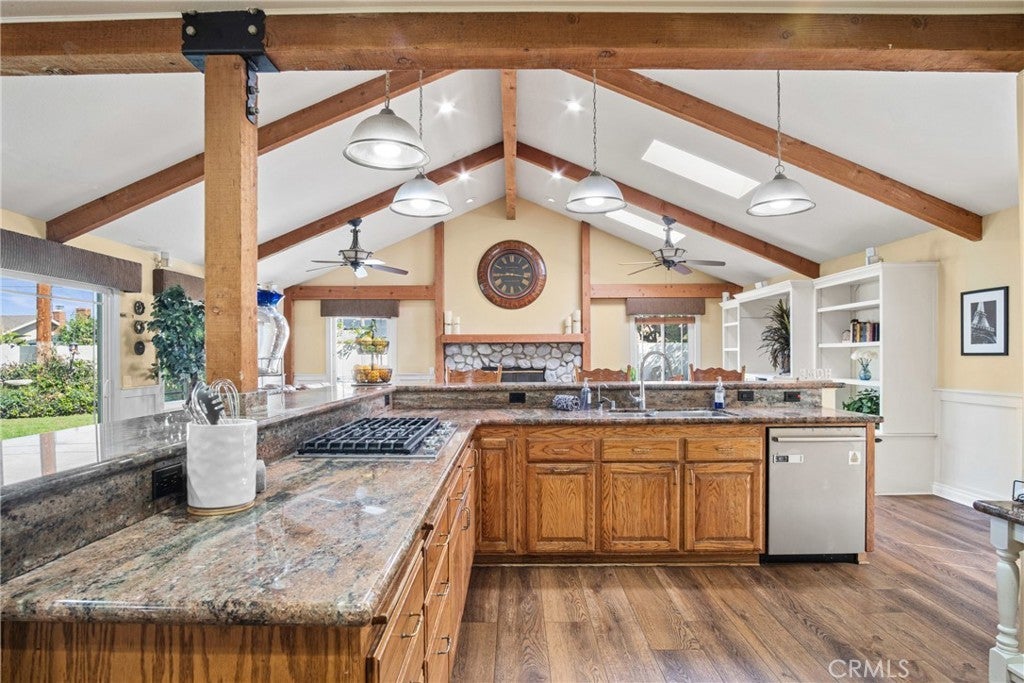 PRIME CYPRESS LOCATION HOME AWAITS ITS NEXT FAMILY! This upgraded, freshly painted expansive home on a beautiful street in Cypress is available for the first time in decades! Don't miss out! The curb appeal is quite evident as you arrive. There is a large concrete driveway able to accommodate 4 cars and there is a 2-car garage, as well. There are three lovely brick planters/flowerbeds, a brick patterned walkway and the foliage is fresh and well cultivated, showing obvious pride of ownership. As you step in the front door, you're met with the first of two living areas (BOTH boasting fireplaces...such a luxury in California nowadays). This living room has plantation shutters and a stacked stone fireplace flanked by built-in bookshelves and storage, as well as a wood mantle. Canned lighting and laminate floors run throughout the first floor, along with upgraded windows. The massive kitchen has warm-toned cabinets, drop down pendant lights and granite countertops with a bar for stool seating. This opens up to the second living area, a huge den that boasts high vaulted ceilings with massive rustic beams, two drop down ceiling fans, two skylights, and an amazing river rock hearth and mantle. Off the kitchen is a dedicated laundry room with more storage cabinets, and a convenient powder room. Don't like to climb the stairs to go to bed? No worries! This home has a first floor master bedroom and upgraded full bath showcasing travertine tiles, glass door shower enclosure, and granite countertops. All three upstairs bedrooms are freshly painted and have ceiling fans. The hall full bath is quite large with a double sink vanity topped with granite, travertine tile, glass shower enclosure and a spa tub! The garage is currently being used as an office, and the floors are tiled with a durable black and white tile made to withstand a car's weight. The back yard off the den has well-manicured grass, a wood awning covered patio perfect for BBQs and quiet dinners, a second patio area with large cobblestone like coverage for another place to rest or entertain which also has a small relaxing pond. This home is perfect for a large or multi-generational family living. The set up is awesome, the schools are amazing and the area can't be beat!