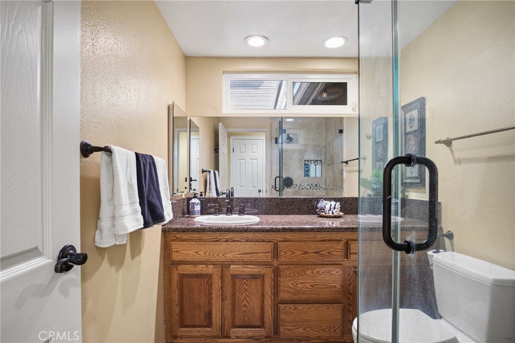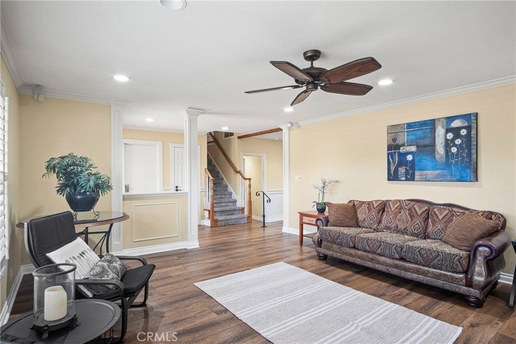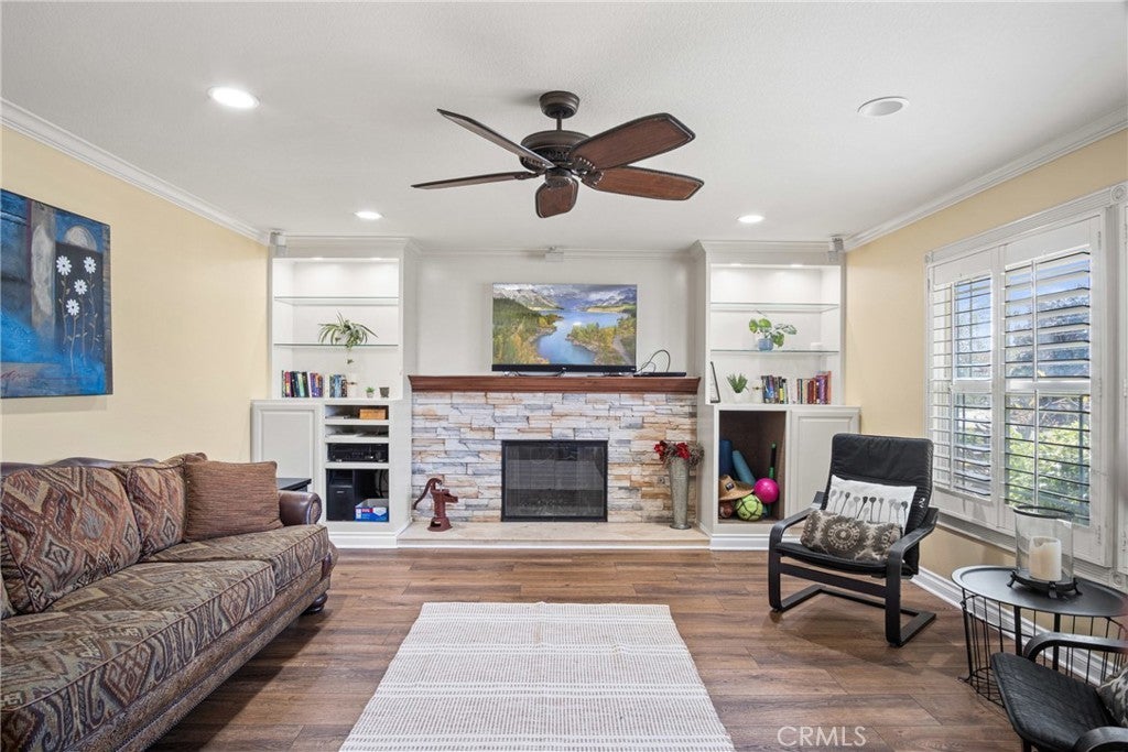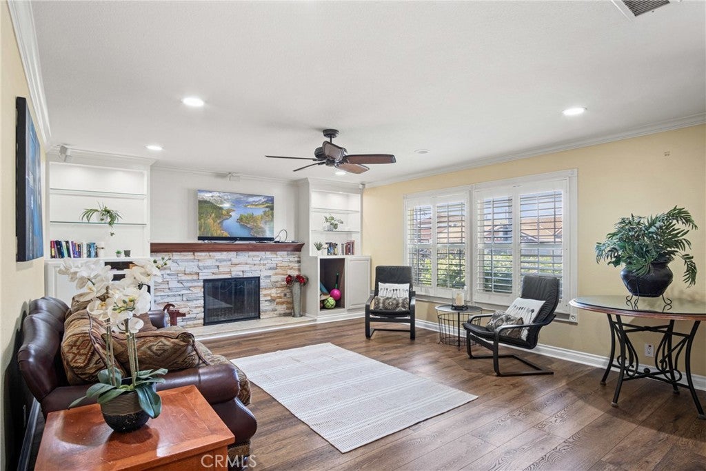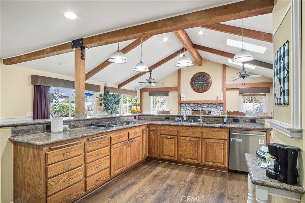 PRIME CYPRESS LOCATION HOME AWAITS ITS NEXT FAMILY! This upgraded, freshly painted expansive home on a beautiful street in Cypress is available for the first time in decades! Don't miss out! The curb appeal is quite evident as you arrive. There is a large concrete driveway able to accommodate 4 cars and there is a 2-car garage, as well. There are three lovely brick planters/flowerbeds, a brick patterned walkway and the foliage is fresh and well cultivated, showing obvious pride of ownership. As you step in the front door, you're met with the first of two living areas (BOTH boasting fireplaces...such a luxury in California nowadays). This living room has plantation shutters and a stacked stone fireplace flanked by built-in bookshelves and storage, as well as a wood mantle. Canned lighting and laminate floors run throughout the first floor, along with upgraded windows. The massive kitchen has warm-toned cabinets, drop down pendant lights and granite countertops with a bar for stool seating. This opens up to the second living area, a huge den that boasts high vaulted ceilings with massive rustic beams, two drop down ceiling fans, two skylights, and an amazing river rock hearth and mantle. Off the kitchen is a dedicated laundry room with more storage cabinets, and a convenient powder room. Don't like to climb the stairs to go to bed? No worries! This home has a first floor master bedroom and upgraded full bath showcasing travertine tiles, glass door shower enclosure, and granite countertops. All three upstairs bedrooms are freshly painted and have ceiling fans. The hall full bath is quite large with a double sink vanity topped with granite, travertine tile, glass shower enclosure and a spa tub! The garage is currently being used as an office, and the floors are tiled with a durable black and white tile made to withstand a car's weight. The back yard off the den has well-manicured grass, a wood awning covered patio perfect for BBQs and quiet dinners, a second patio area with large cobblestone like coverage for another place to rest or entertain which also has a small relaxing pond. This home is perfect for a large or multi-generational family living. The set up is awesome, the schools are amazing and the area can't be beat!