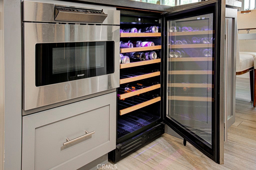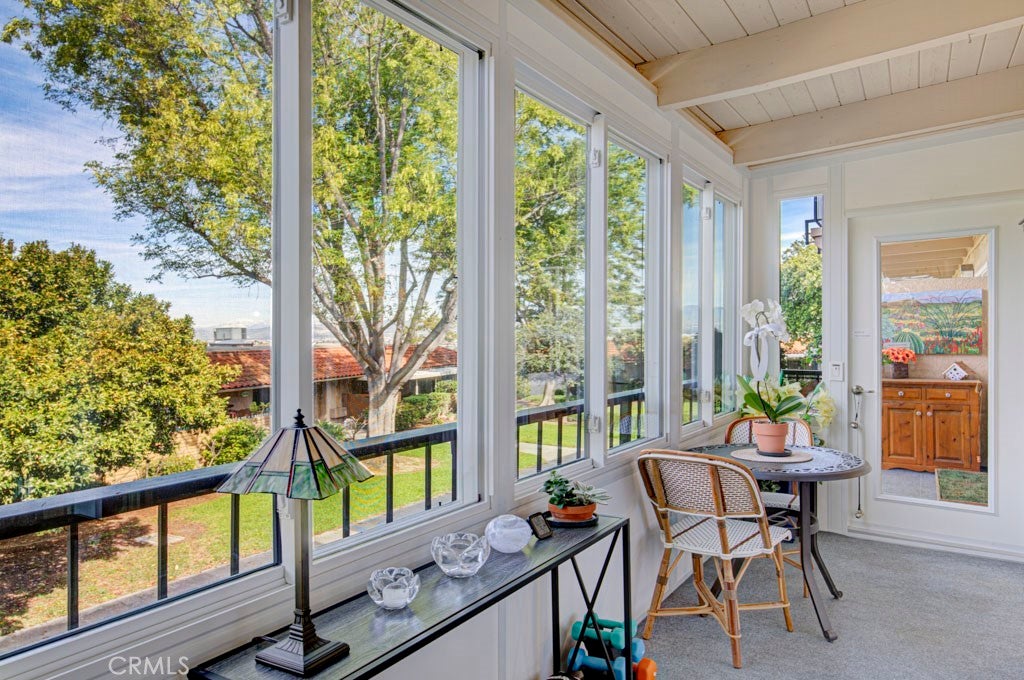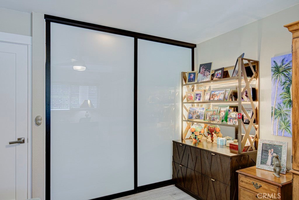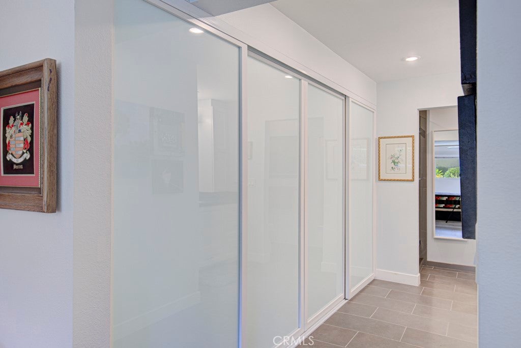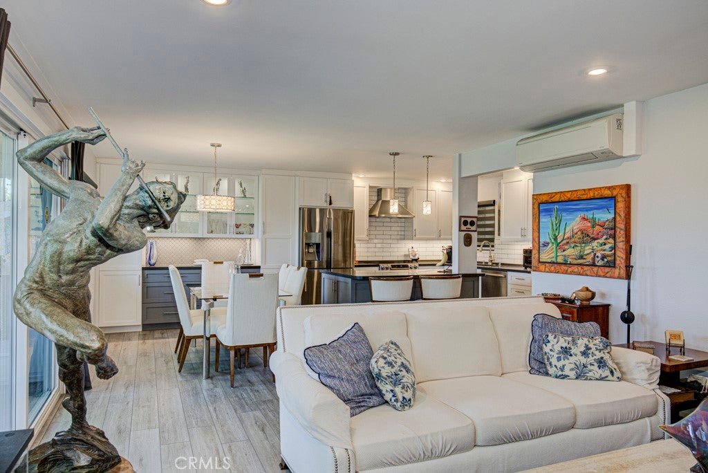GREAT NEW PRICE! Exquisitely remodeled La Brisa residence in the highly sought-after 55+ community of Laguna Woods Village. This thoughtfully expanded home blends refined design, modern efficiency, and exceptional craftsmanship throughout. Step inside to soaring smooth ceilings raised to 8 feet, elegant recessed LED lighting with dimmers, and premium Cortec luxury vinyl flooring. The balcony sunroom has been largely enclosed to create additional interior living space, seamlessly enhancing the home’s open feel, while a dedicated outdoor portion remains—perfect for BBQs and relaxing amid tranquil tree-lined and distant mountain views. The designer kitchen is a true centerpiece, showcasing shaker cabinetry, quartz countertops, & a generous island with built-in microwave & wine refrigerator. High-end appliances include a Bosch dishwasher, induction range with exterior-vented chimney hood, and a Samsung four-door refrigerator featuring two convertible lower compartments that function as either refrigerator or freezer for ultimate flexibility. The dining area is enhanced by a custom built-in wall unit with accent lighting and abundant storage. Comfort and efficiency are paramount with dual-pane windows and slider, plus three Daikin split HVAC systems providing whisper-quiet climate control. Both bedrooms feature ceiling fans with remotes and custom closet doors, while the bedroom closets & spacious laundry closet are beautifully appointed with Classy Closet organizers for elevated functionality. Spa-inspired bathrooms offer shaker vanities, quartz countertops, tiled flooring, and custom-tiled showers with frameless glass enclosures. Additional highlights include a stacked in-home laundry area with storage, two mounted TVs wired for cable, and a newly upgraded electrical panel. Ideally situated in the desirable Gates 7–10 area with wide streets and a prime location. Residents enjoy world-class amenities including 5 swimming pools, 7 clubhouses, 3 fitness centers, two golf courses (27-hole championship and 9-hole par-3), over 250 clubs, performing arts theater, tennis and pickleball courts, lawn bowling, equestrian trails, fare-free transportation, & 24-hour security. All just minutes from Laguna Beach, premier shopping, fine dining, medical facilities, and easy access to the 5, 405 & 73 Freeways. A rare opportunity to own a turnkey, design-forward home in one of Southern California’s most prestigious active adult communities.
