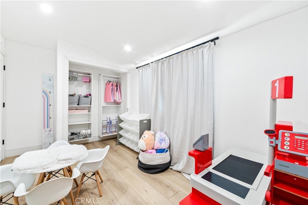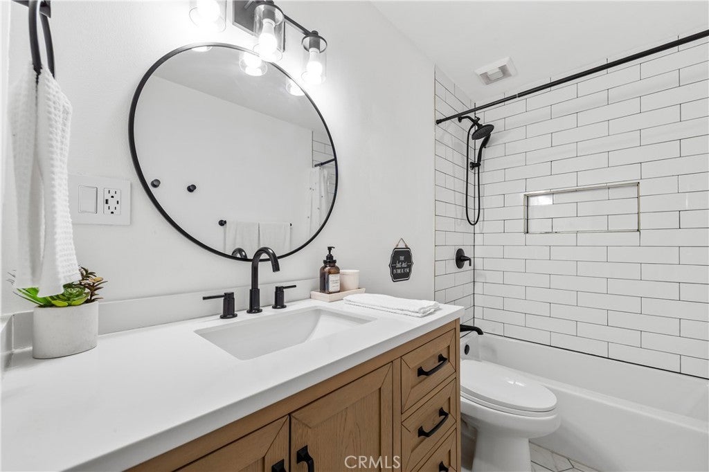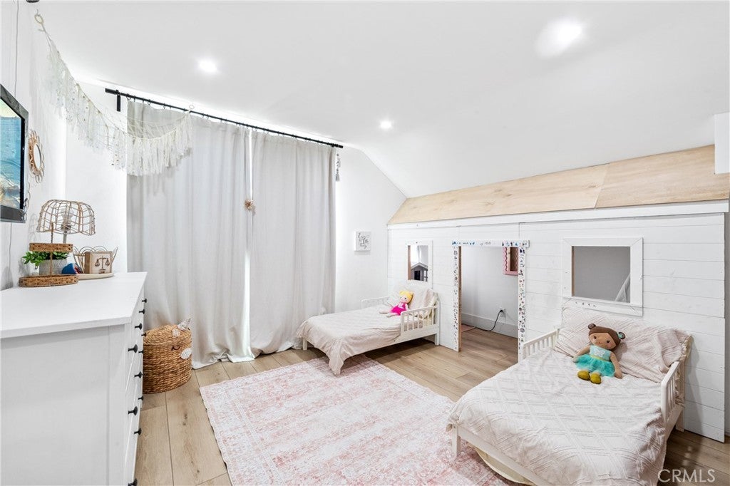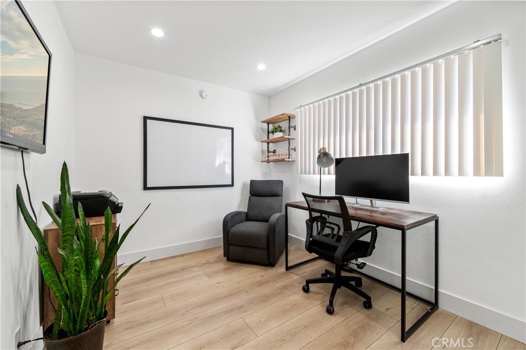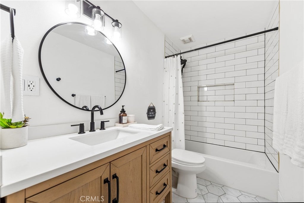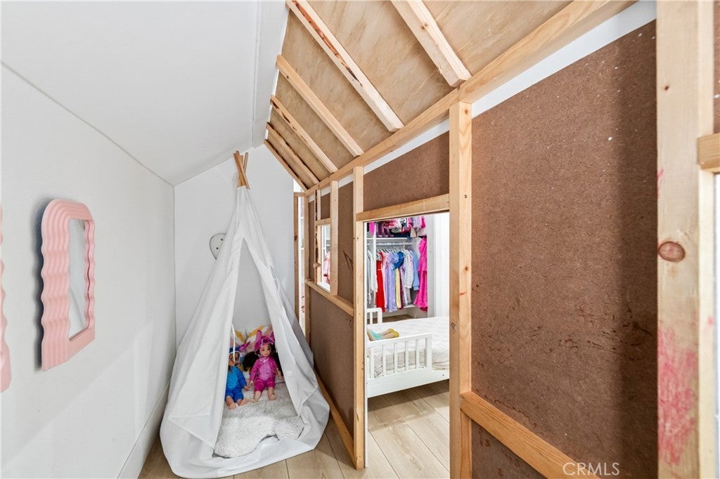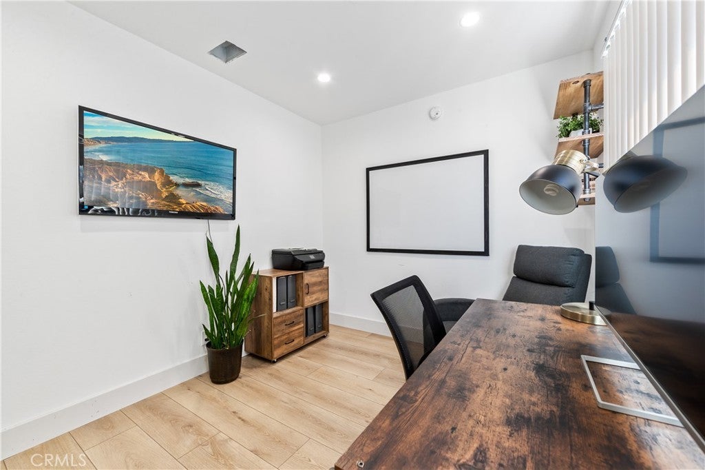 EXPANDED 5-BEDROOM HOME WITH EXTENSIVE UPGRADES AND KITCHEN READY FOR COMPLETION. Offering approximately 2,515 square feet of living space in West Garden Grove, this expanded residence features a significantly enlarged kitchen footprint and expanded secondary living room/game room, creating a much more functional layout than the original floor plan. The home is partially completed and partially unfinished. The kitchen and living area has been taken down to the studs and is ready for completion by the next owner. Cabinetry and flooring materials are included in the sale, and renderings are available to illustrate the intended design. Buyer to complete kitchen improvements. The downstairs full bathroom has been fully remodeled with hexagon tile flooring, white subway tile tub surround, updated white oak-style vanity with quartz countertops, black fixtures, updated lighting, and mirror. Two downstairs bedrooms and the expanded game room feature CoreTec Ravenswood Oak luxury vinyl plank flooring, which continues up the staircase and throughout the entire upstairs level for a cohesive finish. All upstairs bedrooms include recessed lighting, updated flooring, and new baseboards. The spacious primary suite also features an updated fireplace with porcelain tile surround, quartz hearth, and wood mantle. The primary bathroom showcases a dual white oak-style vanity with quartz counters, hexagon tile flooring, white subway tile shower walls, hexagon tile shower floor, built-in bench seating, large niche, three showerheads, and LED mirror. Additional features include an updated laundry room with tongue-and-groove walls, hexagon tile flooring, custom wood folding counter, ample shelving, and direct access to the garage. Large driveway with RV parking. Property is being sold in its present condition. Due to the unfinished kitchen, sale may be best suited for cash or renovation financing.