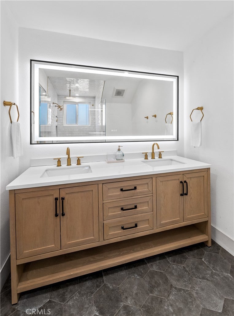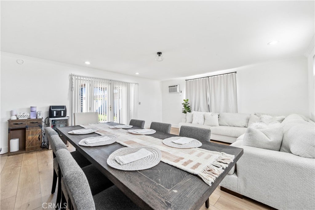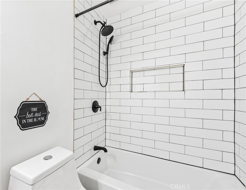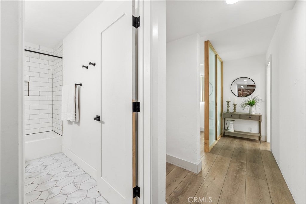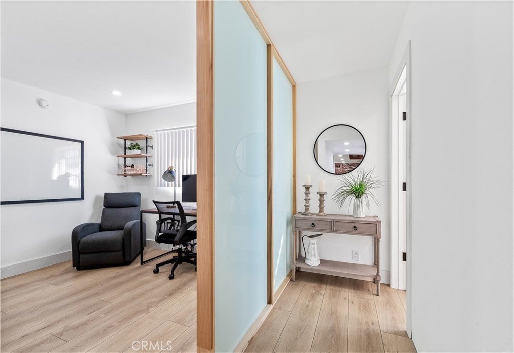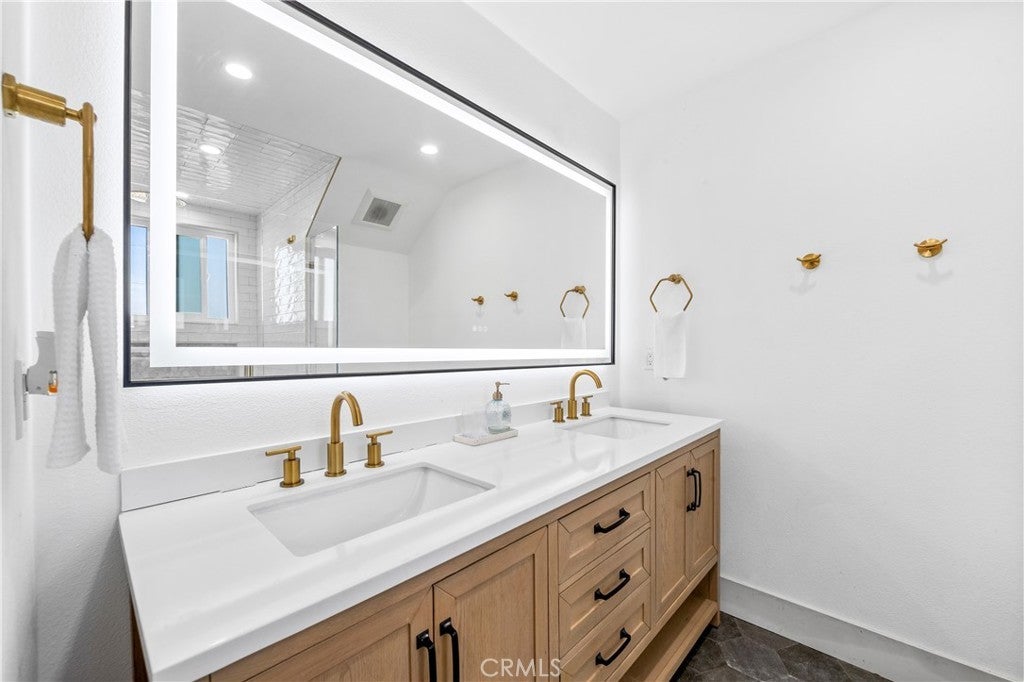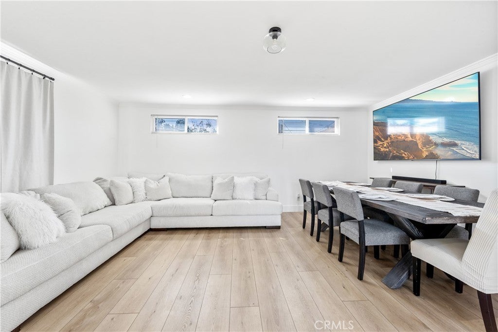EXPANDED 5-BEDROOM HOME WITH EXTENSIVE UPGRADES AND KITCHEN READY FOR COMPLETION. Offering approximately 2,515 square feet of living space in West Garden Grove, this expanded residence features a significantly enlarged kitchen footprint and expanded secondary living room/game room, creating a much more functional layout than the original floor plan. The home is partially completed and partially unfinished. The kitchen and living area has been taken down to the studs and is ready for completion by the next owner. Cabinetry and flooring materials are included in the sale, and renderings are available to illustrate the intended design. Buyer to complete kitchen improvements. The downstairs full bathroom has been fully remodeled with hexagon tile flooring, white subway tile tub surround, updated white oak-style vanity with quartz countertops, black fixtures, updated lighting, and mirror. Two downstairs bedrooms and the expanded game room feature CoreTec Ravenswood Oak luxury vinyl plank flooring, which continues up the staircase and throughout the entire upstairs level for a cohesive finish. All upstairs bedrooms include recessed lighting, updated flooring, and new baseboards. The spacious primary suite also features an updated fireplace with porcelain tile surround, quartz hearth, and wood mantle. The primary bathroom showcases a dual white oak-style vanity with quartz counters, hexagon tile flooring, white subway tile shower walls, hexagon tile shower floor, built-in bench seating, large niche, three showerheads, and LED mirror. Additional features include an updated laundry room with tongue-and-groove walls, hexagon tile flooring, custom wood folding counter, ample shelving, and direct access to the garage. Large driveway with RV parking. Property is being sold in its present condition. Due to the unfinished kitchen, sale may be best suited for cash or renovation financing.
