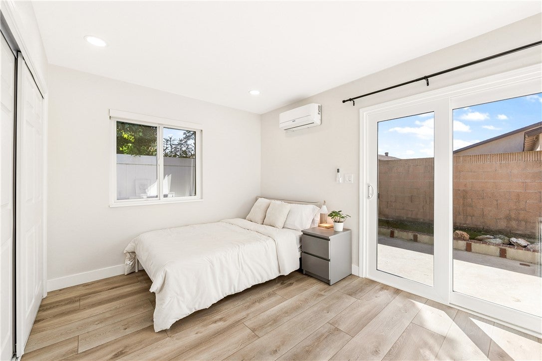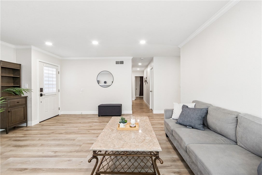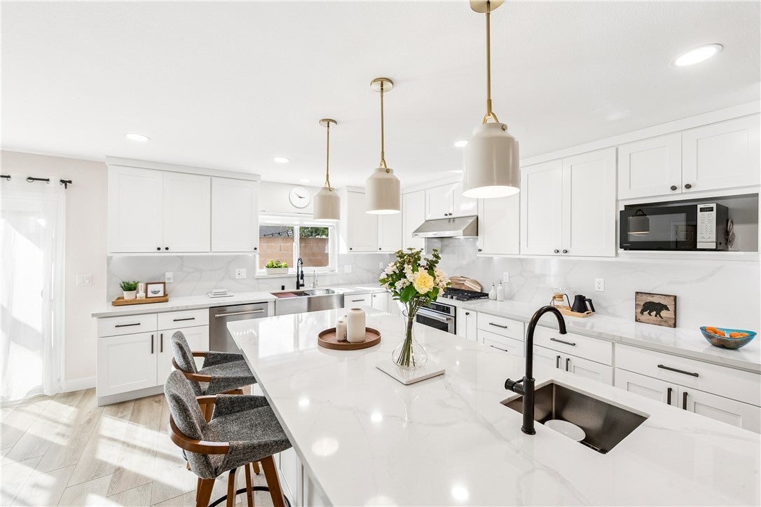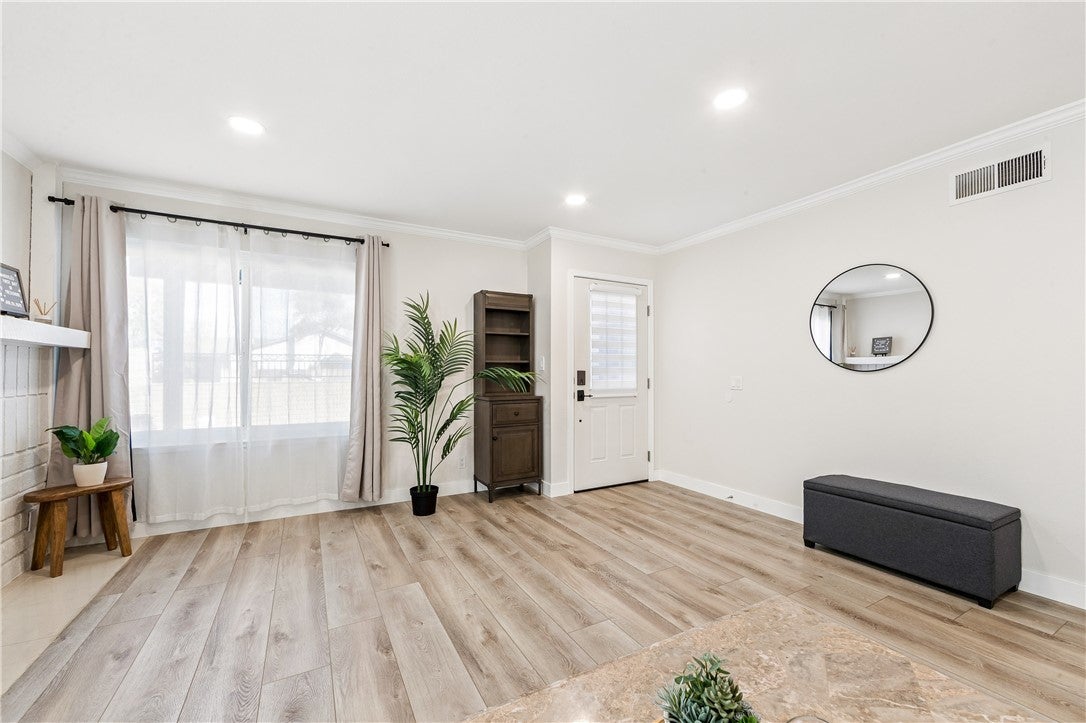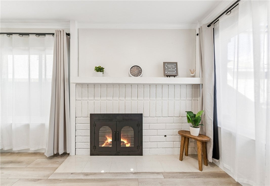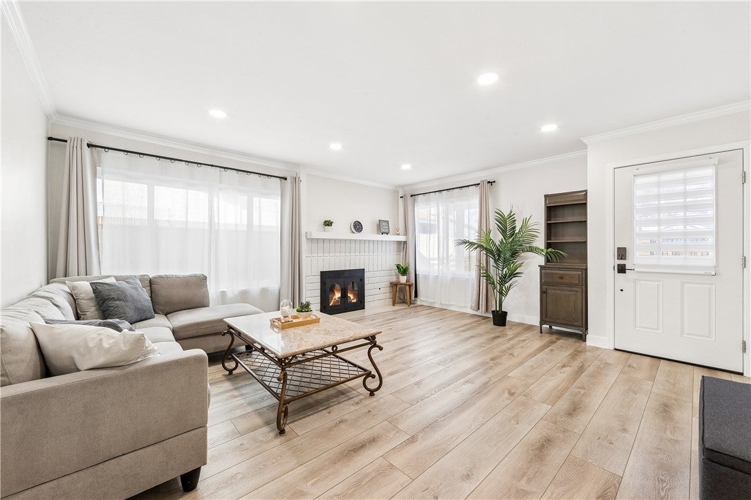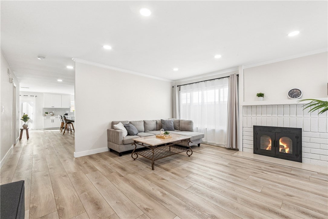 BEAUTIFULLY UPGRADED SINGLE-STORY HOME WITH GATED COURTYARD, DESIGNER KITCHEN & FLEXIBLE 4-BEDROOM + OFFICE FLOOR PLAN. Welcome to this beautifully upgraded single-story residence offering a perfect blend of modern style, comfort, and functionality. From the moment you arrive, the home makes a striking first impression with fresh white exterior paint accented by bold black trim, low-maintenance rock landscaping, and a private gated courtyard that creates a charming and welcoming entry. Step inside to an inviting family room filled with natural light from multiple windows and enhanced with elegant crown molding. The space is anchored by a cozy brick fireplace featuring black fireplace doors, a tile hearth, and a classic wood mantle—creating the perfect setting for relaxing or entertaining. The home flows seamlessly into the dining area and an expanded gourmet kitchen that serves as the centerpiece of the home. Designed for both everyday living and entertaining, the kitchen offers an impressive amount of cabinetry and counter space with white shaker cabinets, quartz countertops, a stainless steel farmhouse sink, and slab quartz backsplash. A stunning full-slab 8-foot center island becomes the focal point of the room, complete with custom pendant lighting, a secondary prep sink, and a built-in wine refrigerator. Thoughtfully designed storage includes oversized pull-out drawers with soft-close hardware, a dual spice rack, Lazy Susan corner cabinet, and additional rollout drawers. LED under-cabinet lighting enhances both style and functionality. The flexible layout includes four spacious bedrooms, three full bathrooms, and a dedicated office, providing versatility for remote work, guests, or multigenerational living. Bathrooms feature updated vanities and modern finishes. Additional upgrades include recessed lighting throughout, three mini-split air conditioning systems for customizable comfort, and all windows upgraded to dual-pane along with two updated sliding doors that bring in abundant natural light and improved energy efficiency. This thoughtfully upgraded single-story home combines stylish finishes, a functional floor plan, and numerous modern improvements—creating a move-in-ready property ideal for comfortable living and effortless entertaining.