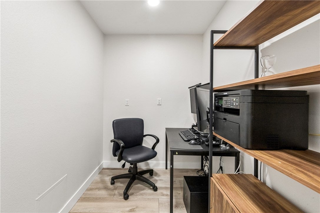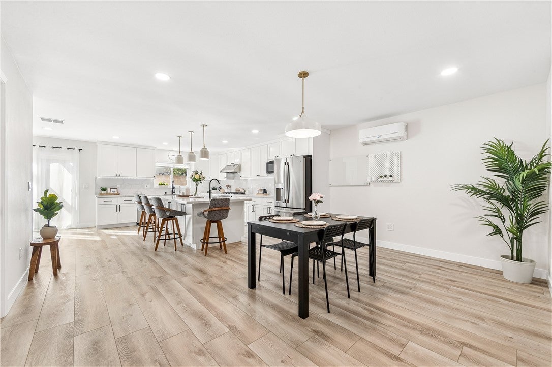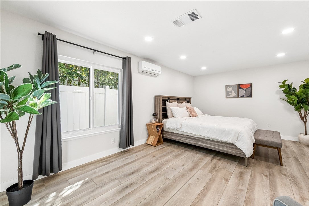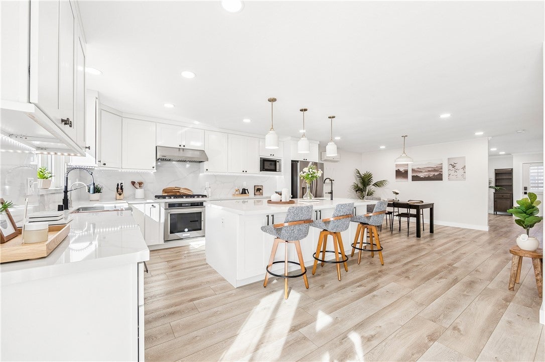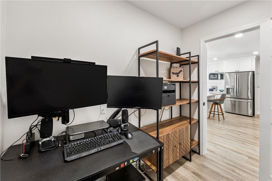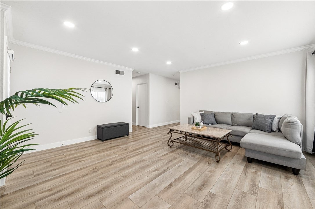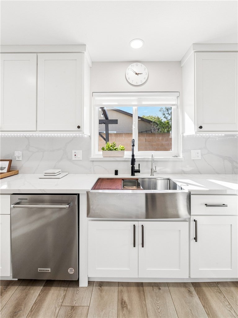 BEAUTIFULLY UPGRADED SINGLE-STORY HOME WITH GATED COURTYARD, DESIGNER KITCHEN & FLEXIBLE 4-BEDROOM + OFFICE FLOOR PLAN. Welcome to this beautifully upgraded single-story residence offering a perfect blend of modern style, comfort, and functionality. From the moment you arrive, the home makes a striking first impression with fresh white exterior paint accented by bold black trim, low-maintenance rock landscaping, and a private gated courtyard that creates a charming and welcoming entry. Step inside to an inviting family room filled with natural light from multiple windows and enhanced with elegant crown molding. The space is anchored by a cozy brick fireplace featuring black fireplace doors, a tile hearth, and a classic wood mantle—creating the perfect setting for relaxing or entertaining. The home flows seamlessly into the dining area and an expanded gourmet kitchen that serves as the centerpiece of the home. Designed for both everyday living and entertaining, the kitchen offers an impressive amount of cabinetry and counter space with white shaker cabinets, quartz countertops, a stainless steel farmhouse sink, and slab quartz backsplash. A stunning full-slab 8-foot center island becomes the focal point of the room, complete with custom pendant lighting, a secondary prep sink, and a built-in wine refrigerator. Thoughtfully designed storage includes oversized pull-out drawers with soft-close hardware, a dual spice rack, Lazy Susan corner cabinet, and additional rollout drawers. LED under-cabinet lighting enhances both style and functionality. The flexible layout includes four spacious bedrooms, three full bathrooms, and a dedicated office, providing versatility for remote work, guests, or multigenerational living. Bathrooms feature updated vanities and modern finishes. Additional upgrades include recessed lighting throughout, three mini-split air conditioning systems for customizable comfort, and all windows upgraded to dual-pane along with two updated sliding doors that bring in abundant natural light and improved energy efficiency. This thoughtfully upgraded single-story home combines stylish finishes, a functional floor plan, and numerous modern improvements—creating a move-in-ready property ideal for comfortable living and effortless entertaining.