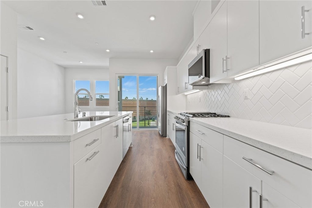 Located within the desirable, gated 100 West community built by renowned builder Toll Brothers is a four story home that boasts modern designs. First level consists of a downstairs bedroom and bathroom. Main level holds the open concept living area. Kitchen is complete with gorgeous white cabinetry and center island. Two patios on the main level allow for an enhanced indoor/outdoor flow. Third level features the luxurious master suite as well as remaining bedrooms. Windows throughout allow for sunlight to pour in, bringing in a plethora of natural lighting. Residing on the upmost level is a roof top deck that is perfect for entertaining guests. Additional highlights include two car garage, gated community, and many more. Centrally located within the heart of Orange County, this home is minutes away from Disneyland, Angels Stadium, Honda Center, shopping, and dining. This home allows for the lively Anaheim lifestyle, all while offering both comfort and convenience.