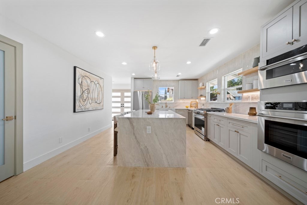 Welcome to this one-of-a-kind masterpiece. This historic yet beautifully upgraded residence blends timeless Los Angeles charm on the exterior with a modern, elevated lifestyle inside. Located in the highly sought-after West Adams pocket, this architectural gem seamlessly combines preserved character with stunning contemporary updates. Offering 3,559 sq ft of thoughtfully designed living space on a 6,037 sq ft lot, this exceptional home features 6 bedrooms, 4 bathrooms, and refined finishes throughout. A grand front porch showcasing beautifully restored original wood flooring sets the tone and welcomes you into an impressive entry space complete with a full bathroom, coat closet, and a stylish wine and cocktail bar — perfect for hosting from the moment guests arrive. The main level is designed for elevated entertaining and effortless flow. The living room transitions seamlessly into an expansive dining area and a show-stopping chef’s kitchen. Anchored by a waterfall-edge island with seating for four, the kitchen is appointed with premium appliances, dual sinks, a spacious walk-in pantry, and elegant ambient lighting throughout. A secondary full bathroom toward the rear of the home provides convenient access for guests enjoying backyard gatherings. Upstairs, all six bedrooms are thoughtfully positioned for privacy and comfort. The primary suite serves as a true sanctuary, featuring a walk-in closet and a beautifully appointed en-suite bathroom. One of the bedrooms, surrounded by windows on multiple walls, offers a sunroom-like feel — ideal for an art studio, creative retreat, or inspiring workspace. The second floor also includes an expansive hallway with a built-in wooden bench, creating a cozy reading nook or lounge area. Additional highlights include updated lighting throughout, dual A/C units (one for each floor), and top-of-the-line finishes, vanities, and fixtures that elevate the home’s overall design and functionality. Ideally positioned between Downtown Los Angeles and the Westside in the Adams-Normandie neighborhood, the home is just minutes from the Expo Line, USC, Crypto.com Arena, BMO Stadium, the Los Angeles Memorial Coliseum, and the vibrant shops and new restaurants of West Adams. A rare opportunity to own historic character, modern luxury, and an unbeatable central location — all in one exceptional property.