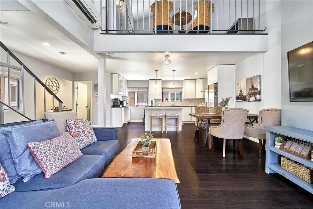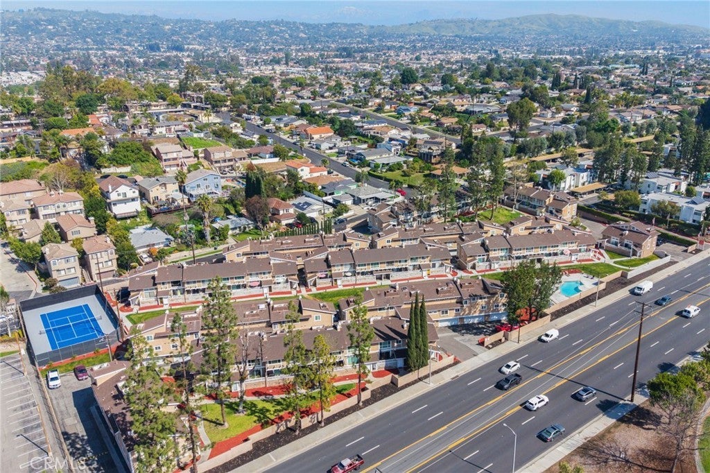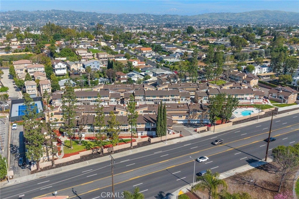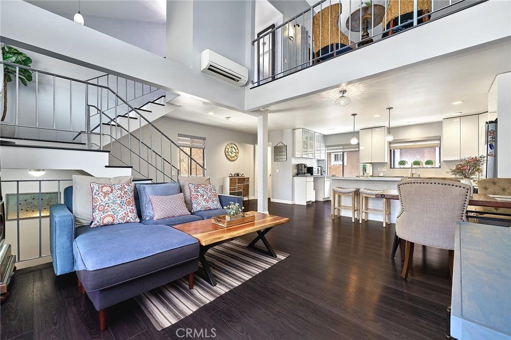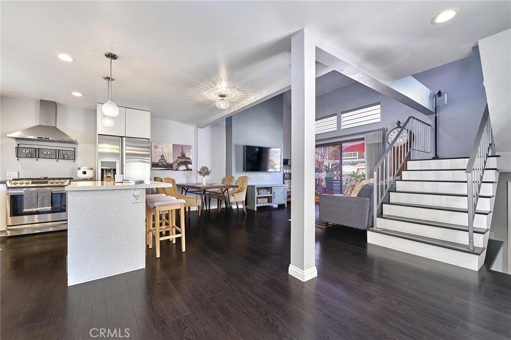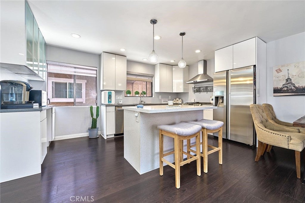 Modern comfort meets everyday convenience in this beautifully upgraded, end-unit condo nestled in one of La Habra’s most desirable communities. With only one shared wall, this home offers added privacy and a light, airy feel throughout. Step inside to discover soaring ceilings and rich dark laminate flooring that create a warm and inviting atmosphere from the moment you enter. The open-concept layout flows seamlessly into a fully renovated kitchen featuring sleek European-style custom cabinetry, including a hidden lazy Susan for added storage and functionality. The spacious island doubles as a breakfast bar and is topped with speckled quartz countertops, complemented by a full suite of stainless-steel appliances including a cooktop, oven, refrigerator, and dishwasher—making this space both stylish and practical for everyday living or entertaining. Upstairs, the spacious primary suite provides a peaceful retreat, complete with an adjoining loft area ideal for a home office, reading nook, or personal gym. The en-suite bathroom has been tastefully remodeled with a floating dual-sink vanity and a luxurious jet shower. The guest bathroom mirrors the same modern finishes with a matching floating vanity. Throughout the home, updated window coverings—including sleek zebra blinds—add a stylish finishing touch while allowing for flexible light control and privacy. For year-round comfort, energy-efficient mini split systems have been installed to cool the entire home with ease. Residents also enjoy access to community amenities, including a sparkling pool and spa—perfect for unwinding at the end of the day. Ideally located near Trader Joe’s, Sam’s Club, Walmart, and a wide variety of local dining and shopping options, this home combines modern living with unmatched convenience. Move-in ready and beautifully updated, this La Habra gem is ready to welcome you home.
