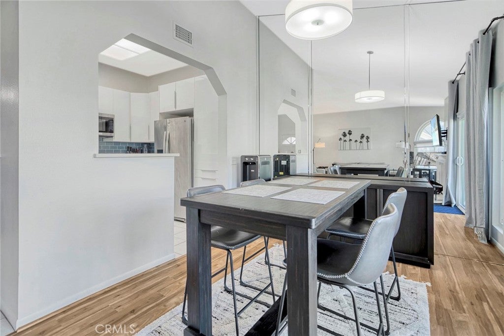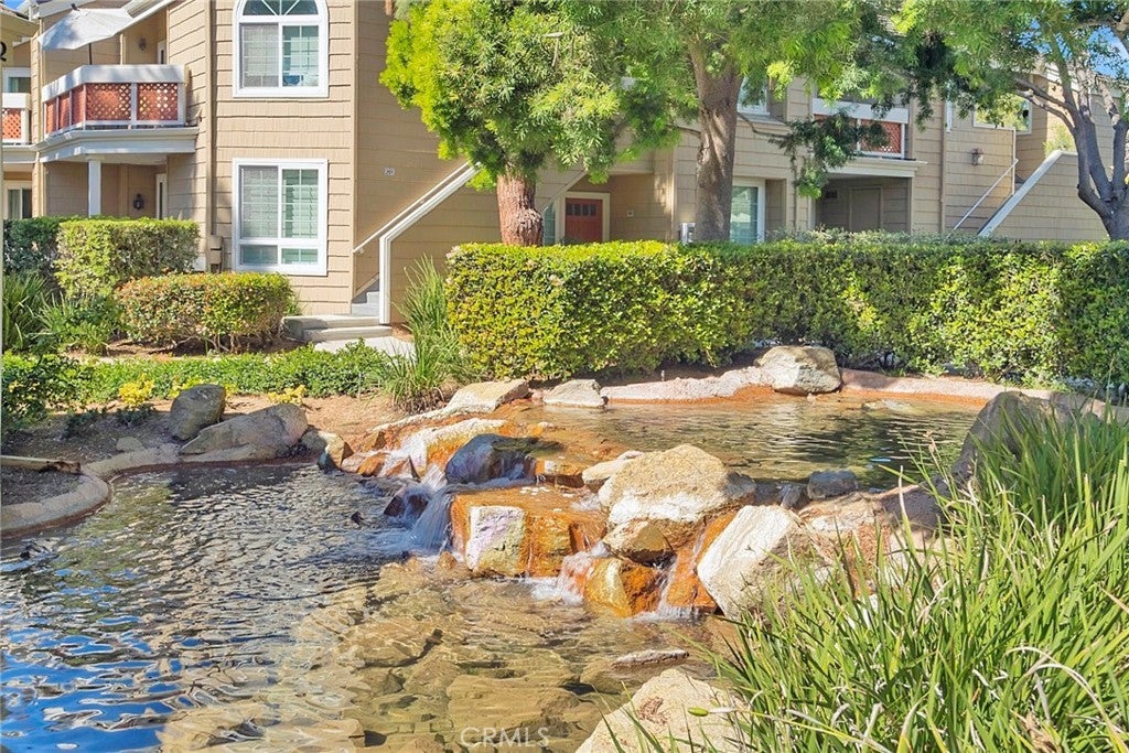 Welcome to this upper-level, 2-bedroom, end-unit condo, less than two miles from the beach! Vaulted ceilings create an airy, open feeling from the moment you step inside. The living room, complete with a fireplace and balcony, flows seamlessly into the dining area and updated kitchen. This unit features two bedrooms and two upgraded bathrooms. Another balcony is located off the primary bedroom, and a new AC unit was installed in 2024. You'll also benefit from two parking spaces: one garage and one assigned spot. This large, gated community offers three swimming pools, spas, BBQ areas, and clubhouses. Waterfalls and streams are found throughout the property, making this beachside complex a private paradise.