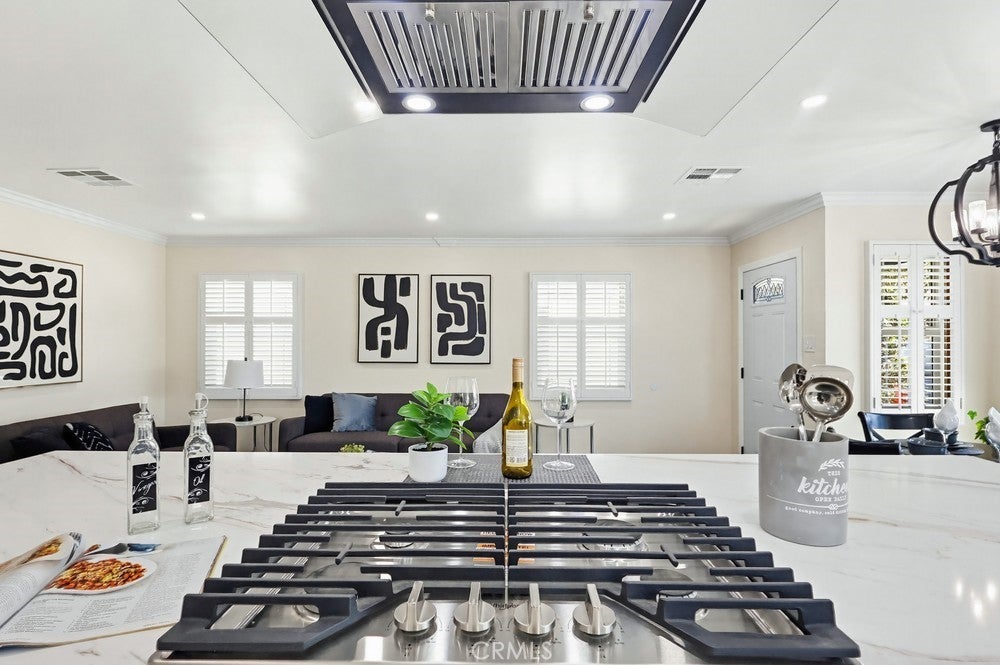 - Interior FeaturesBeamed Ceilings, Crown Molding, High Ceilings, Open Floorplan, Quartz Counters, Recessed Lighting, Primary Suite