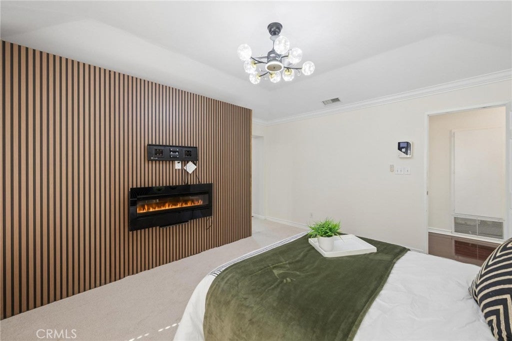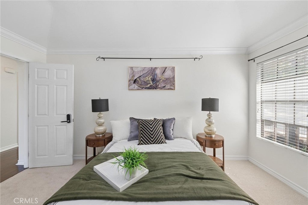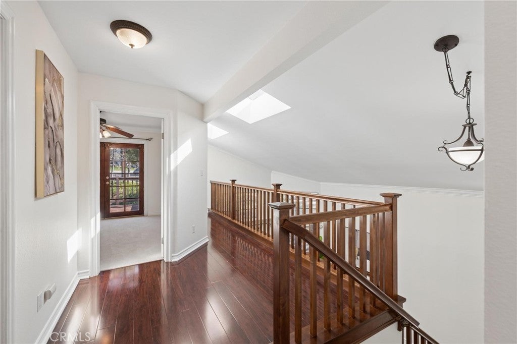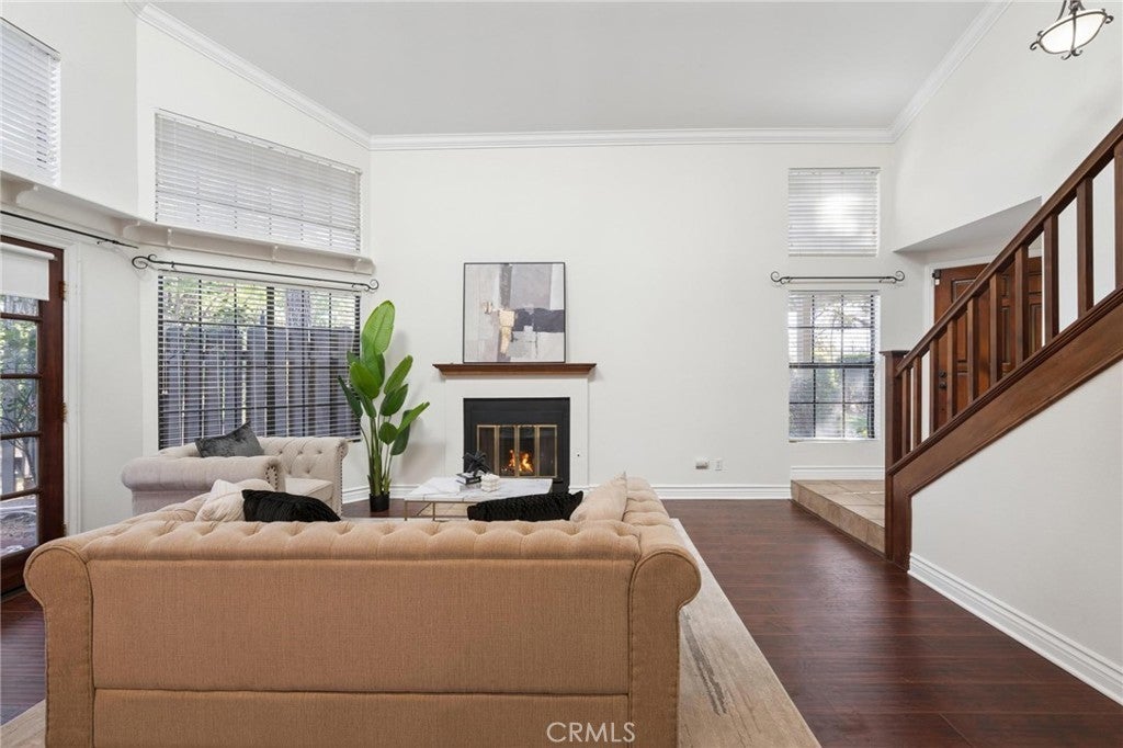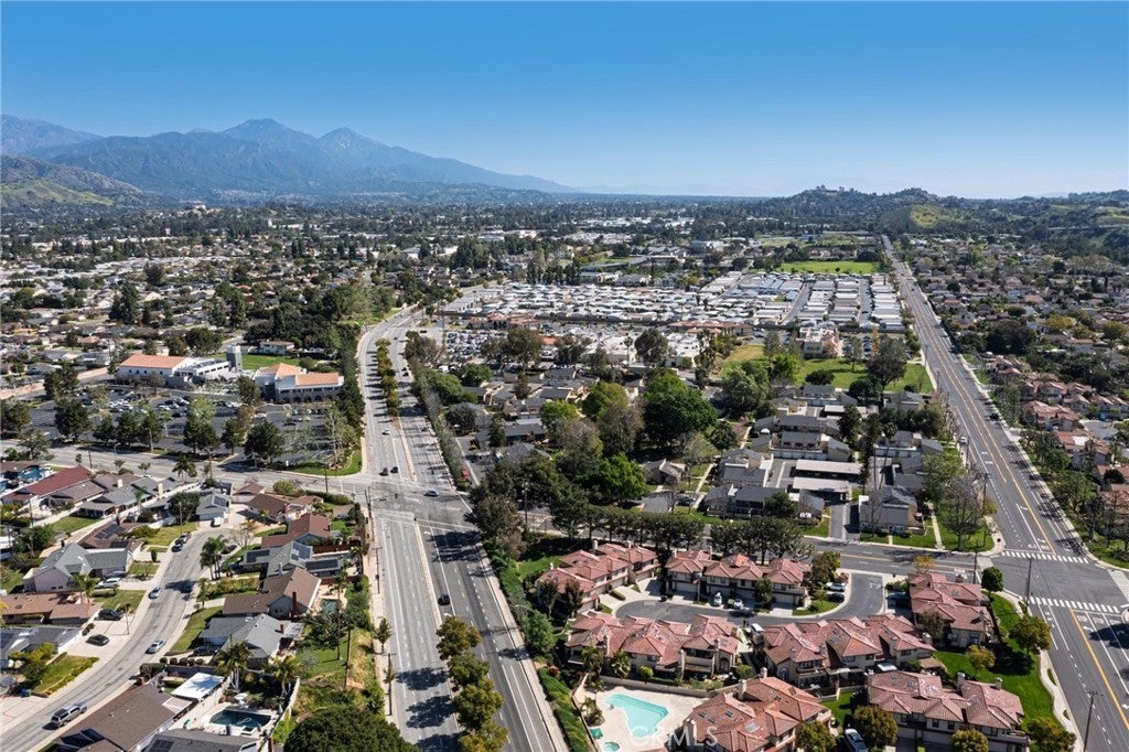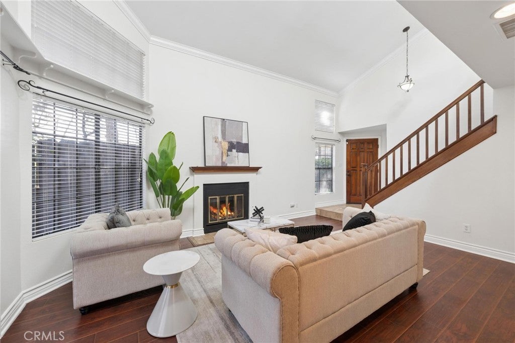 Upgraded interior, perfectly positioned at the end of a quiet cul-de-sac with only one neighbor next to you and none behind, a Tesla 240V charger, and the added luxury of 2 private balconies and a large patio. Step inside this desirable end-unit wrapped in new shell white designer paint, where soaring 18-foot vaulted ceilings, expansive windows & large skylights flood the home with natural light highlighting the brand-new exquisite laminate wood flooring, extending through the living area, kitchen, dining area, laundry space, and 1/2 bath, accompanied by refreshed crown molding & baseboards. A black metal-frame fireplace with glass doors accented by brass trim and a wood mantel adds a modern touch to the living space. Double French doors open to the large patio perfect for hosting gatherings, creating a BBQ area, or an outdoor lounge. Arched entryways lead you to the dining area and kitchen with recessed lighting, stainless-steel appliances, a dedicated laundry area and a 1/2 bath with direct access to the 2 car garage. Upstairs, the primary suite awaits with brand new light bisque carpet, a contemporary chandelier with sculptural glass globes, an electric fireplace set against a wood slat accent wall that conceals a hidden walk-in closet, and double French doors that open to your private balcony. The luxury spa-like bathroom showcases large-format tile flooring with subtle marble veining spread throughout the space. An enclosed shower with frameless tempered glass, brushed brass hardware, elegant marble-inspired wall panels, a rainfall showerhead paired with a handheld fixture, and a recessed niche provides space for bath essentials. The vanity features rich dark soft closing cabinetry complemented by brass pulls, topped with a white quartz countertop and brass fixtures, while a mirrored medicine cabinet with built-in lighting provides illumination & storage. Enhanced with a smart Cosvalve toilet which combines a heated seat, night light, foot sensor flush, power outage flushing, & automatic flushing. Mirroring the primary suite, the two additional bedrooms are appointed with new light bisque carpeting, while one bedroom offers the elevated luxury of a private balcony. Just a short drive to Costco, Glendora Public Market, Target, Walgreens, Fitness Plaza, 57/210 freeway and more. This exceptional location offers the perfect balance of convenience, privacy, serenity, & modern upgraded living with the middle school rated 8/10 and the high school rated 7/10.