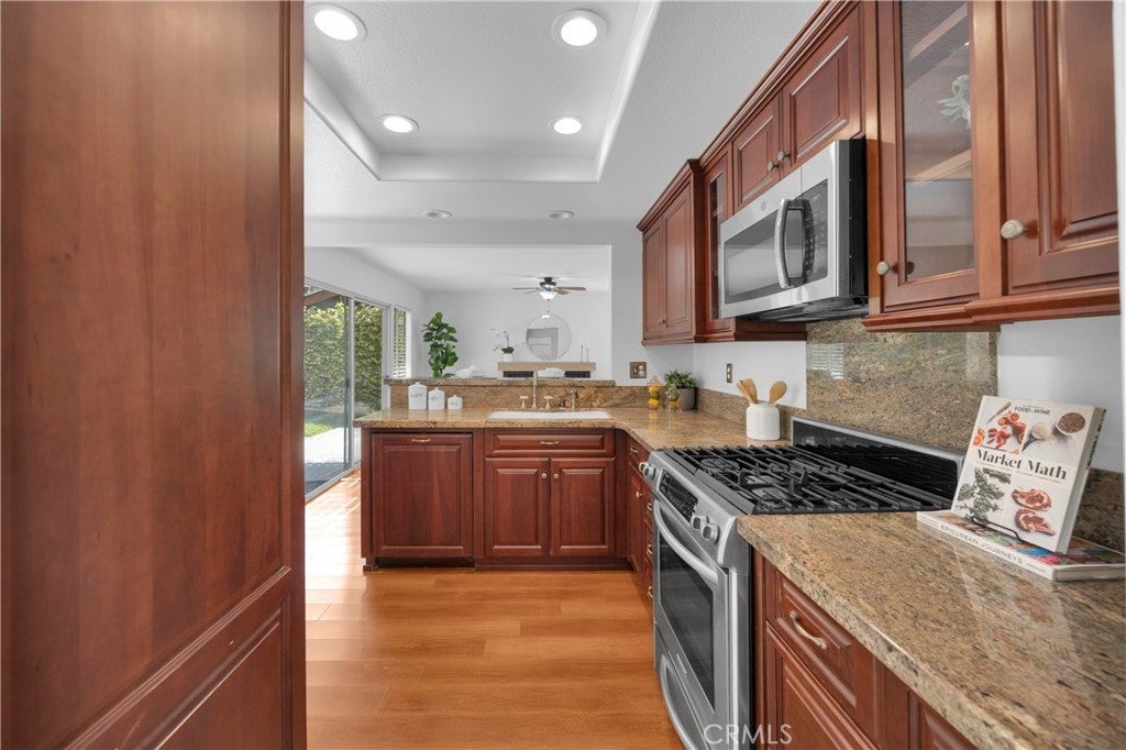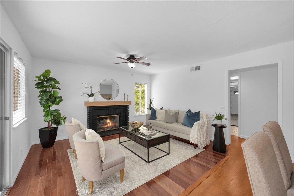 This beautiful two-story home sits on a prime corner lot and offers a perfect blend of comfort, style, and convenience. The property features a two-car garage, a spacious driveway, and professionally landscaped grounds that create wonderful curb appeal. Inside, high ceilings and an open floor plan provide a bright and airy feel, enhanced by large sliding doors that bring in abundant natural light. The home includes recessed lighting throughout, newly painted interiors, hardwood flooring, and a warm gas fireplace with a decorative mantle that anchors the living space. The kitchen is both functional and inviting, featuring cherry wood cabinetry, granite countertops, stainless steel appliances, a five-burner stove, an integrated dishwasher, and a farmhouse-style double sink. Bar seating and a charming breakfast nook provide casual dining options, while the adjacent dining and living areas create a comfortable space for everyday living and entertaining. The home offers three bedrooms and three bathrooms, including a spacious primary suite with a private balcony. The primary bathroom features double sinks, a tub, and generous closet space. Additional interior highlights include linen cabinets, a coat closet with extra storage, and a dedicated laundry room with additional cabinets. Throughout the home, numerous built-ins and cabinets provide exceptional storage. The custom landscaped backyard is designed for relaxation and entertaining, offering a spacious outdoor area with a covered patio, a raised custom stone patio, and a large custom hot tub complete with a waterfall feature. The property is part of an HOA community and is ideally located within walking distance to a top-rated school and a nearby park, while also being conveniently close to shopping centers and everyday amenities.