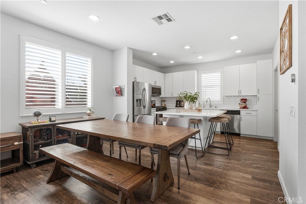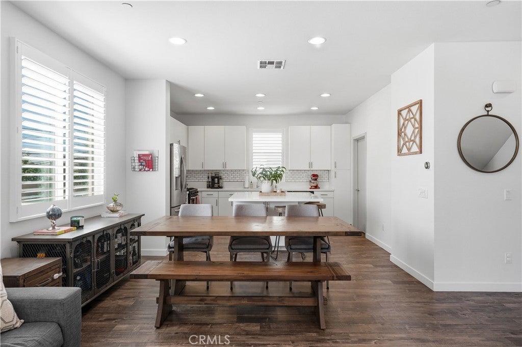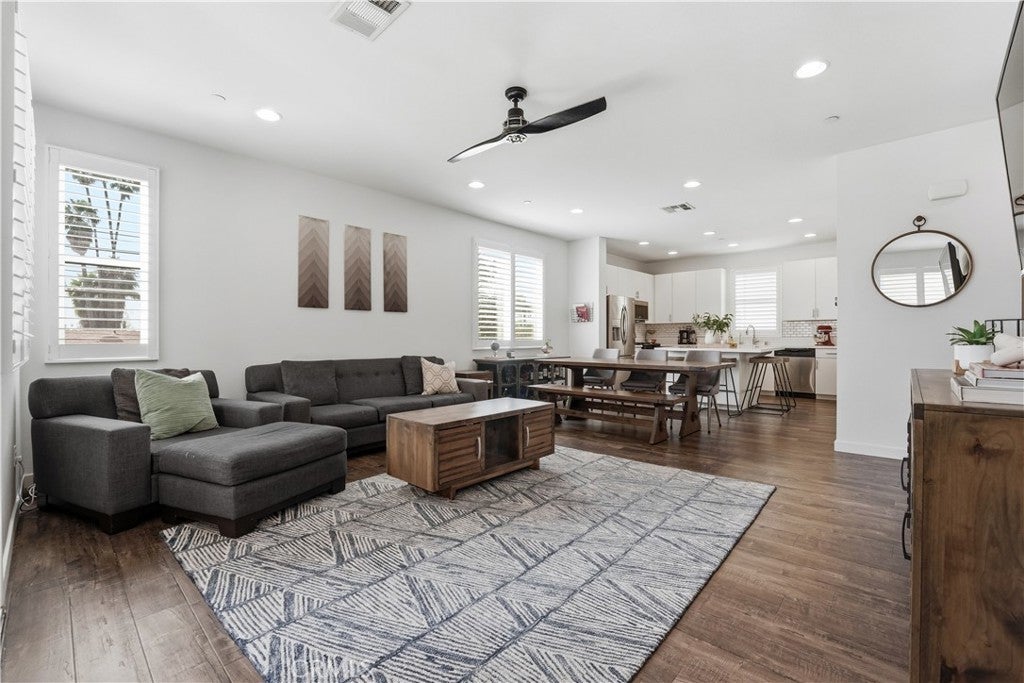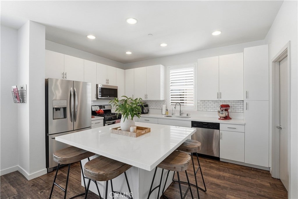 Tucked away off the main street with little to no street noise, this beautifully upgraded end-unit townhome is turnkey and filled with natural light. It features upgraded flooring and open concept family room and living room creating a warm and modern feel. The beautiful kitchen has stylish finishes, quartz counter tops, ample cabinetry, and a large island perfect for entertaining. There are stainless steel appliances including a beverage fridge in the island, and an individual laundry room as well. Upstairs, the spacious primary bedroom offers a private en-suite bathroom and walk-in closet. One of the home’s most exceptional features is the extremely rare three-car garage with direct access—an uncommon find for townhomes anywhere! Ideally located just minutes from the vibrant Anaheim Packing House and many of the dining, entertainment, and attractions that make Orange County such a desirable place to live. This home has a low HOA as well that includes trash, exterior building maintenance, and common areas.