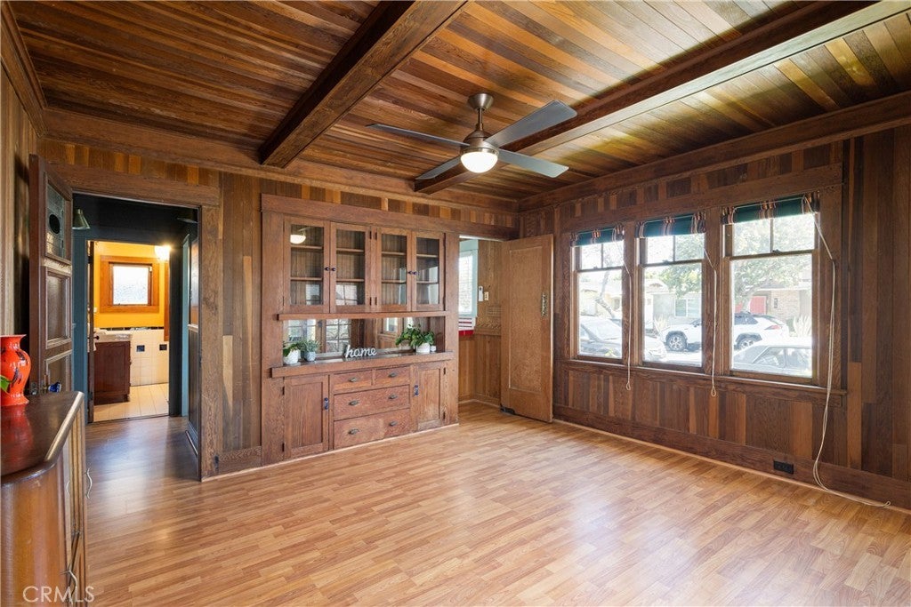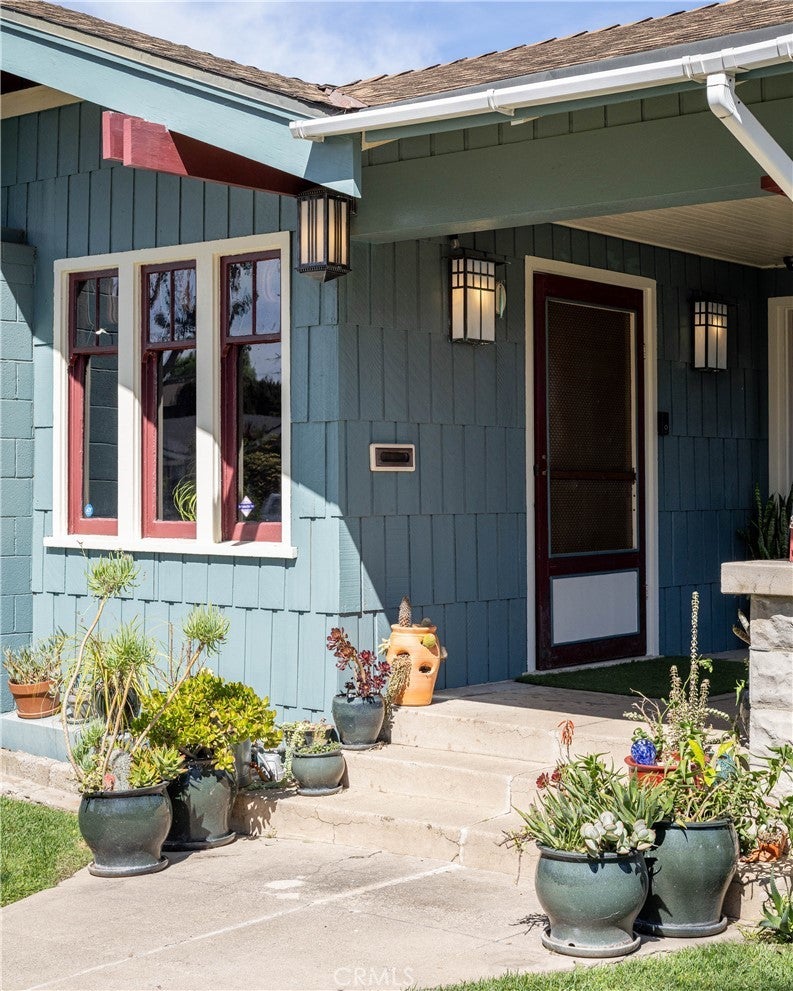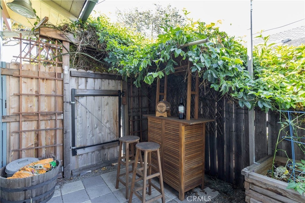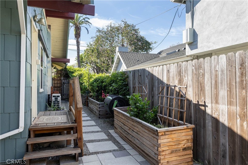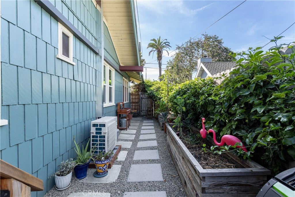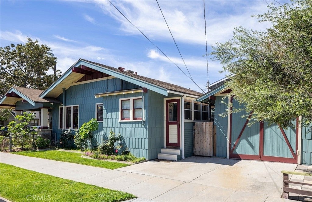 One of a Kind! Wood shingled Craftsman Bungalow located on a corner lot in the historic district of Rose Park South. This bungalow is a few blocks to Retro Row restaurants and shops, and a 10 minute walk to the beach. A large fenced front yard with grass and citrus trees welcome you as you walk up to the house. Fun fact: several cacti and succulents came from Leonardo DiCaprio’s property! There is a large front porch with the original oak front door to the living room, and French doors to the dining room. The open living room and dining room feature natural wood paneling on the walls and ceilings. There is a wood burning fireplace, custom Roman blinds, and ceiling fans. The dining room features the original buffet cabinetry, and a custom swinging door with stained glass to the hallway. There is an abundance of natural light from the original wood framed windows. The kitchen has vintage wood cabinetry, and tile countertops. There is an abundance of storage space in the kitchen. All appliances stay. The laundry room is adjacent, washer and dryer stay. There is a screened back porch/catio as well. There are 2 bedrooms total, with a larger closet in the hall between them. The first bedroom has a door to the living room. The 2nd bedroom features a custom desk area, closet cabinetry and a bookcase, along with a door to the backyard. There is a 3/4 bathroom with custom stained glass windows, tiled shower and a custom vanity. The house also has a split HVAC system and ceiling fans. *There is an ADT Alarm System, Ring doorbell, and cameras.* The bedrooms and living room have updated electrical outlets and Romex wiring. The hallway also has a pull-down attic ladder for additional attic storage access. The low-maintenance backyard has raised planters, a wooden bar, a concrete patio, and a storage shed. There is a large 1 car garage that was rebuilt with plenty of storage, and a small driveway in front of it. The front side yard has beautiful roses and 2 fig trees. This is your chance to own a piece of history near Retro Row!
