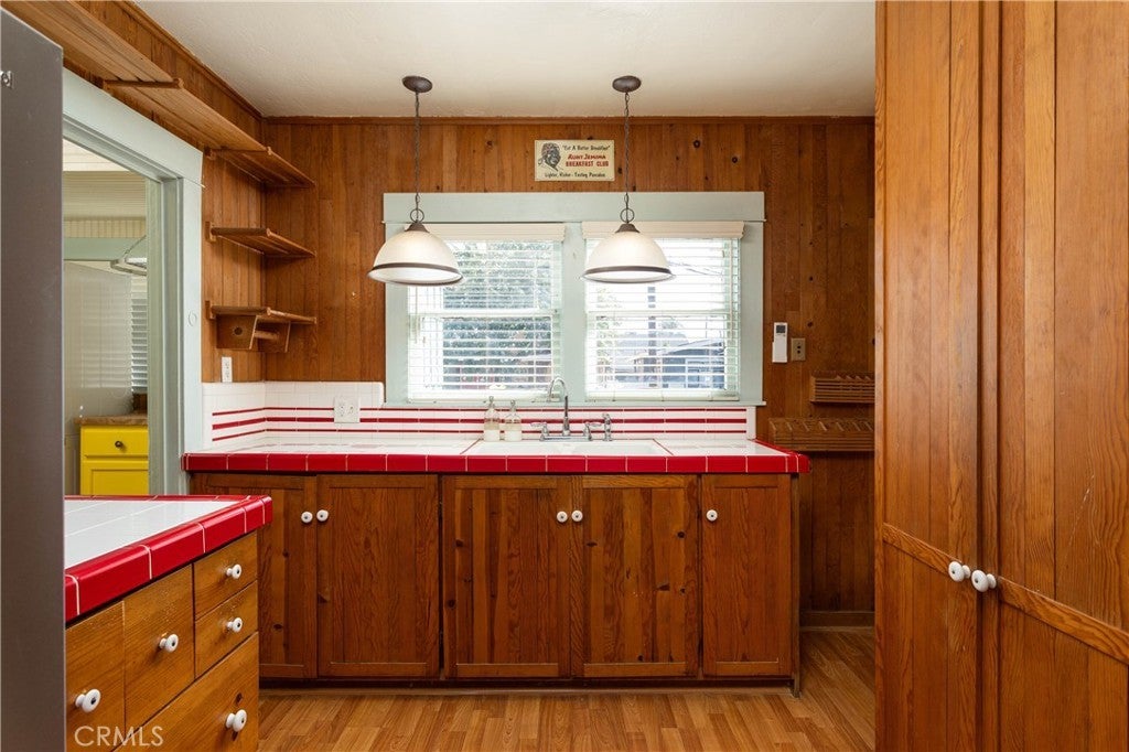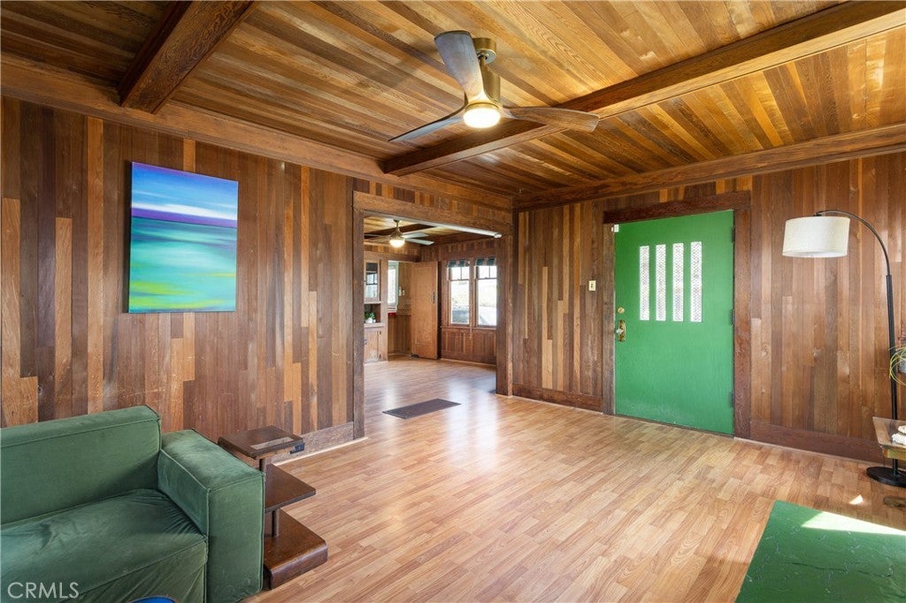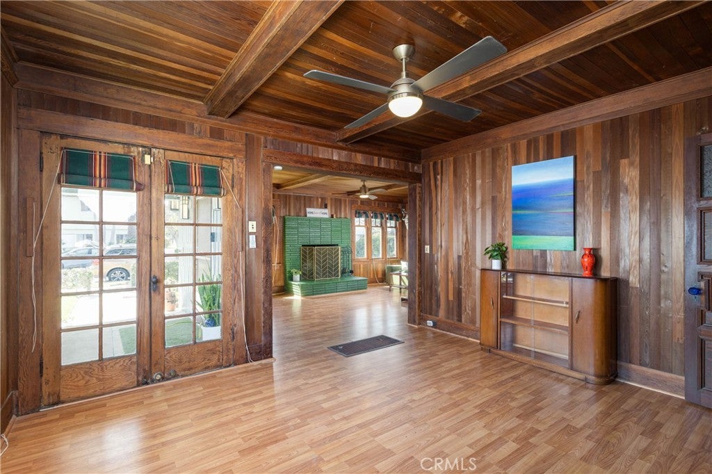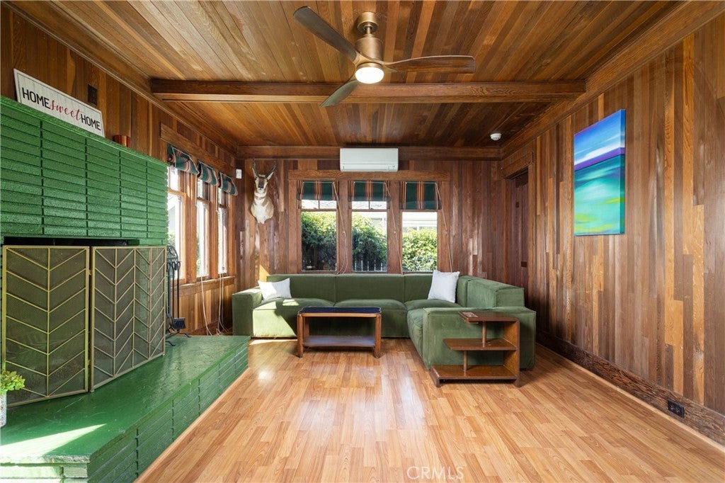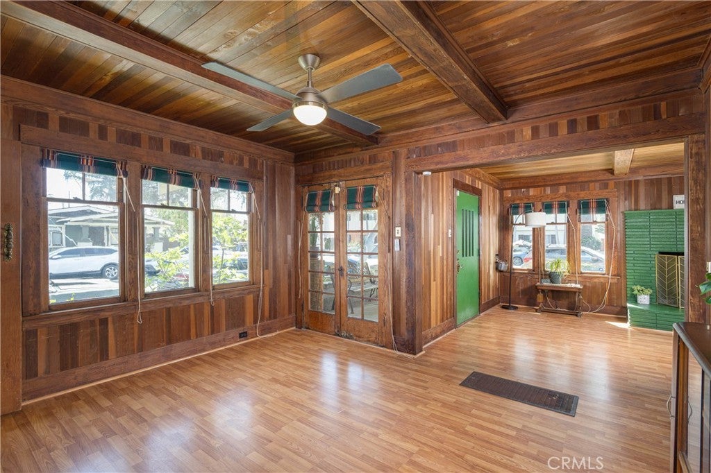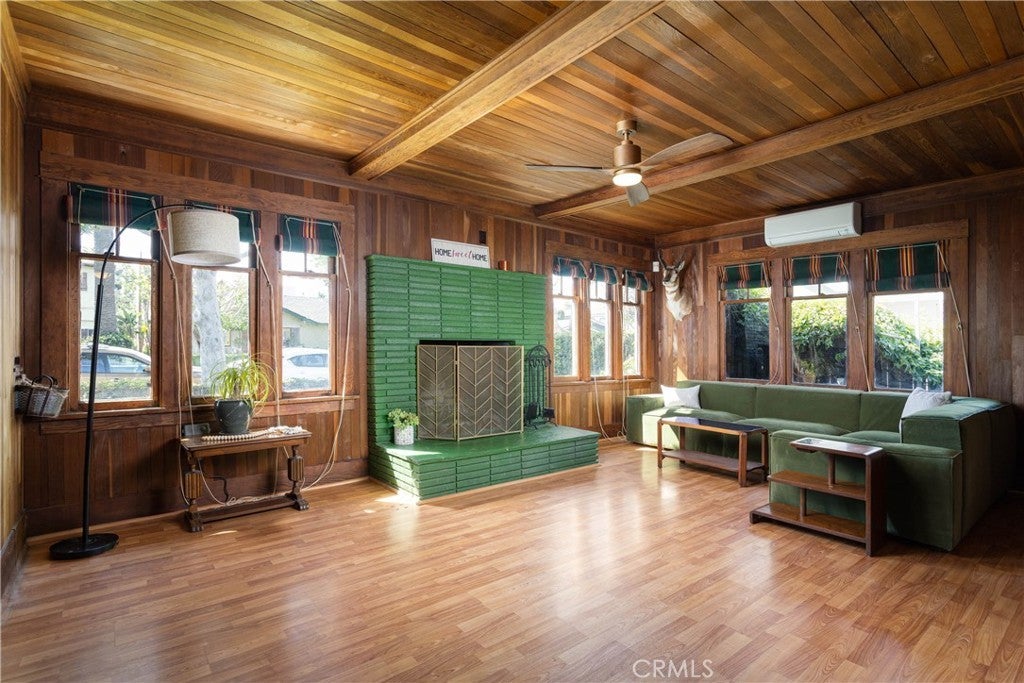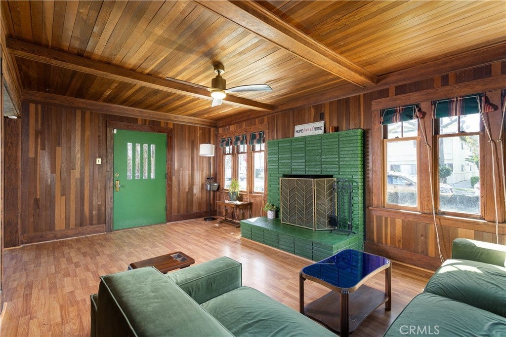 One of a Kind! Wood shingled Craftsman Bungalow located on a corner lot in the historic district of Rose Park South. This bungalow is a few blocks to Retro Row restaurants and shops, and a 10 minute walk to the beach. A large fenced front yard with grass and citrus trees welcome you as you walk up to the house. Fun fact: several cacti and succulents came from Leonardo DiCaprio’s property! There is a large front porch with the original oak front door to the living room, and French doors to the dining room. The open living room and dining room feature natural wood paneling on the walls and ceilings. There is a wood burning fireplace, custom Roman blinds, and ceiling fans. The dining room features the original buffet cabinetry, and a custom swinging door with stained glass to the hallway. There is an abundance of natural light from the original wood framed windows. The kitchen has vintage wood cabinetry, and tile countertops. There is an abundance of storage space in the kitchen. All appliances stay. The laundry room is adjacent, washer and dryer stay. There is a screened back porch/catio as well. There are 2 bedrooms total, with a larger closet in the hall between them. The first bedroom has a door to the living room. The 2nd bedroom features a custom desk area, closet cabinetry and a bookcase, along with a door to the backyard. There is a 3/4 bathroom with custom stained glass windows, tiled shower and a custom vanity. The house also has a split HVAC system and ceiling fans. *There is an ADT Alarm System, Ring doorbell, and cameras.* The bedrooms and living room have updated electrical outlets and Romex wiring. The hallway also has a pull-down attic ladder for additional attic storage access. The low-maintenance backyard has raised planters, a wooden bar, a concrete patio, and a storage shed. There is a large 1 car garage that was rebuilt with plenty of storage, and a small driveway in front of it. The front side yard has beautiful roses and 2 fig trees. This is your chance to own a piece of history near Retro Row!