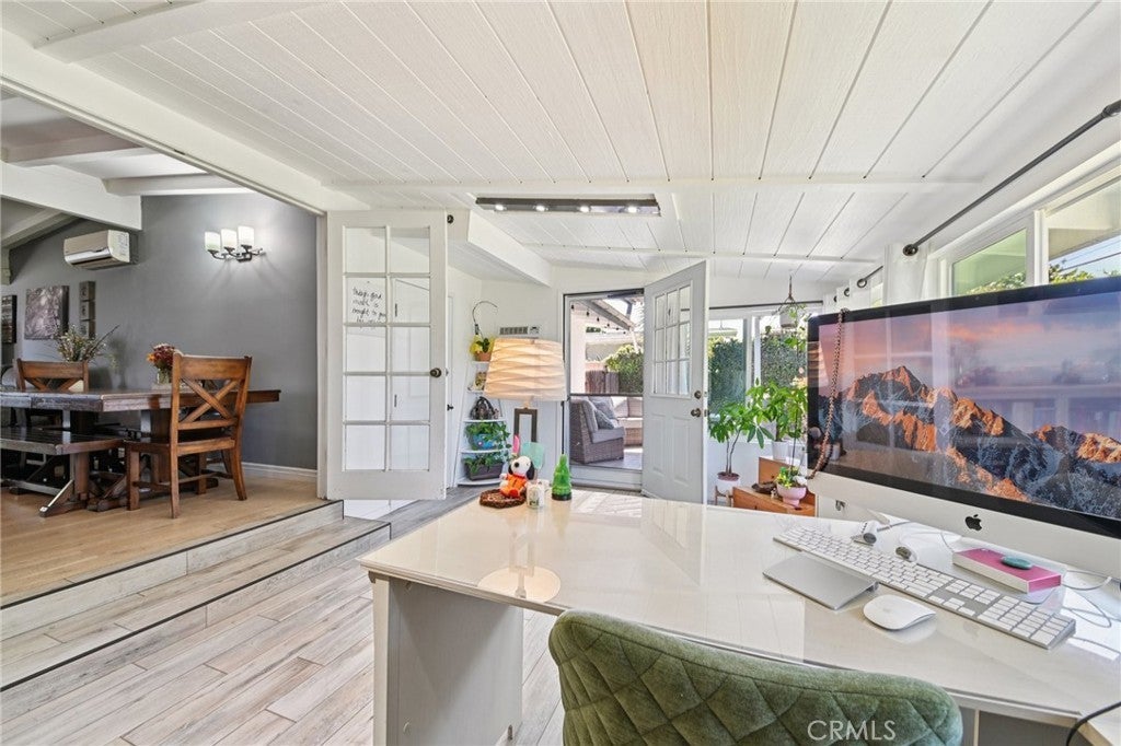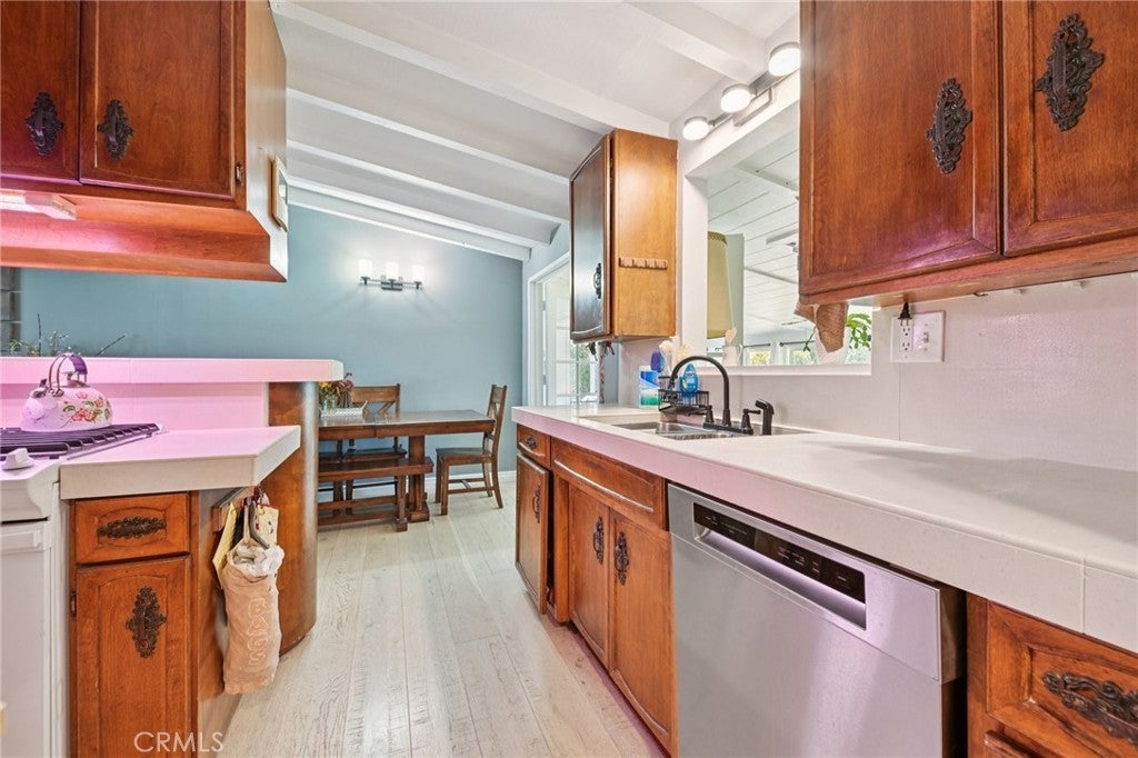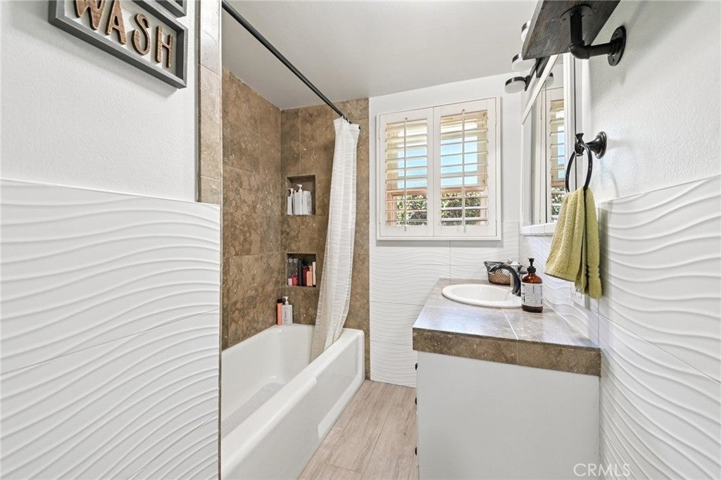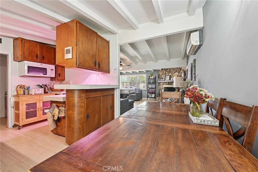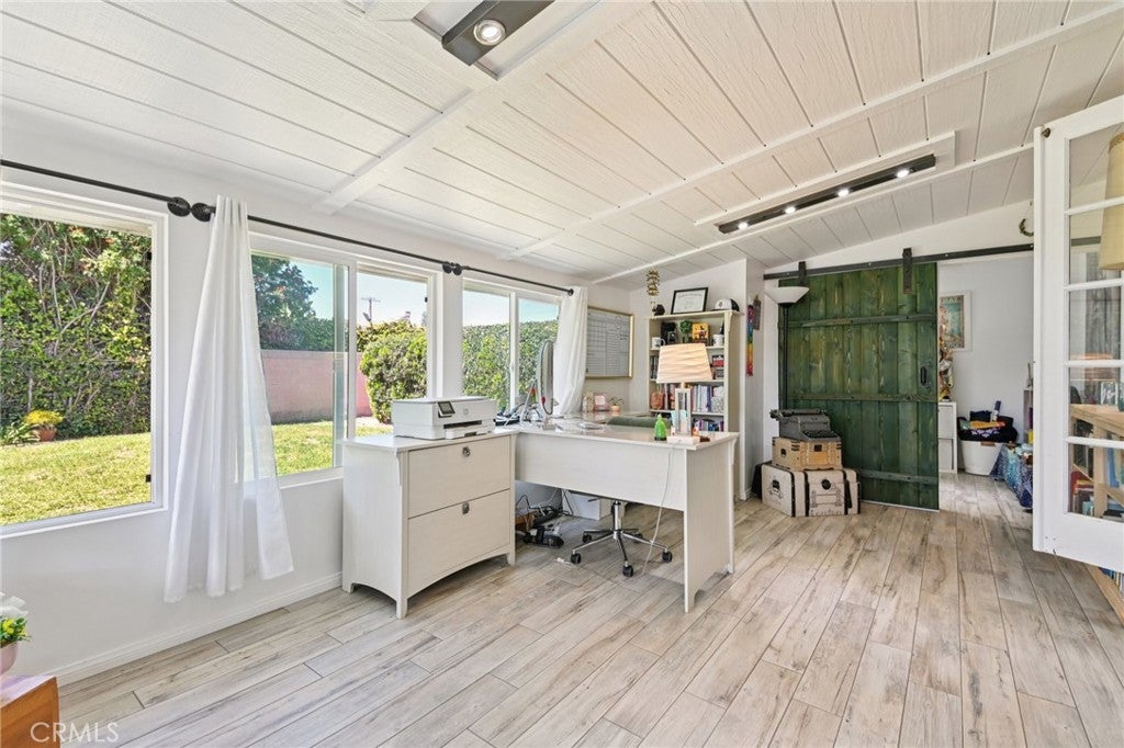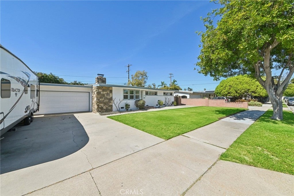 Beautifully maintained 3-bedroom/1.5-bathroom home offering a blend of comfort, functionality, and inviting outdoor living. The property features generous RV parking with an oversized driveway (36’7” x 24’11”), perfect for recreational vehicles, extra cars, or toys. Inside, enjoy engineered hardwood flooring, classic wood shutters, open beam ceilings, dual split A/C, ceiling fan, rustic kitchen with real wood cabinets, interior laundry room, and a cozy wood-burning fireplace. A bright sunroom and adjoining bonus room provide flexible space for an office, studio, or relaxation retreat. The private, landscaped backyard is ideal for entertaining, complete with a shaded patio cover, custom tiled porch matching the sunroom, plenty of green grass, rose bushes, shrubs, and a mature avocado tree. Exterior has been freshly painted with new vent screens, and the upgraded shed with dual pane white vinyl windows adds valuable additional storage, along with the spacious two-car garage. Location is also close to freeways, shopping, and dining!