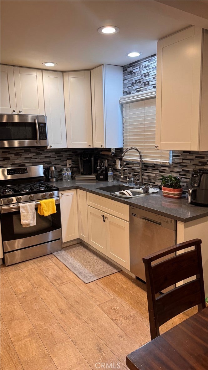 Back on the Market! Fully Remodeled 2 Bed / 1 Bath – Move-In Ready! This beautifully reimagined home showcases refined modern finishes throughout, including a designer kitchen with white shaker cabinetry, sleek quartz countertops, mosaic backsplash, stainless steel appliances, and recessed LED lighting. The spa-inspired bath features custom tilework, a quartz-topped vanity, oversized mirror, and rain shower. Upgrades include new dual-pane windows, a new roof, fresh paint, premium flooring, and solid core doors. Enjoy whole-house audio extending to a spacious covered patio, ideal for entertaining. The property also offers a large garage with 220V subpanel, expansive RV parking, and professionally landscaped grounds with automatic sprinklers—an exceptional, turnkey offering.