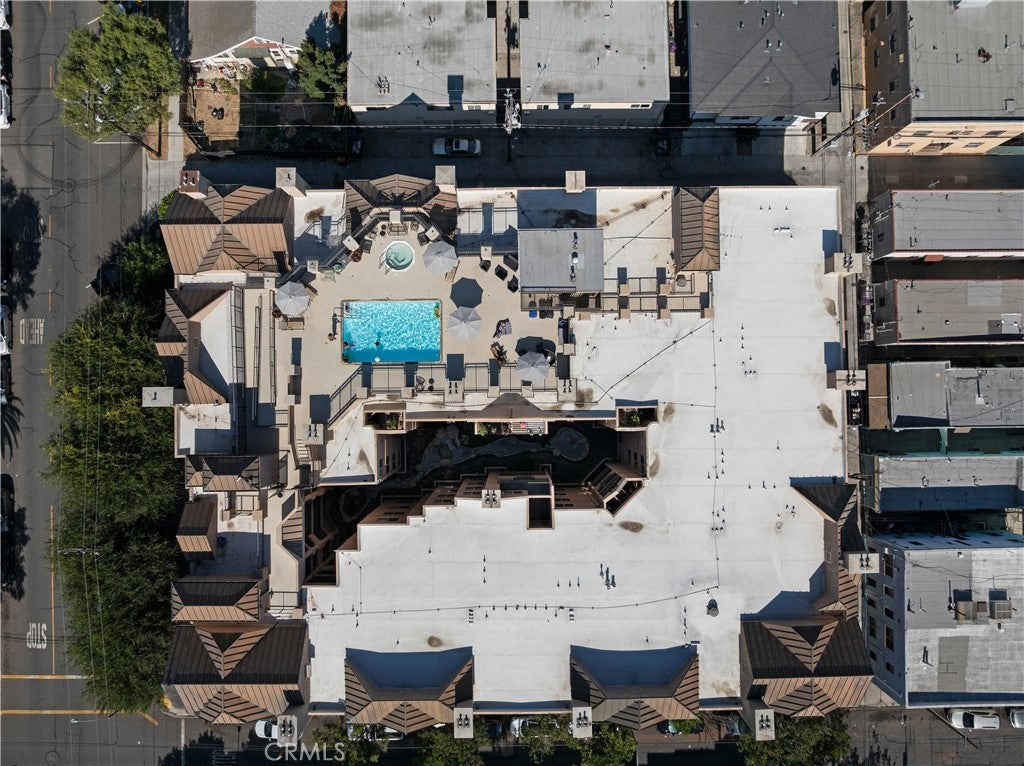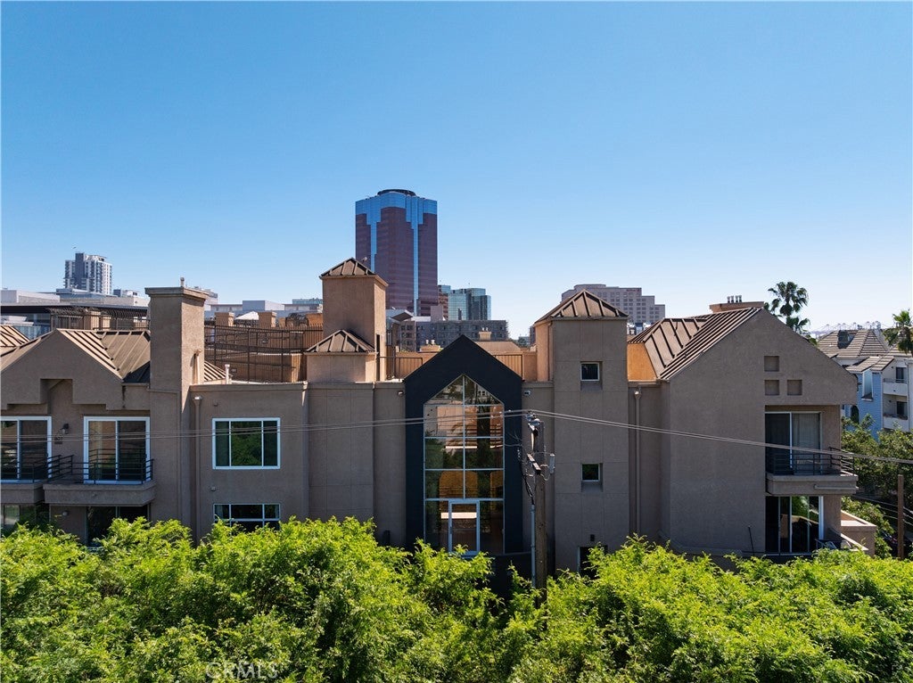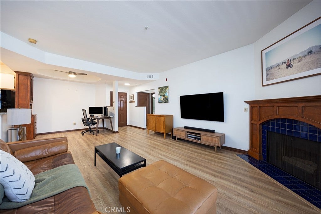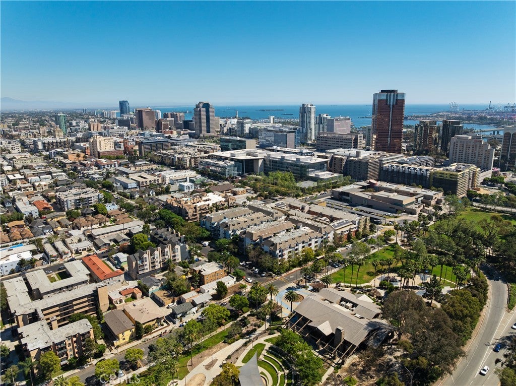 Welcome home to this top-floor two-bedroom, two-bath condo in the heart of downtown Long Beach. Unobstructed city skyline views, two private balconies, and a rooftop pool and jacuzzi deck make this feel like resort living, all within close proximity to the best downtown has to offer. The living room anchors the space with wide-plank LVP flooring, a gas fireplace framed by a wood mantel and cobalt blue tile surround, and wood-framed sliding glass doors with wood shutters that open to the first balcony and flood the space with natural light. The layout flows into a flex dining and work area anchored by a built-in wood hutch with glass upper cabinets, tray ceiling, and ceiling fan. The kitchen is fully equipped with a Thermador gas range, stainless refrigerator with water line, built-in microwave, Bosch dishwasher, garbage disposal, and water filtration system. Stone-look counters, recessed lighting, and cabinet storage round out the space. The primary suite connects directly to the second balcony through sliding glass doors flanked by a full wall of louvered wood closet panels. The en-suite bath features a tile vanity with wood cabinetry and a glass block walk-in shower. The second bedroom is generously sized with LVP floors and its own large window, walk in closet and is currently configured as a studio and office. The second bath has a white shaker vanity with brushed nickel fixtures and a tub/shower combo. In-unit laundry with a stacked LG front-load washer and dryer stays with the home. Two-car tandem parking in the secured community garage is included, with bike storage available. The rooftop pool and jacuzzi deck delivers sweeping downtown skyline views, lounge seating, and shade umbrellas throughout. HOA dues cover water, trash, sewer, pool, jacuzzi, security, elevators, janitorial, and master insurance. Up to one dog, one cat, or comparable domestic pet permitted. The restaurants, galleries, and energy of downtown Long Beach are right outside your door, with the waterfront just beyond.
