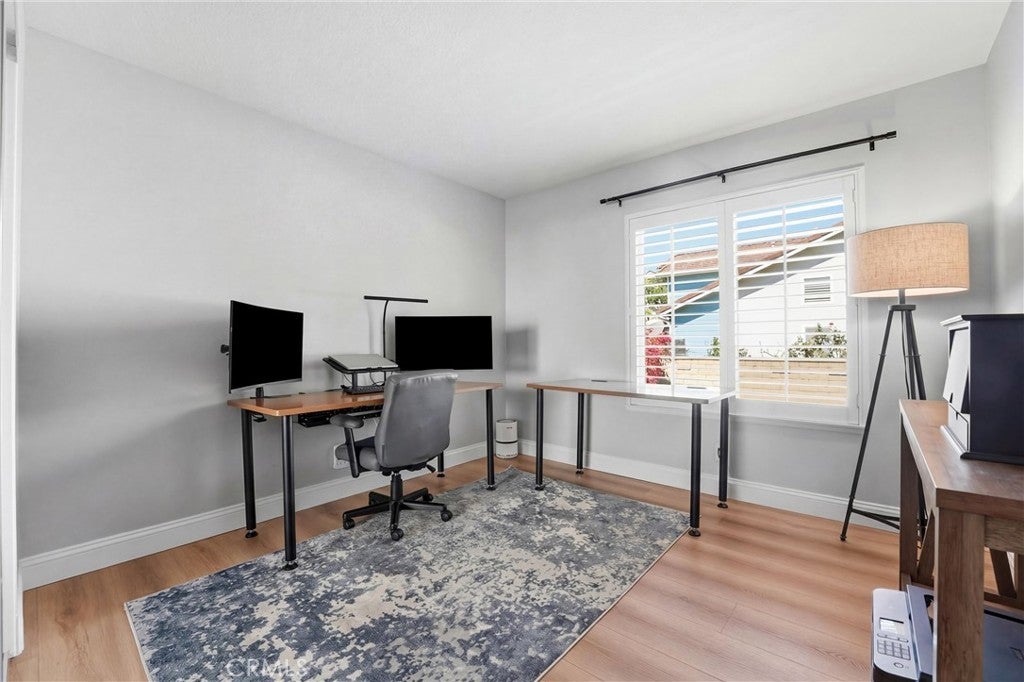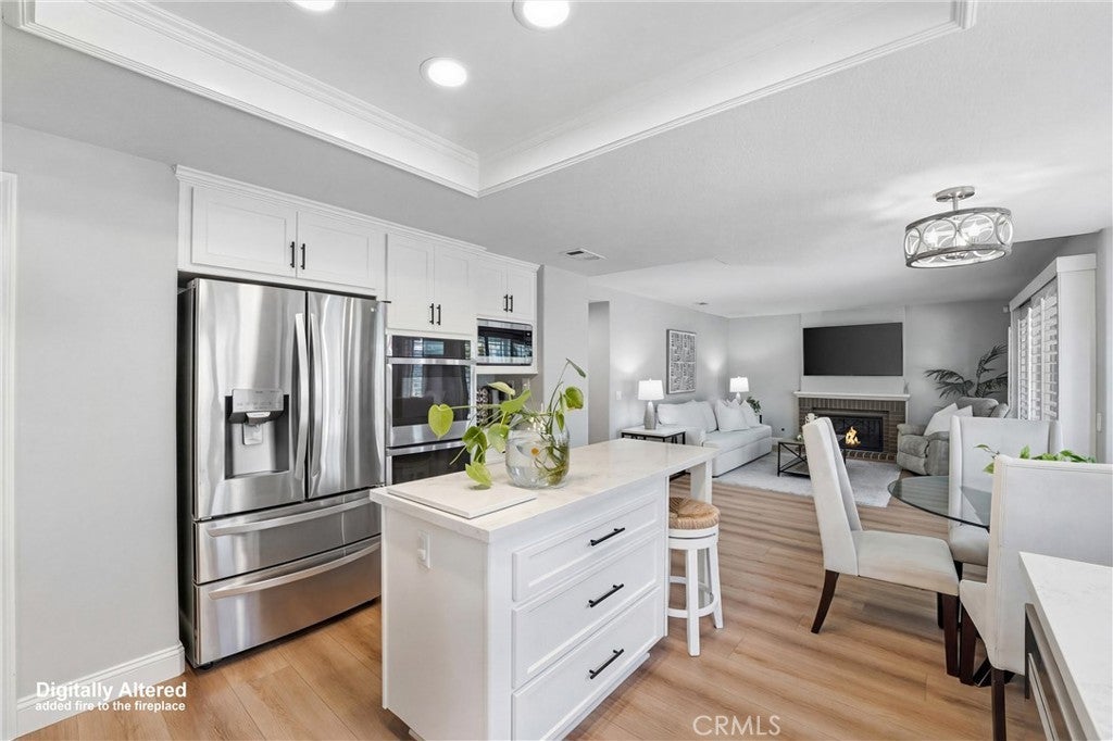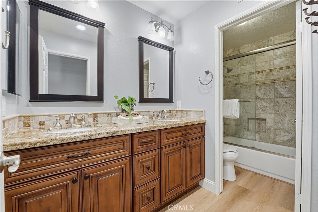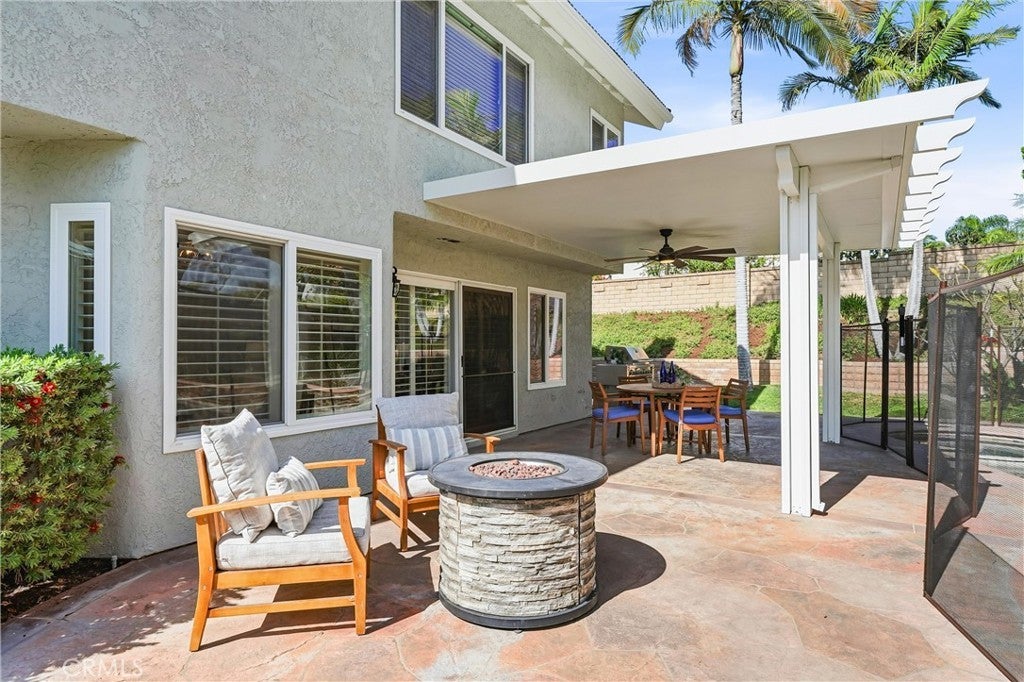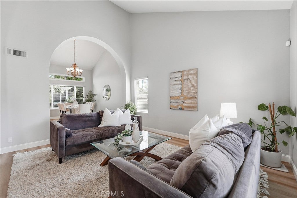 This stunning home blends elegance and comfort, featuring impressive curb appeal, a beautifully upgraded interior, and a resort-style backyard with pool and spa. A private entry foyer welcomes you with soaring cathedral ceilings, architectural arches, and an abundance of windows that fill the home with natural light, highlighting the gorgeous plank flooring throughout. Nearly every room offers scenic views of mature palm trees and lush landscaping. The spacious floor plan includes 5 bedrooms, including a highly desirable main-floor bedroom with a walk-in closet and custom built-ins. The main-level bathroom features a walk-in shower with custom stone finishes. The fully remodeled kitchen is a chef’s dream, showcasing quartz countertops, shaker cabinetry, a large center island with custom storage, dual ovens, coffee bar, and an expansive walk-in pantry, overlooking the beautifully landscaped backyard. Cathedral ceilings enhance the formal living and dining rooms, both offering picturesque views of the front and rear grounds. The family room opens seamlessly to the kitchen, creating an ideal space for gathering and entertaining. Upstairs, the grand primary suite features vaulted ceilings, large windows, and tranquil backyard views. The en-suite bath includes stone accents, a soaking tub, dual vanities, and a spacious walk-in closet. The secondary upstairs bedrooms are generously sized, including one oversized room with vaulted ceilings, a window nook, and walk-in closet—perfect for flexible use. The backyard is an entertainer’s dream, offering multiple areas for dining, lounging poolside, or relaxing beneath a pergola in a private, serene setting. Rarely does a pool home offer this much space for entertainment, storage, and recreation. Additional highlights include newer dual-pane windows, saltwater pool with remote system, remodeled bathrooms, updated kitchen, new plank flooring, dual ovens, walk-in pantry, indoor laundry room, and fresh interior and exterior paint. Located within the Yorba Linda High School boundary and conveniently close to the 91, 241, 55, and 57 freeways.