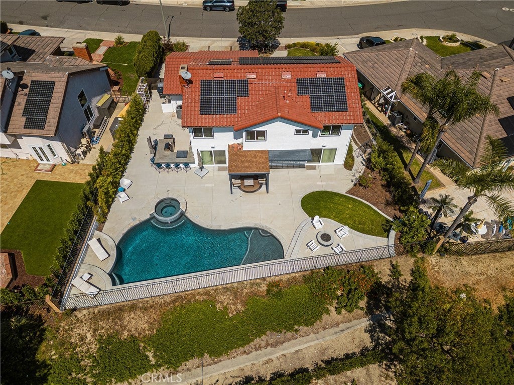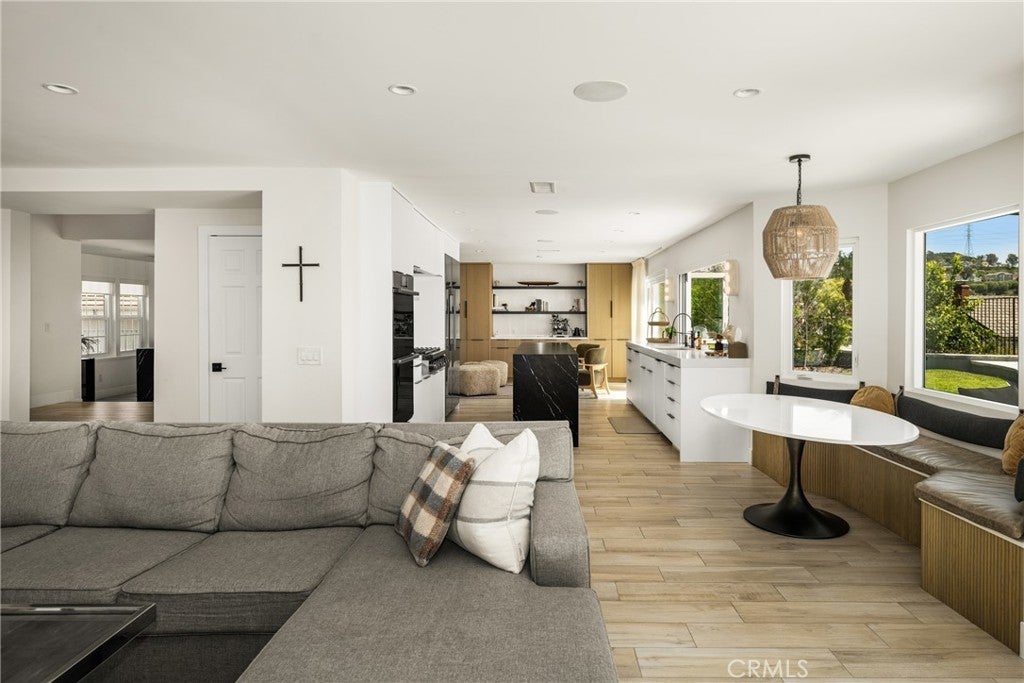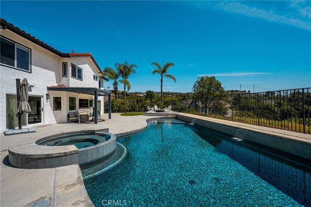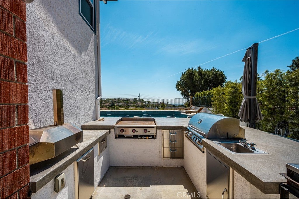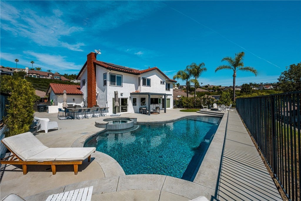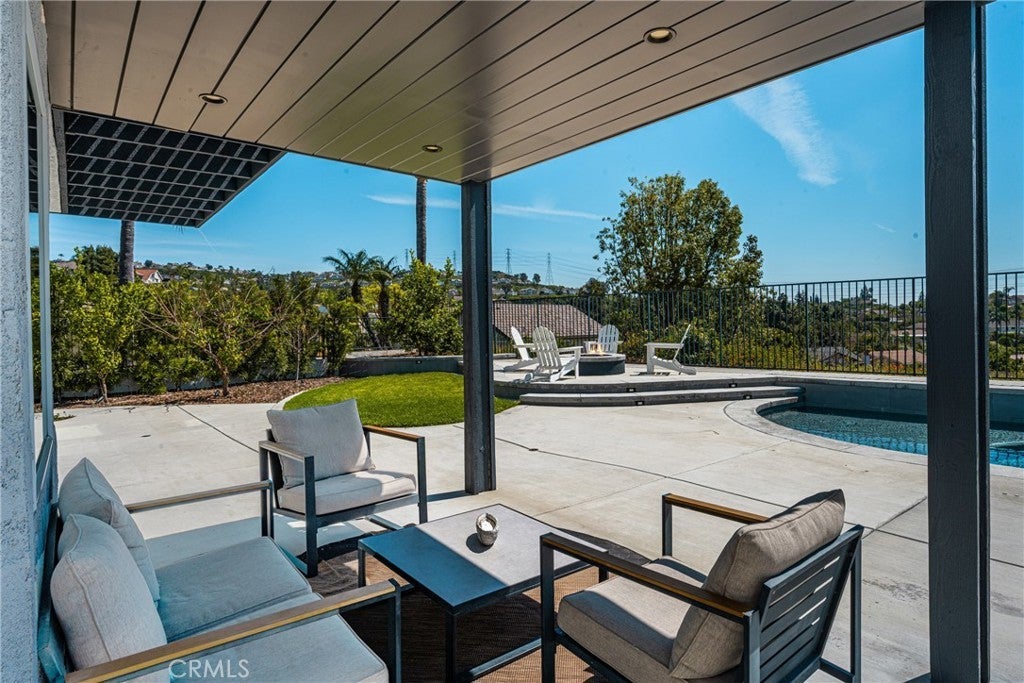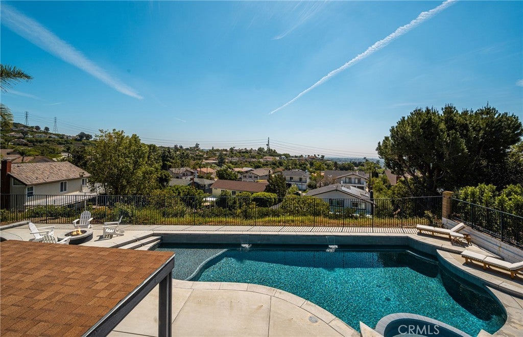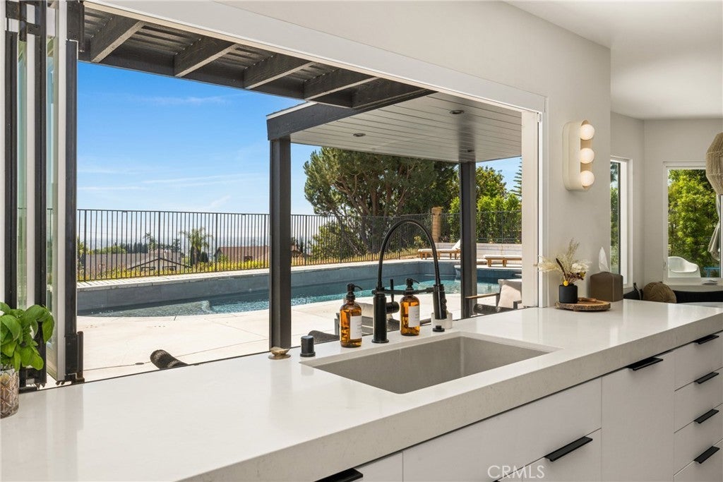 Absolutely stunning view home offering 4 bedrooms and 2.5 baths, thoughtfully reimagined for the most discerning buyer who values quality and timeless design. Completed in 2022, this extensive renovation showcases exceptional craftsmanship throughout, featuring custom cabinetry, a fully remodeled modern kitchen with premium Dacor Appliances, and high-end custom countertops. A beautifully designed bar with bespoke cabinetry and finishes creates the perfect space for entertaining. The main level is elevated with Level 5 smooth drywall and artisan hand-applied plaster accents at the fireplace and powder room, delivering a refined, custom-home feel. Additional upgrades include all-new windows, highlighted by a dramatic bi-fold pass-through window in the kitchen, and a full PEX repipe for long-term peace of mind. The outdoor living space was completely transformed in 2022 into a true resort-style retreat, featuring a remodeled pool with Baja shelf, custom concrete hardscape, a designer barbecue area with concrete countertops, and a built-in fire pit. Lush, professionally landscaped grounds with a drip irrigation system frame the space, all set against breathtaking panoramic city light views. A rare opportunity to own a turnkey home where no detail was overlooked—this is luxury, quality, and lifestyle combined.