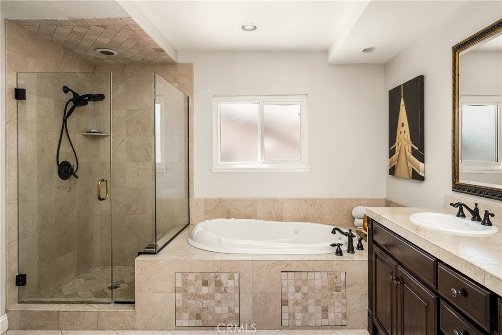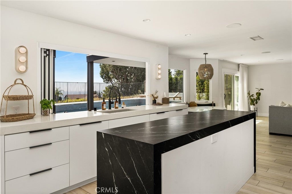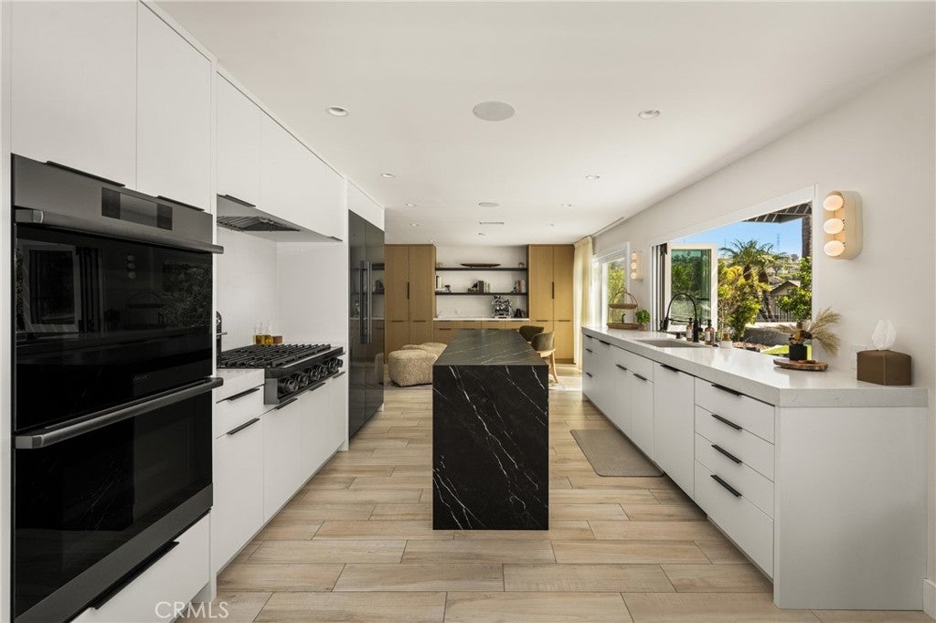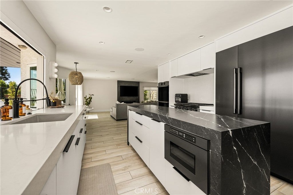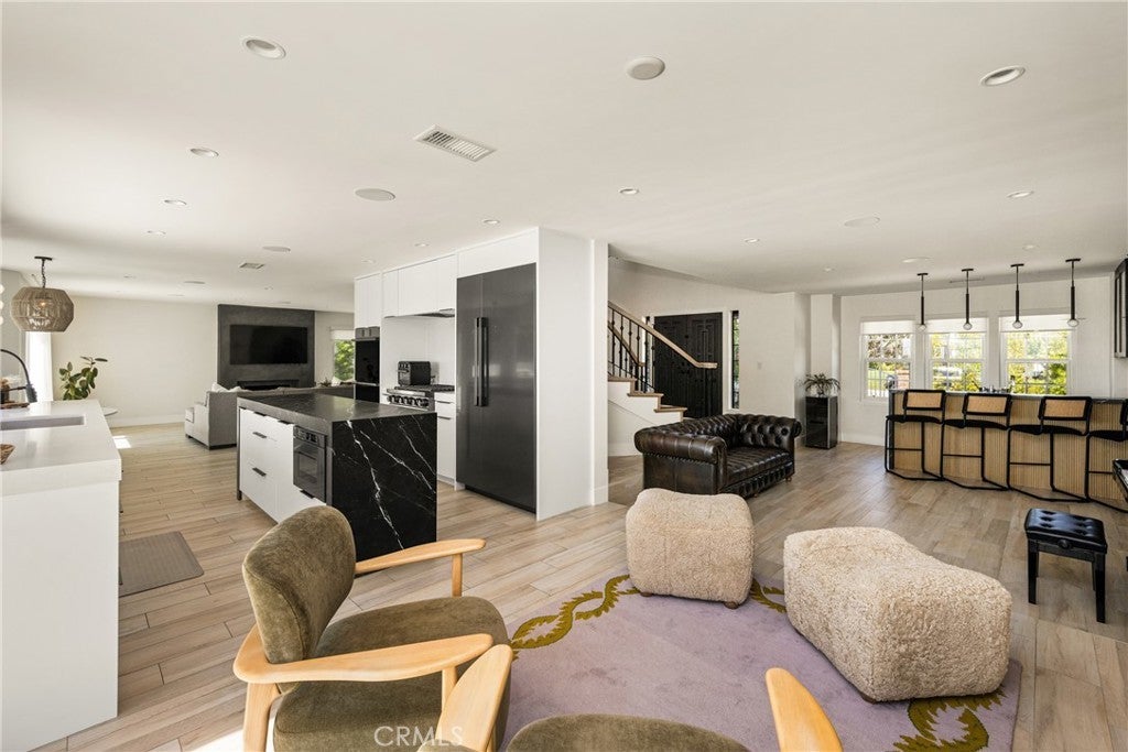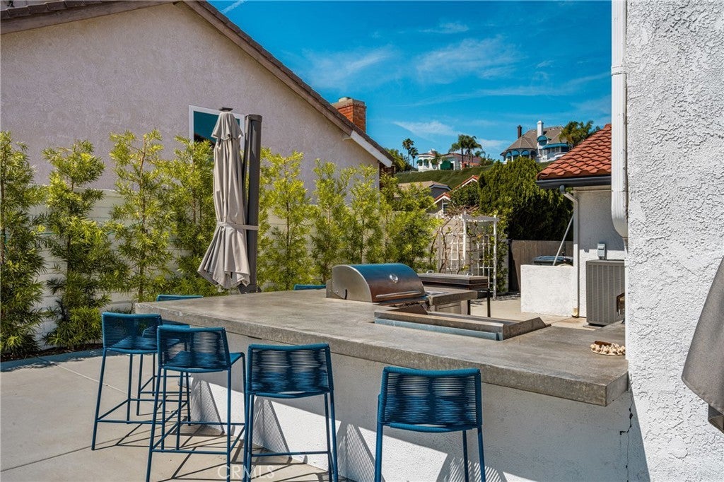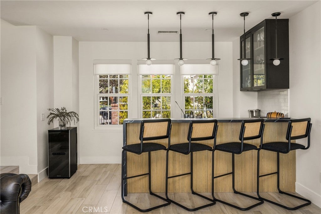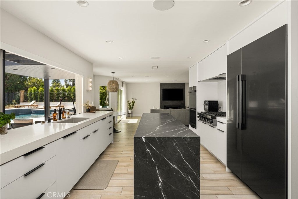 Absolutely stunning view home offering 4 bedrooms and 2.5 baths, thoughtfully reimagined for the most discerning buyer who values quality and timeless design. Completed in 2022, this extensive renovation showcases exceptional craftsmanship throughout, featuring custom cabinetry, a fully remodeled modern kitchen with premium Dacor Appliances, and high-end custom countertops. A beautifully designed bar with bespoke cabinetry and finishes creates the perfect space for entertaining. The main level is elevated with Level 5 smooth drywall and artisan hand-applied plaster accents at the fireplace and powder room, delivering a refined, custom-home feel. Additional upgrades include all-new windows, highlighted by a dramatic bi-fold pass-through window in the kitchen, and a full PEX repipe for long-term peace of mind. The outdoor living space was completely transformed in 2022 into a true resort-style retreat, featuring a remodeled pool with Baja shelf, custom concrete hardscape, a designer barbecue area with concrete countertops, and a built-in fire pit. Lush, professionally landscaped grounds with a drip irrigation system frame the space, all set against breathtaking panoramic city light views. A rare opportunity to own a turnkey home where no detail was overlooked—this is luxury, quality, and lifestyle combined.