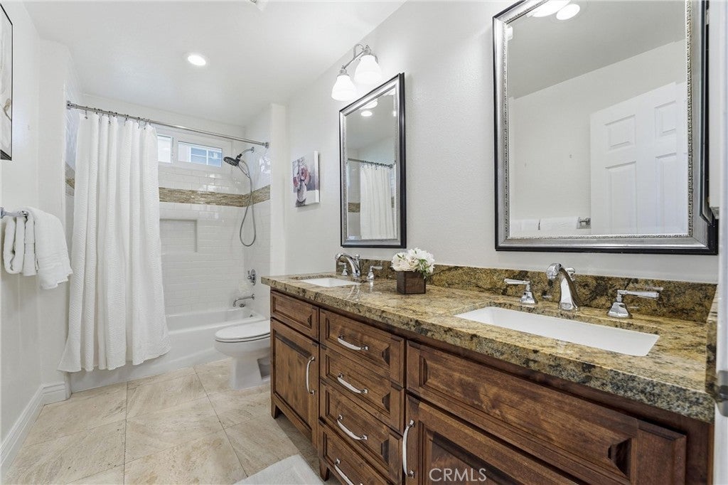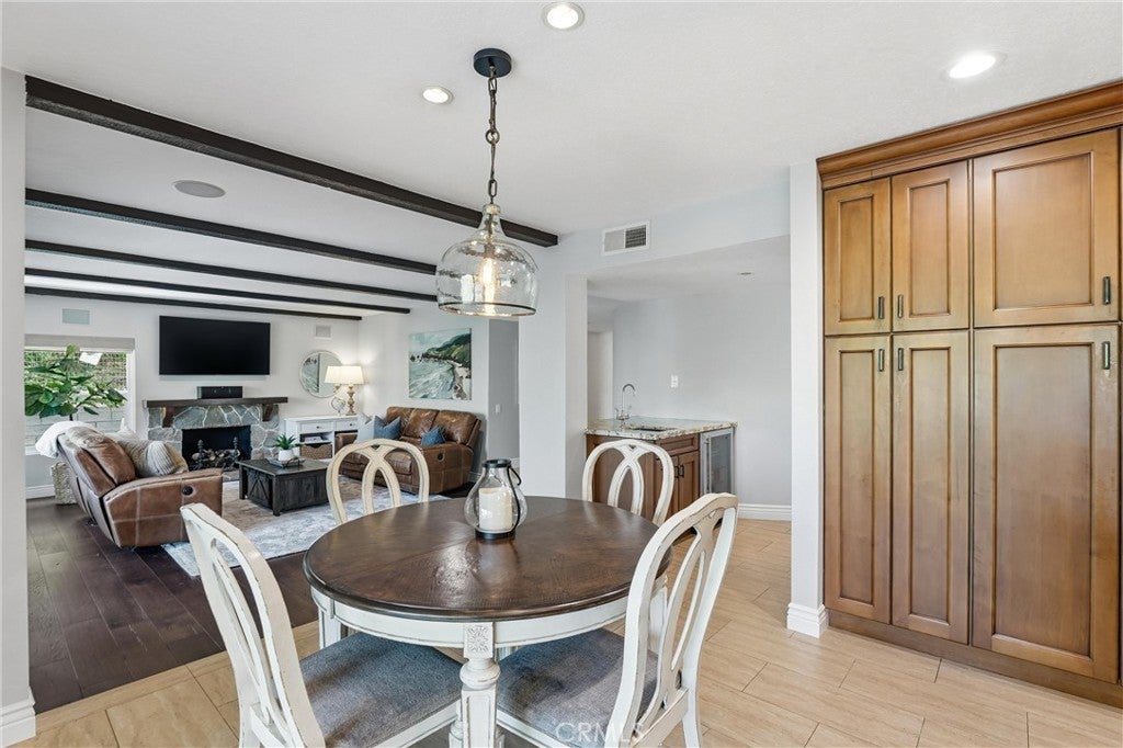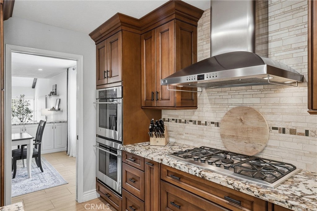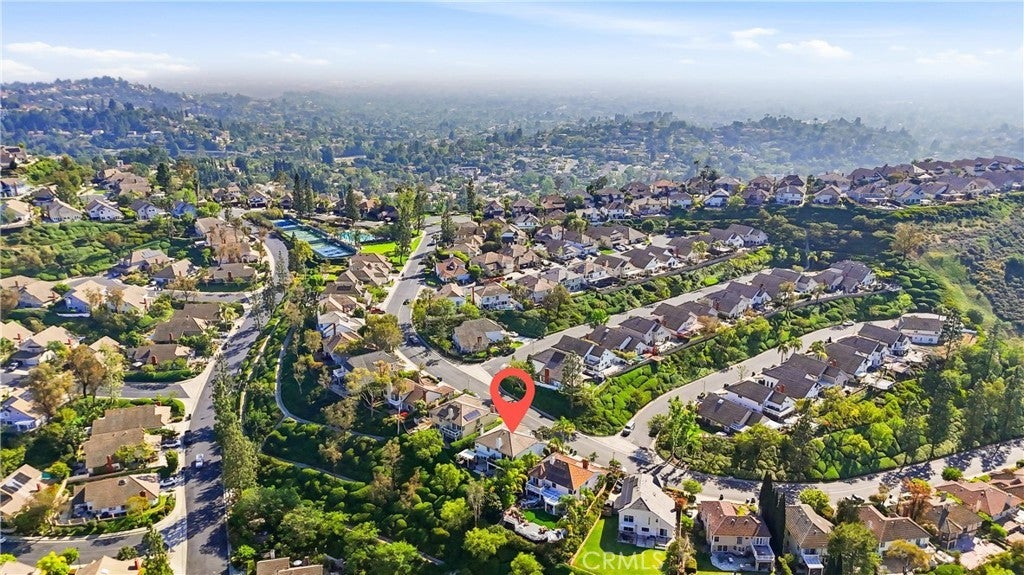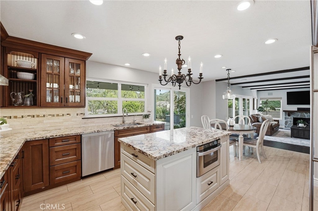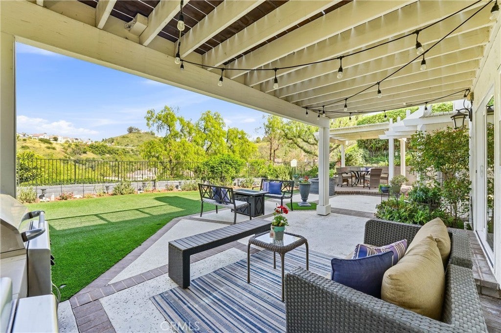 Welcome to this remodeled single-family home located in the guard-gated community of Rocking Horse Ridge in Orange, offering canyon views, a private backyard, and a functional floor plan designed for modern living. Positioned on an elevated lot with no direct rear neighbors, this home combines privacy, natural light, and access to sought-after community amenities including a 24-hour guard gate, pool, spa, clubhouse, park, pickleball, and tennis courts. The interior features a remodeled kitchen with custom wood cabinetry, granite countertops, stainless steel appliances, and a center island that opens to the family room and backyard. Multiple living spaces include a formal living room and a separate family room with exposed wood beam ceilings, a stone fireplace, and wired surround sound. Real hardwood flooring and travertine tile run throughout, complemented by recessed lighting and all new interior paint. Additional upgrades include double pane windows, a whole house fan, and a full repipe completed by previous owners. The primary suite offers canyon views, a private balcony, fireplace, and ample space for a retreat-style setting. An optional fifth bedroom or loft provides flexibility for a home office, guest space, or additional living area. The backyard is designed for both entertaining and everyday use, featuring a covered patio with lighting, built-in BBQ, seating areas, artificial turf, and a new irrigation system (2025). A fenced dog run adds additional functionality. The elevated lot enhances both privacy and view orientation. Additional features include an epoxy-coated garage floor with custom cabinets and workbench (2025). Located near Peters Canyon Regional Park, Irvine Regional Park, and local hiking and biking trails, with convenient access to shopping, dining, and major commuter routes.