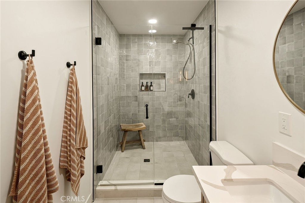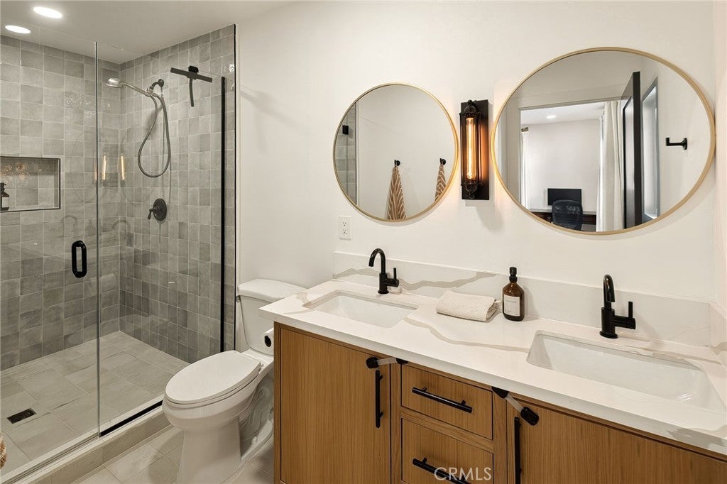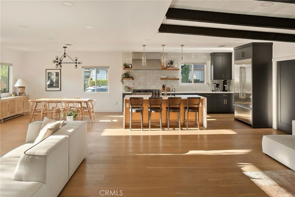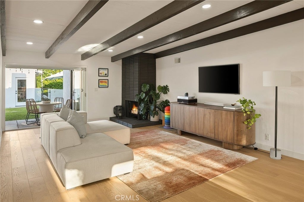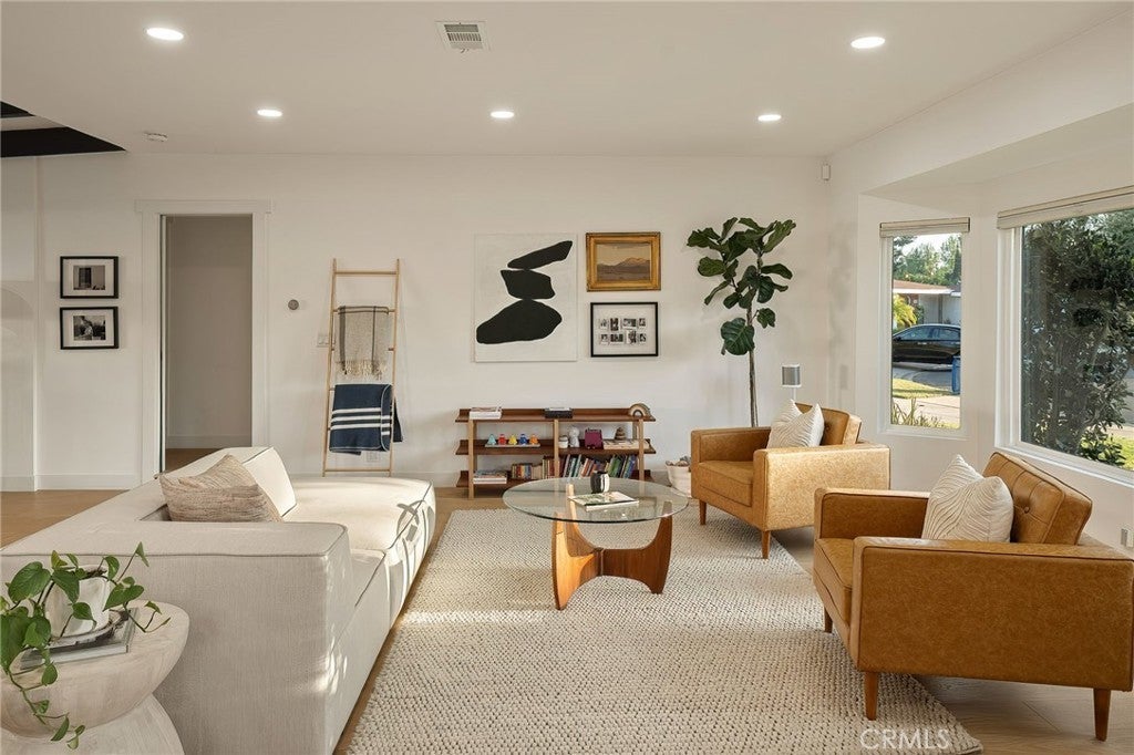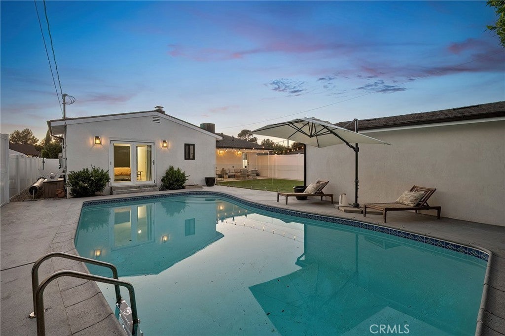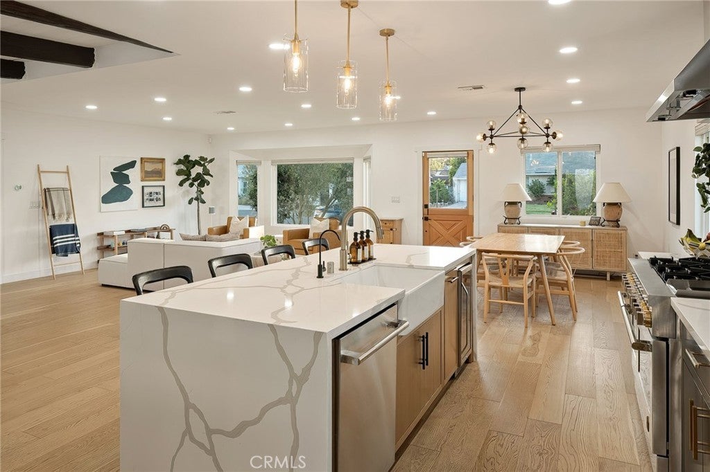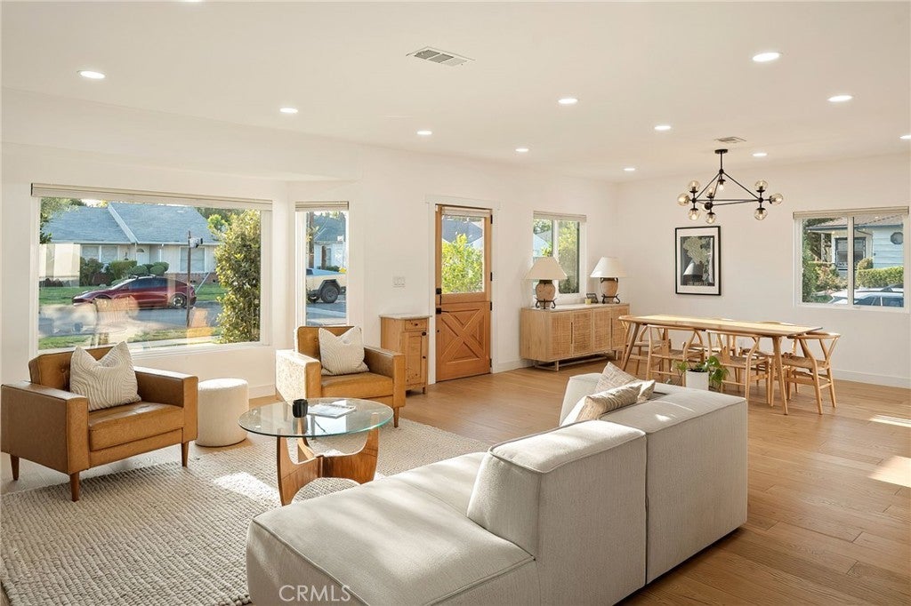 Experience modern single-story living in this impeccably remodeled Sherman Oaks corner-lot home. With 3 bedrooms and 3 baths, the open-concept floor plan is flooded with natural light, flowing effortlessly through expansive bi-fold doors to the serene backyard retreat. The chef’s kitchen is a study in both form and function, featuring custom cabinetry, stainless steel appliances, a generous island, wine fridge, and waterfall quartz countertops. Outdoors, a heated pool, lounge area, and lush grassy expanse create a private sanctuary designed for both relaxation and entertaining. The master suite offers a tranquil escape with an oversized glass shower, dual vanities, custom built-ins, and direct access to the backyard oasis. Thoughtful upgrades include all-new windows, tankless water heater, newly upgraded A/C system, and a private laundry room. Fully paid Tesla solar panels provide energy efficiency, complemented by a Tesla charging station in the two-car garage. Every detail of this home—from its sunlit interiors to its private outdoor haven—has been curated for effortless luxury and modern living.