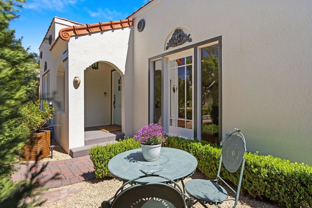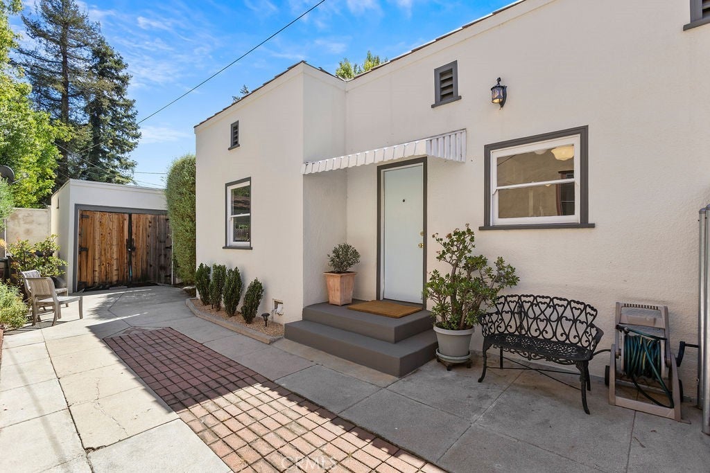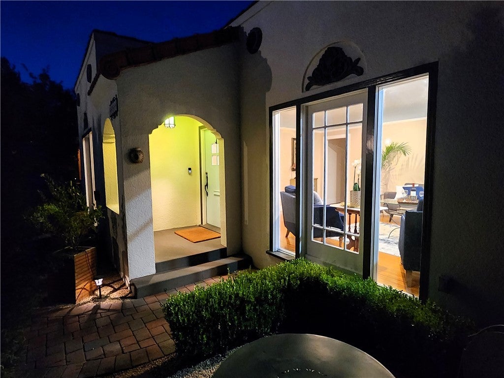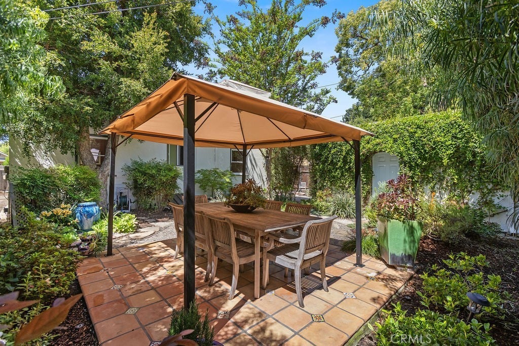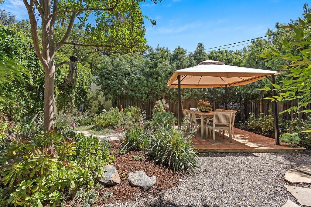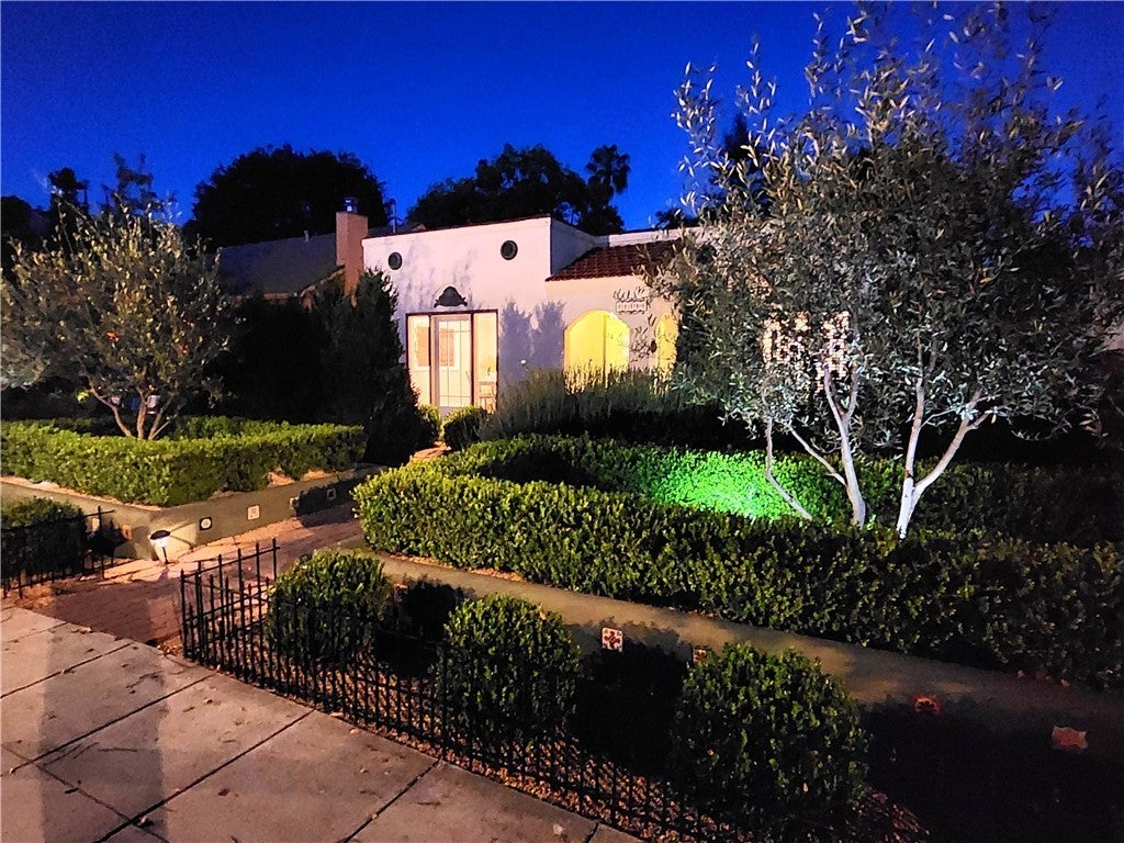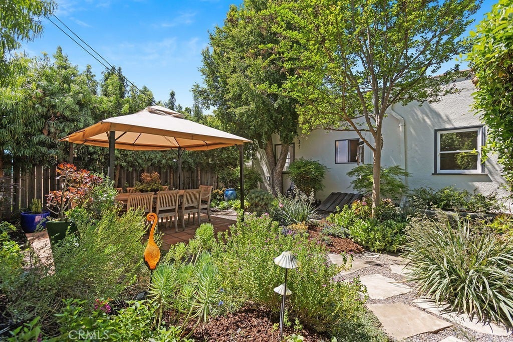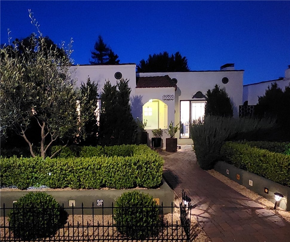 Simply Magical! This vintage Spanish-style is beautifully preserved from a bygone era, blending timeless character with thoughtful modern updates. Meticulous landscaping and raised planter with Spanish inlay guide you to a welcoming front porch, covered in Ludowici roof tile and complemented by a private sitting area framed by mature juniper for added privacy. This 3-bedroom, 1 spacious bathroom with dual sinks and custom tile, offers old-world charm at every turn. Enter and you will be greeted with a light filled living room anchored by a classic brick fireplace and dramatic floor-to-ceiling windows. The formal dining room continues the elegance with matching windows and a vintage statement light fixture. The kitchen is both charming and functional, offering new stainless-steel appliances (including refrigerator) and a cozy breakfast room with a built-in-buffet. A separate laundry room just off the kitchen includes a new washer and dryer, along with direct access to the driveway. Outside the property continues to shine. A long driveway leads to a single car detached garage and a grand garden archway that opens to a serene backyard retreat! Enjoy a terracotta tile-covered patio with a rustic teak dining table seating eight, while flagstone pathways wind through lush, raised garden beds and a tranquil water feature - all surrounded by mature foliage for ultimate privacy. Additional amenities: hardwood flooring; architectural plans to add bathroom + remodel kitchen and laundry without expanding the homes footprint; 2021 - central air conditioning, seismic foundation retrofit with bolting & recessed lighting in living & dining rooms; 2022 - water drainage system (backyard); 2025 - attic insulation replacement, gazebo (backyard) & the list goes on... This home truly has the "IT" factor - an exceptional blend of character, comfort, and charm.