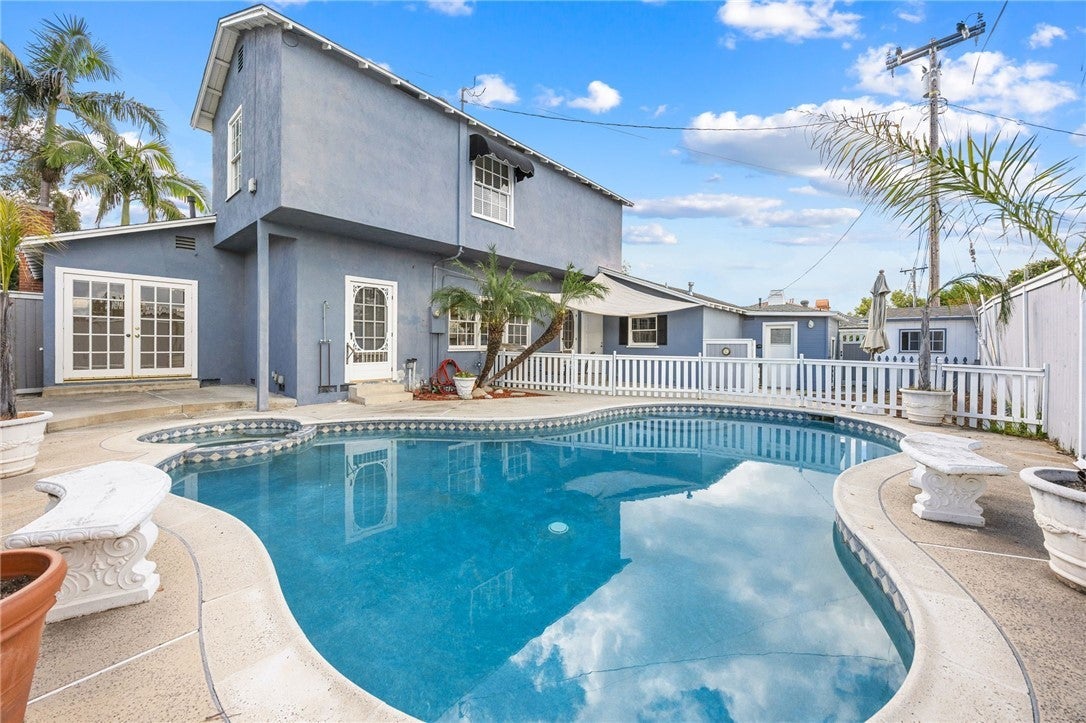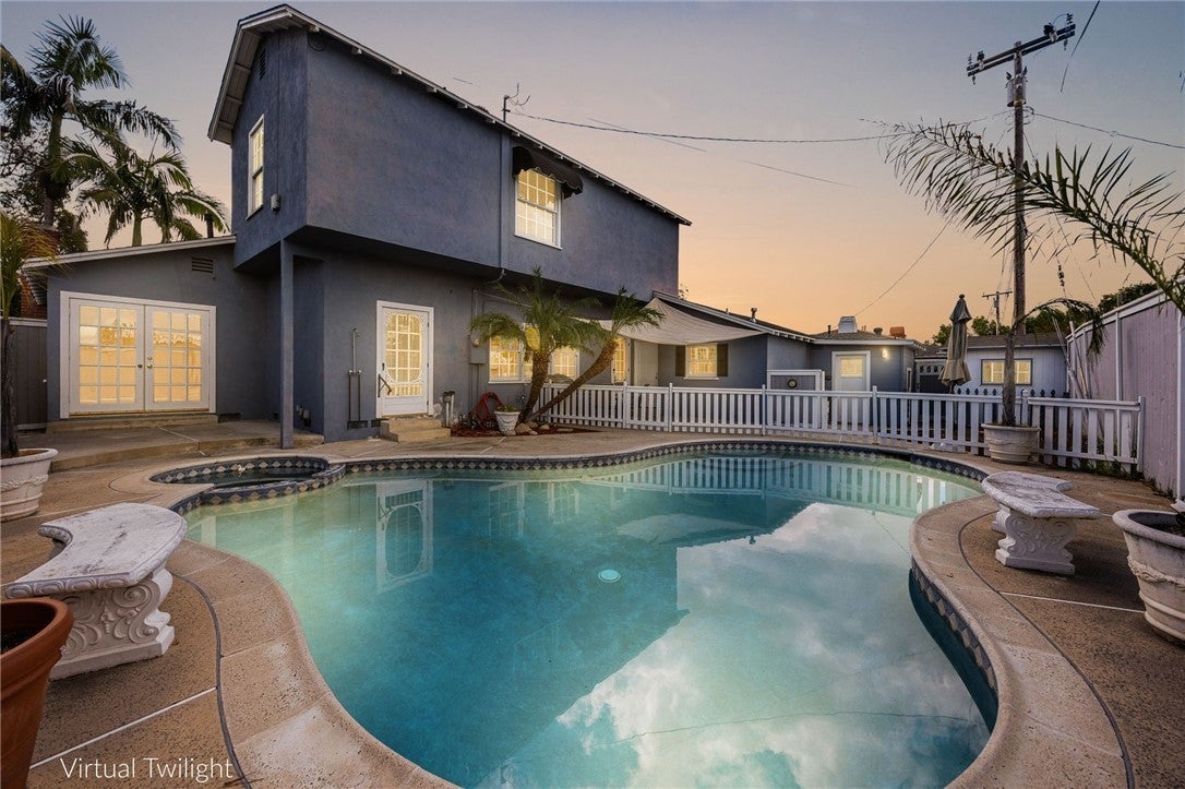 Enjoy this Slice of Heaven in the tranquil Golden Hill neighborhood of Fullerton. This three bedroom, two bath California Coastal Cottage style home is set off above the street tucked away in a Serene natural setting. It features a downstairs bedroom (which could be a primary bedroom by reattaching its door in the hallway) and full bath, convenient office that overlooks the sparkling pool with pool house and playhouse, beautiful hardwood floors, and a two-car detached garage with driveway. You'll appreciate the quiet nature filled setting on the enclosed front yard patio which is perfect for al fresco dining. Producing lemon, apple, tangerine, grapefruit, and fig trees! View Disneyland fireworks from the kitchen and two upstairs bedrooms. This home has vintage 1940s appeal with all the modern conveniences. Just a short walk to amazing Golden Hill Elementary School, Muckenthaler Center on its 8.5 Acres of sculptured gardens, and Hiltscher Park. Close to Downtown Fullerton with all its incredible restaurants, entertainment, and shopping, the Fullerton Loop trail, Cal State Fullerton, Fullerton College and more! Refer to the links to the Video and Matterport three-dimensional interactive floorplan.