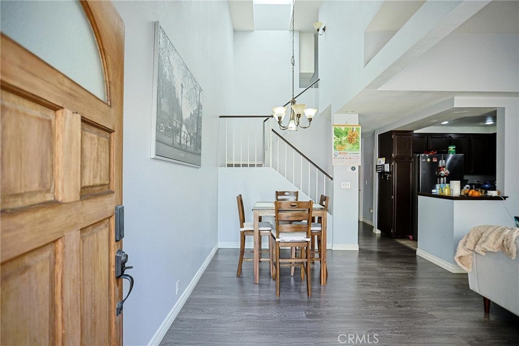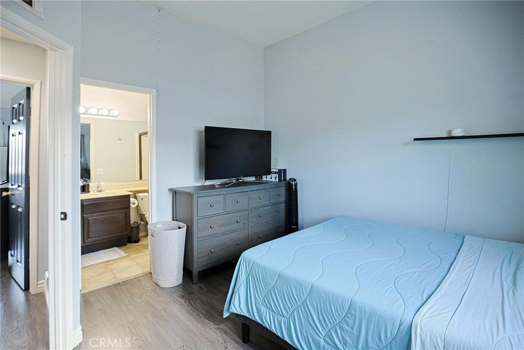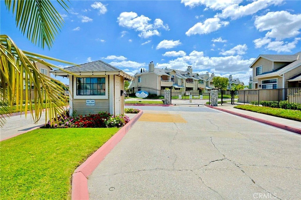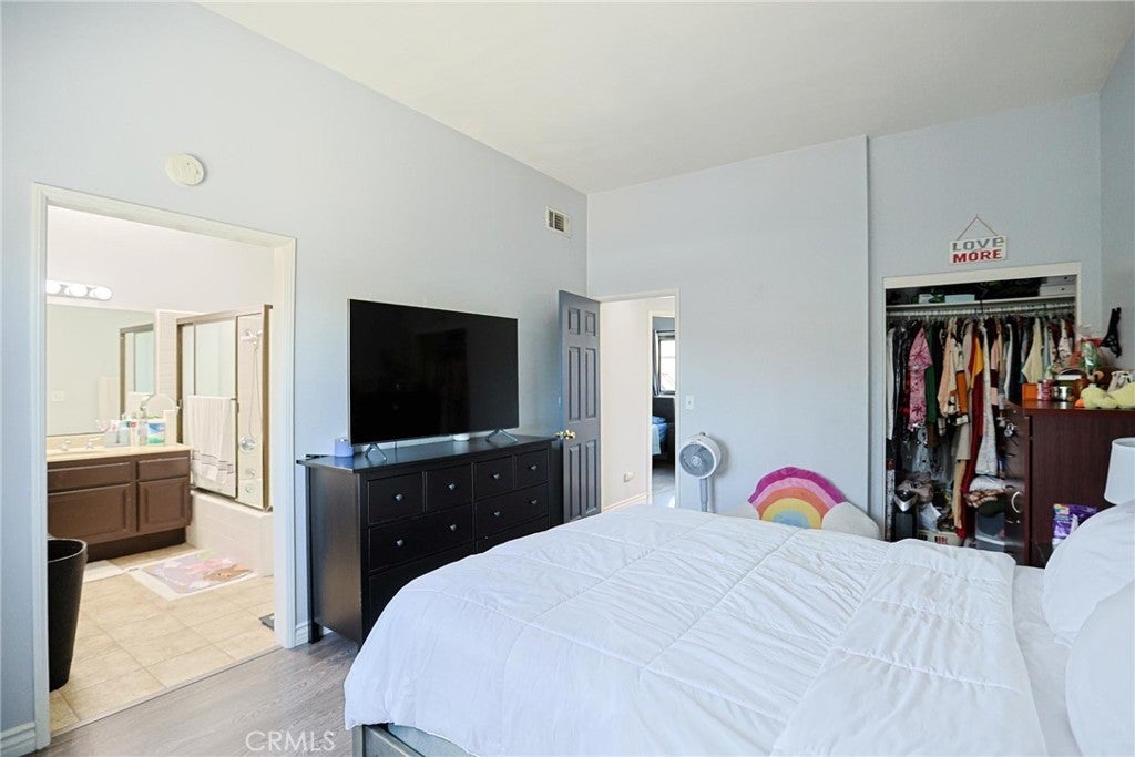 Welcome to this beautifully maintained condo in the gated community of Wellington Landing, where soaring ceilings, abundant natural light, and multiple skylights create a bright and inviting atmosphere for both everyday living and entertaining. The main level features a spacious family room, dining area, open kitchen, convenient half bath, central A/C and heat, and direct access to the attached two-car garage. Just steps from the garage, you will also find multiple easy-access community parking spaces with no permit required, offering added convenience for guests and extra vehicles. The home is further enhanced by double-pane windows and modern laminate flooring throughout, adding both comfort and efficiency. Upstairs, both bedrooms feature private en-suite bathrooms, including a generously sized primary suite with the comfort and scale often found in single-family homes. Move-in ready and exceptionally well cared for, this home shows beautifully. Residents enjoy access to a community pool and spa, while nearby John Marshall Park, highly regarded public and private schools, and convenient access to the 5 Freeway further enhance the home’s outstanding location and appeal.