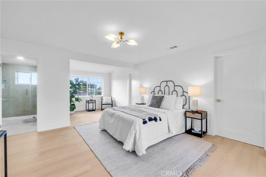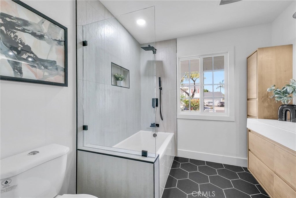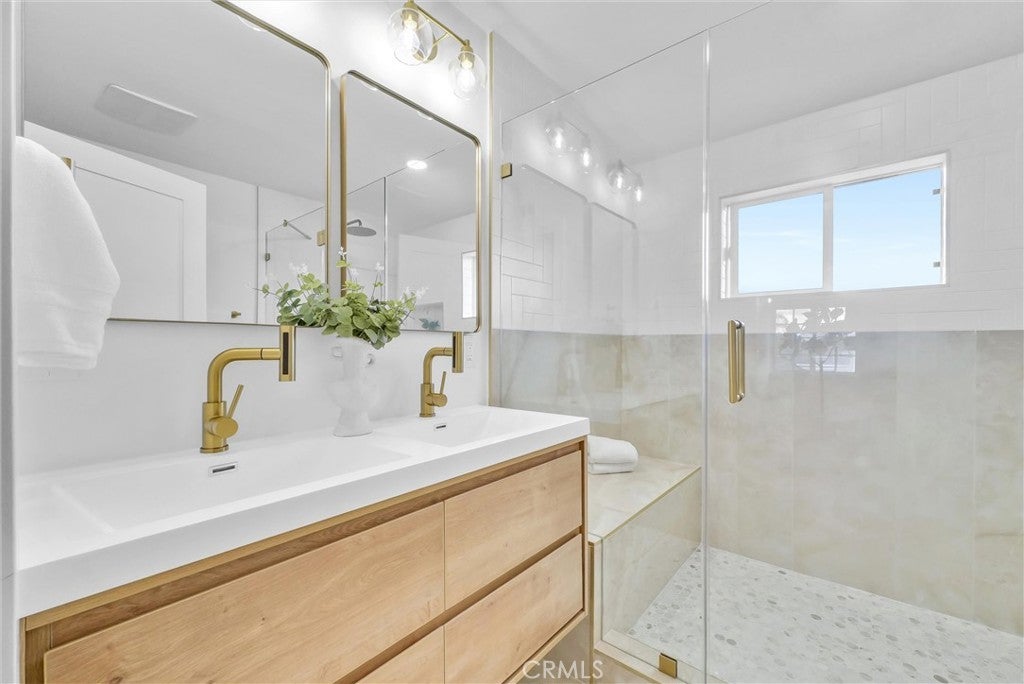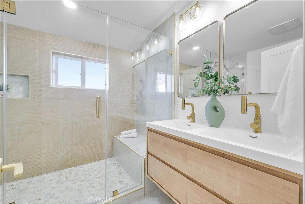 # 2902 E Winfield Ave, Anaheim, CA 92806 Welcome to an exquisitely reimagined residence where sophisticated design converges with effortless livability on a coveted corner lot in the heart of Anaheim. This stunning 4-bedroom, 3.5-bathroom home has been completely remodeled to perfection, presenting a rare opportunity for discerning buyers seeking elevated everyday luxury. Step through the striking walnut front door into a gracious foyer that unveils a formal living room adorned with an elegant tiled fireplace, flowing seamlessly into a distinguished dining room. The family room, complete with a sophisticated bar, offers an ideal setting for intimate gatherings. At the heart of the home, the beautifully appointed kitchen showcases light oak shaker cabinetry, lustrous quartz countertops, artisan tile backsplash, and commercial-grade stainless steel appliances, including a sleek drawer microwave. Two well-appointed main-floor bedrooms feature mirrored wardrobe doors alongside a full bathroom with modern vanity, while a convenient half bath accommodates guests with ease. Ascend to discover two lavish primary suites, each boasting generous walk-in closets and spa-inspired ensuite bathrooms with double vanities, tiled shower surrounds, and frameless glass enclosures. Refined brushed gold fixtures and hardware, light oak laminate flooring, recessed lighting, and central climate control unite every space in cohesive elegance. A dedicated laundry room provides abundant storage for seamless functionality. Ideally situated near Steve Ambriz Memorial Park, top-rated Valencia High School, and convenient transit options, this residence redefines modern sophistication in one of Anaheim's most desirable neighborhoods.