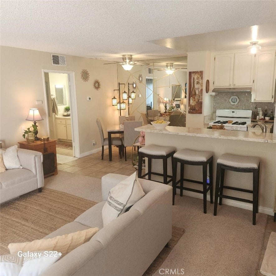 South Coast Metro Area One Bedroom Condo in the Lakeshore Community . Features include ; sought after lower end interior location , Kitchen has Quartz Counters / Breakfast Bar / Gas Oven & Stove / Dishwasher / Refrigerator / White upgraded Cabinets , Living Area has a Gas Fireplace , Enclosed Patio , Bedroom has Mirrored Wardrobe Closet Doors / Built in closet organizers / custom 2 layer drapes , Bath has a separate vanity area / shower in tub has a removeable shower head , Central AC & Heat , Dining Area has a ceiling fan & a mirrored wall , Dual Pane Vinyl Windows & Slider , Gas / Water / Trash / Sewer Paid , aprx 621 sq ft , carport has a storage locker , Lakeshore community offers 2 tennis courts / pool / spa / laundry rooms / lake / clubhouse