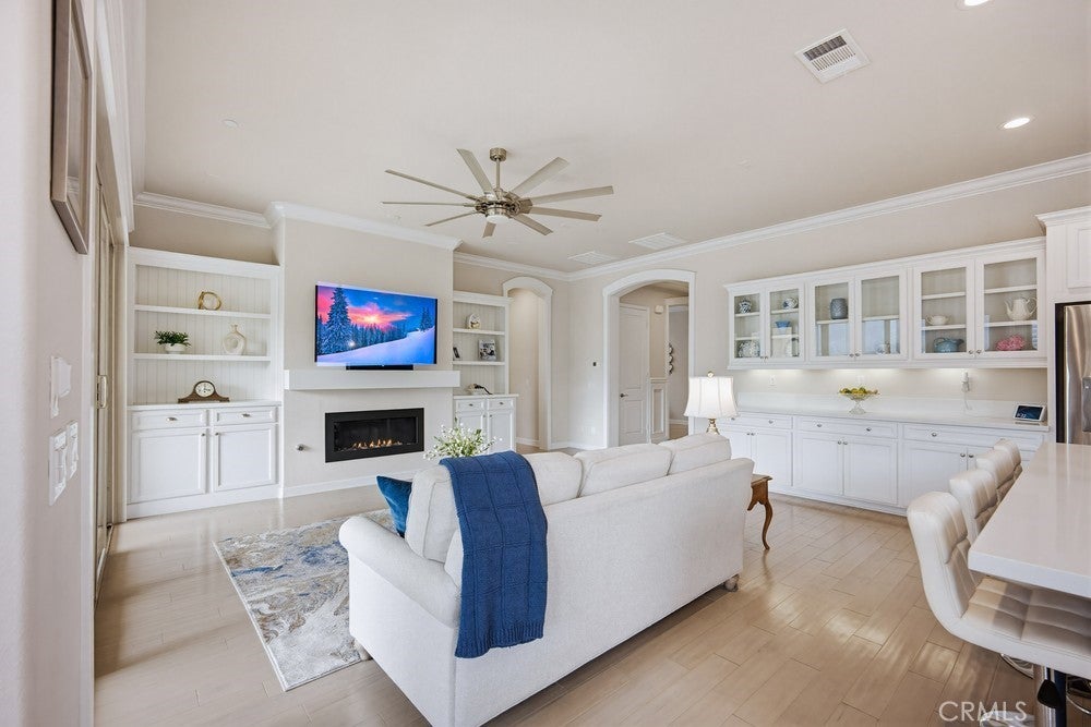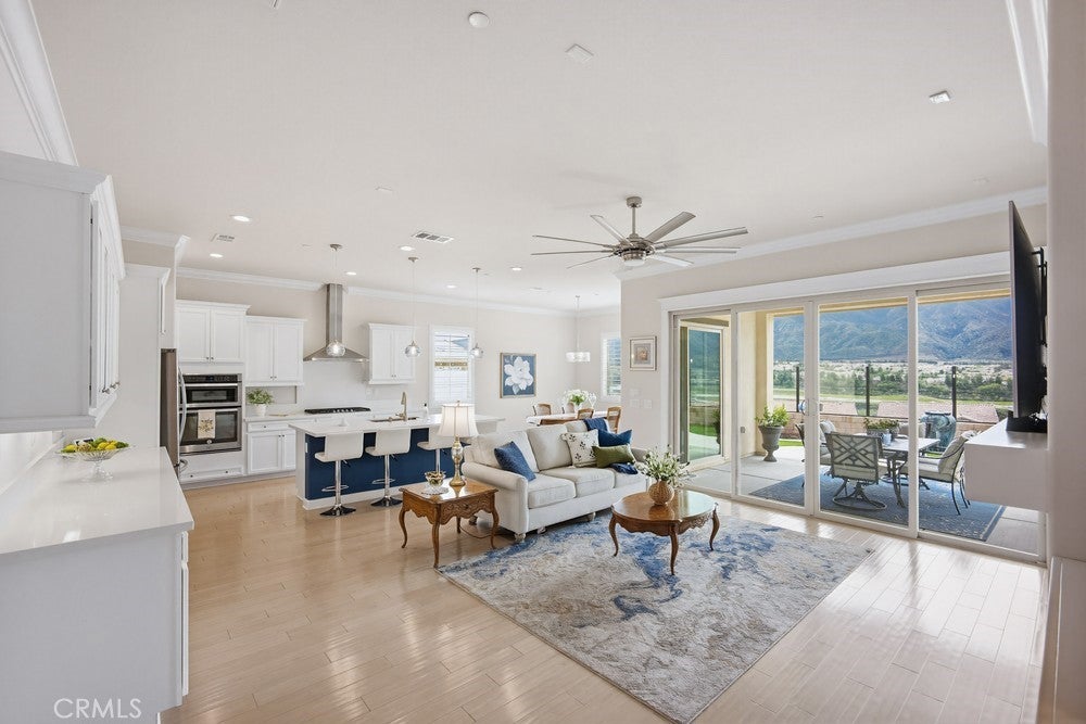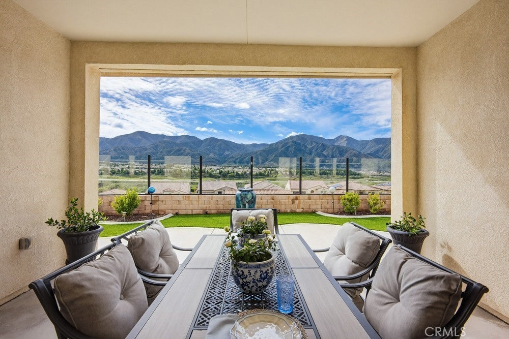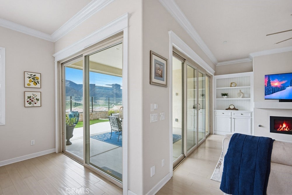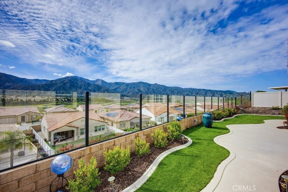 TURNKEY single-story home in the sought-after 55+ guard-gated community of Terramor offering 2,061 sq. ft., 2 bedrooms, 2 bathrooms, and a VERSATILE DEN with custom built-ins. A 42" entry door opens to an elegant interior featuring wainscoting, REAL WOOD FLOORING, and an OPEN-CONCEPT design with dramatic wall-to-wall sliding glass doors leading to the CALIFORNIA ROOM with breathtaking, UNOBSTRUCTED MOUNTAIN VIEWS. The gourmet kitchen boasts QUARTZ COUNTERTOPS, a large island with farmhouse sink, STAINLESS STEEL APPLIANCES including a 5-burner cooktop with hood, WALK-IN PANTRY, designer lighting, spacious dining area, and built-in buffet cabinetry. The living room features a built-in ELECTRIC FIREPLACE, custom shelving, surround sound provisions, and convenient floor outlets. The primary suite offers TRAY CEILINGS, WALK-IN CLOSET, WALK-IN SHOWER with skylight, and upgraded finishes throughout. Additional highlights include a skylit laundry room with cabinetry and utility sink, window shutters, central vacuum system, electric sunshade at the California Room, artificial turf, and installed gas line for future outdoor features. Enjoy RESORT-STYLE amenities including clubhouses, pools, fitness center, pickleball, tennis, bocce ball, dog parks, and an active social calendar. Luxury living with stunning views and thoughtful upgrades throughout.