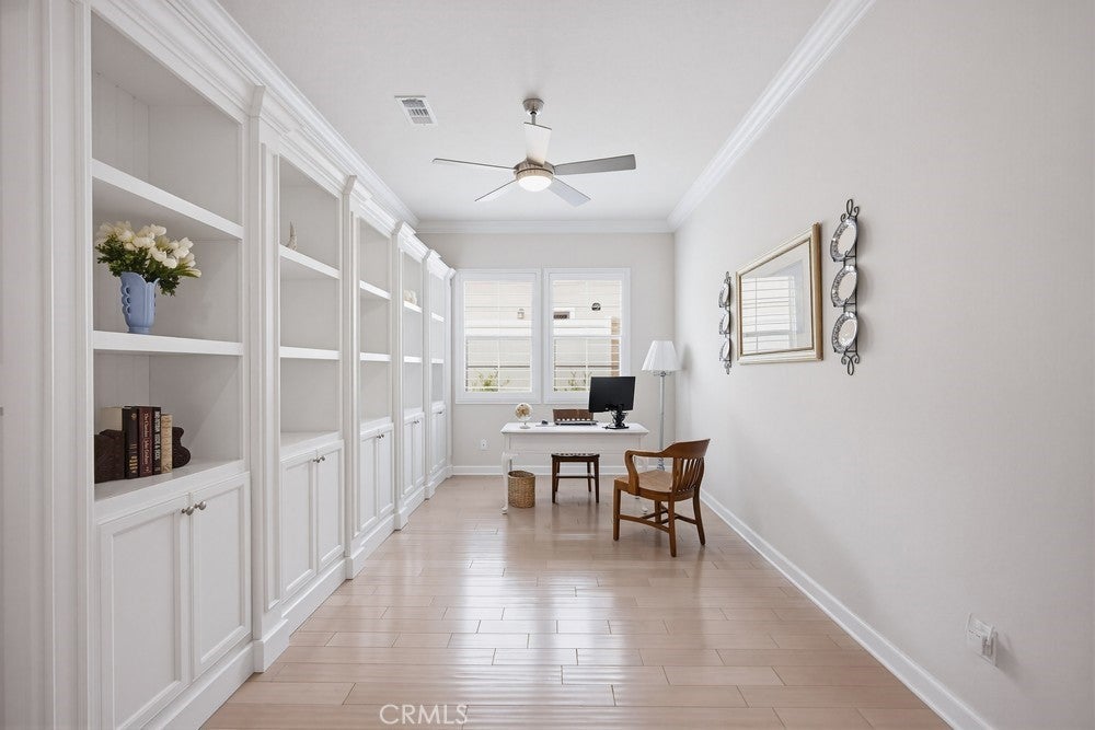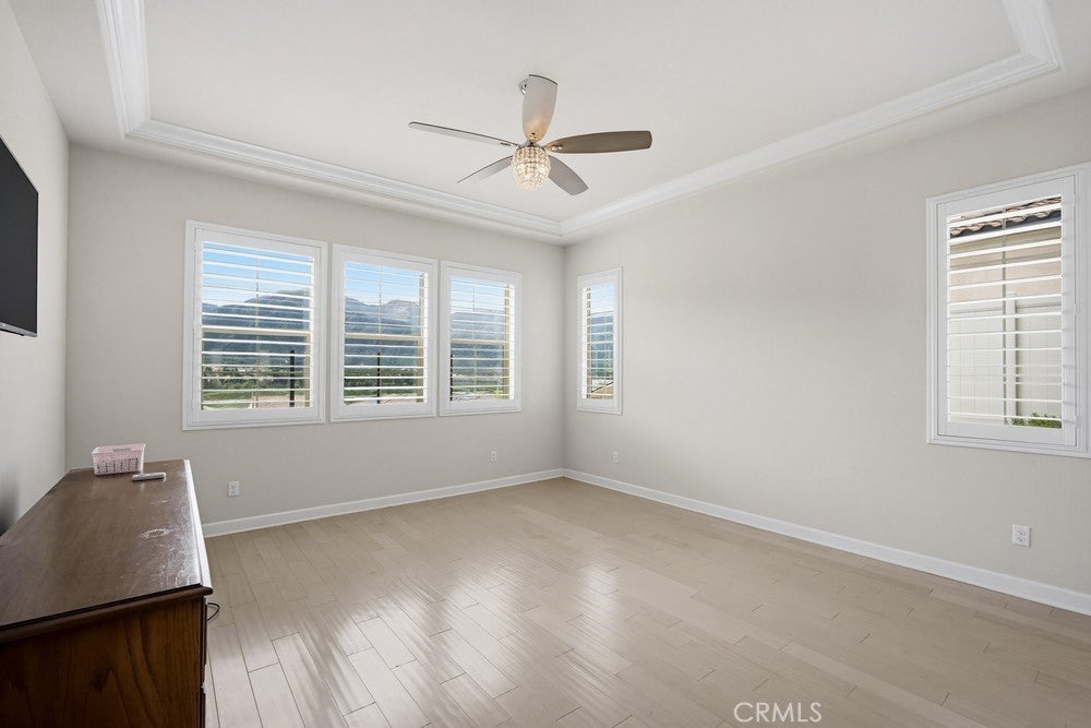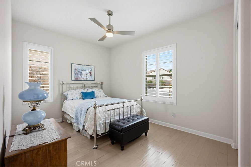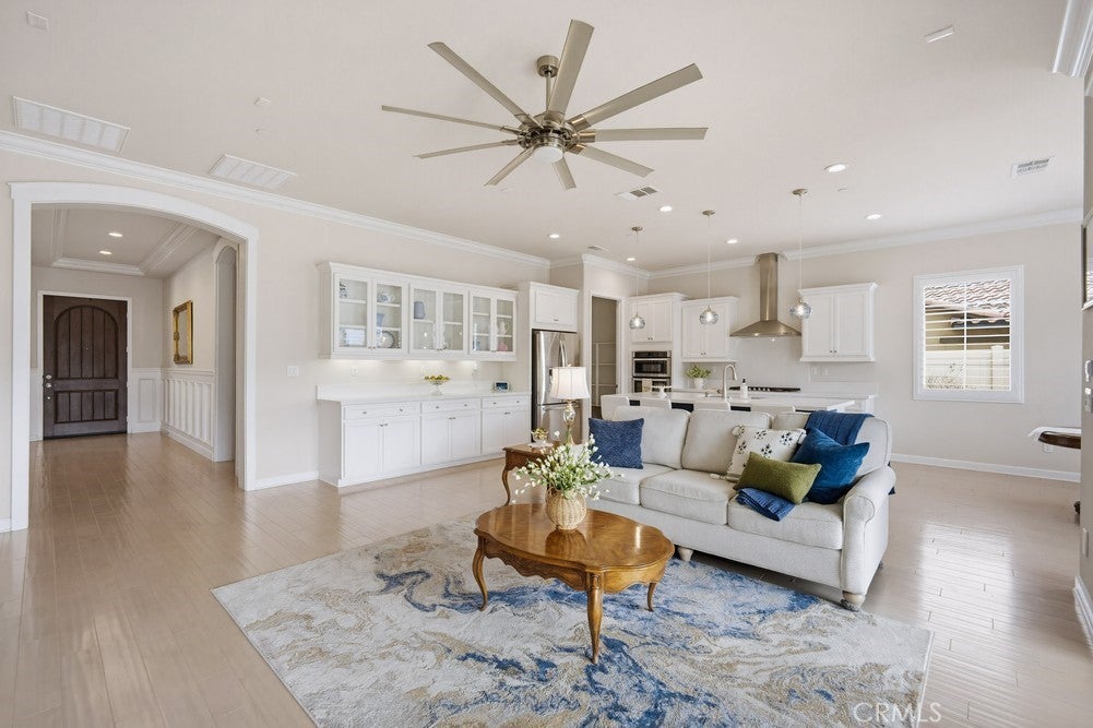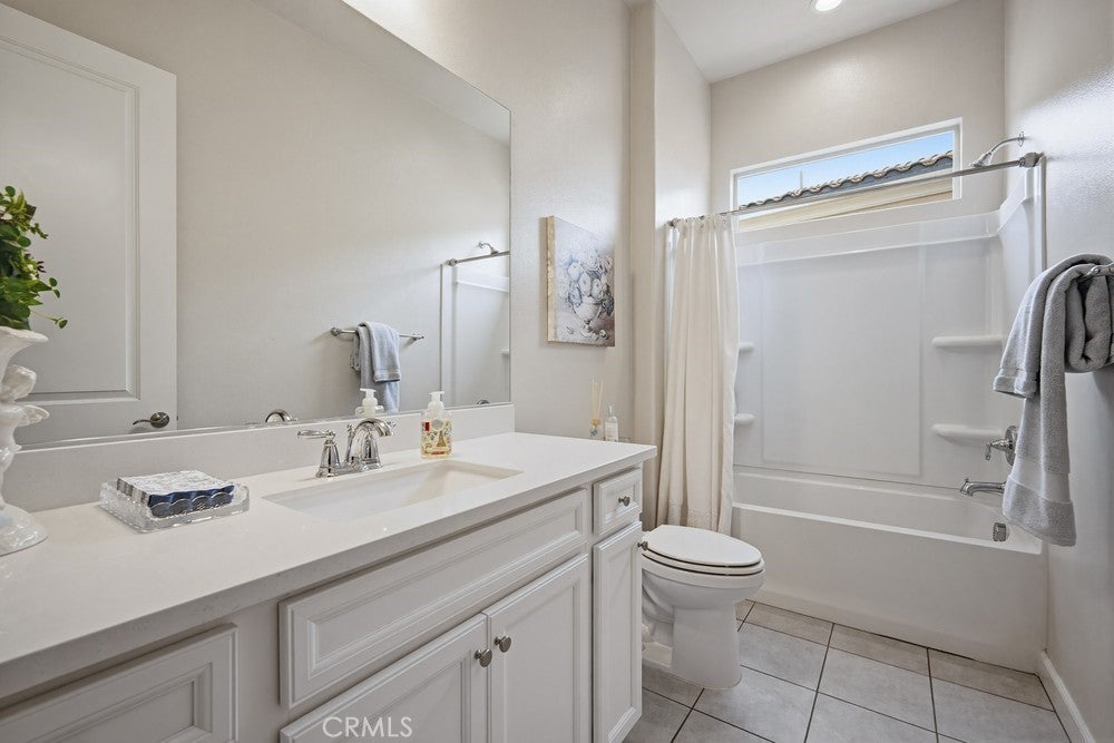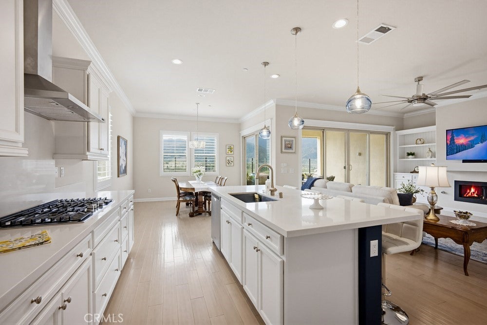 TURNKEY single-story home in the sought-after 55+ guard-gated community of Terramor offering 2,061 sq. ft., 2 bedrooms, 2 bathrooms, and a VERSATILE DEN with custom built-ins. A 42" entry door opens to an elegant interior featuring wainscoting, REAL WOOD FLOORING, and an OPEN-CONCEPT design with dramatic wall-to-wall sliding glass doors leading to the CALIFORNIA ROOM with breathtaking, UNOBSTRUCTED MOUNTAIN VIEWS. The gourmet kitchen boasts QUARTZ COUNTERTOPS, a large island with farmhouse sink, STAINLESS STEEL APPLIANCES including a 5-burner cooktop with hood, WALK-IN PANTRY, designer lighting, spacious dining area, and built-in buffet cabinetry. The living room features a built-in ELECTRIC FIREPLACE, custom shelving, surround sound provisions, and convenient floor outlets. The primary suite offers TRAY CEILINGS, WALK-IN CLOSET, WALK-IN SHOWER with skylight, and upgraded finishes throughout. Additional highlights include a skylit laundry room with cabinetry and utility sink, window shutters, central vacuum system, electric sunshade at the California Room, artificial turf, and installed gas line for future outdoor features. Enjoy RESORT-STYLE amenities including clubhouses, pools, fitness center, pickleball, tennis, bocce ball, dog parks, and an active social calendar. Luxury living with stunning views and thoughtful upgrades throughout.