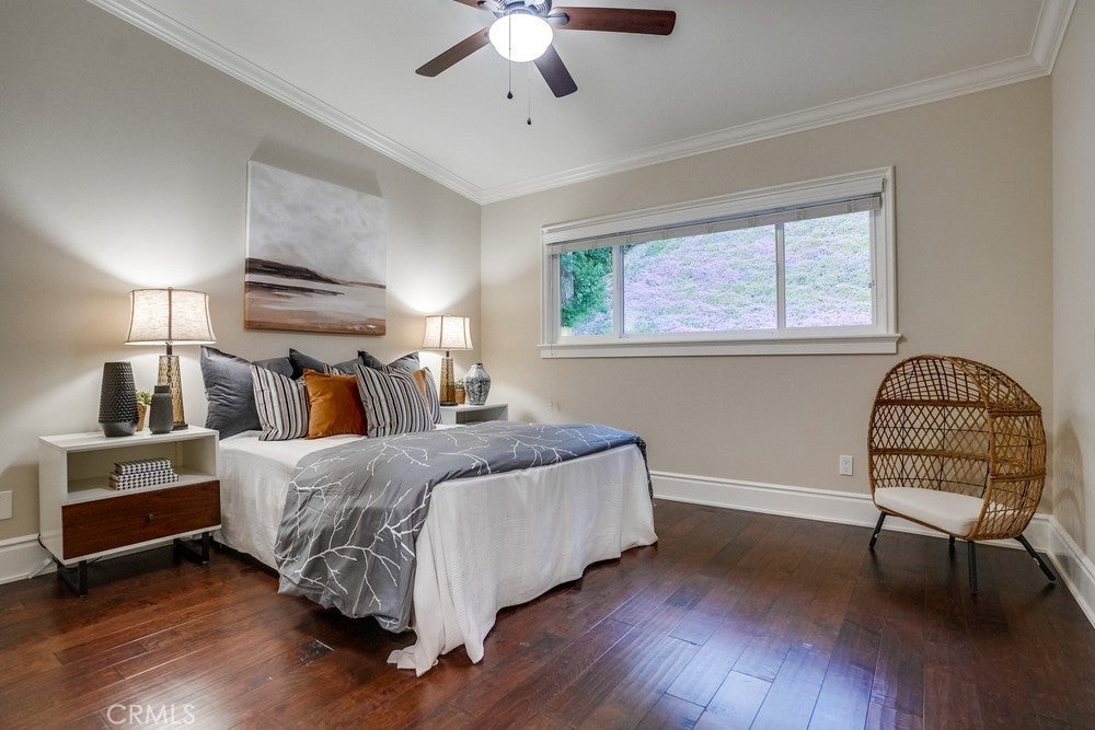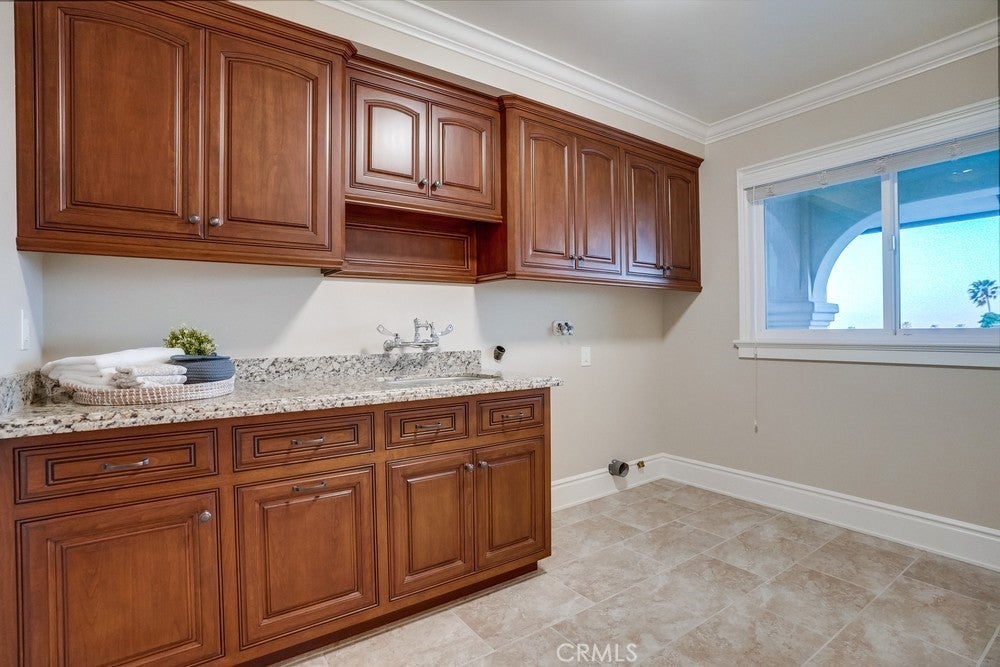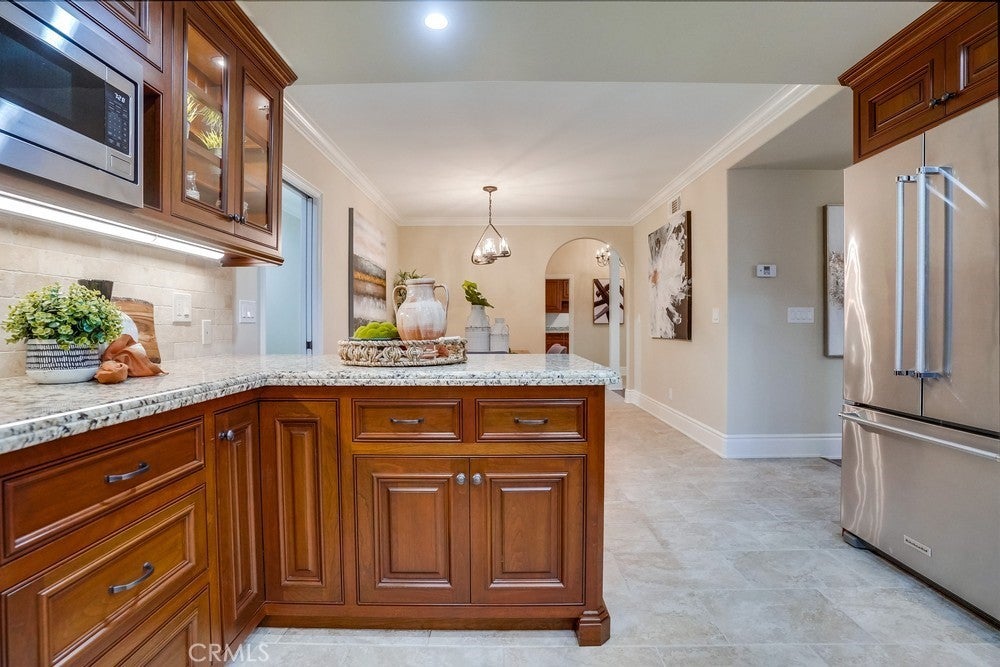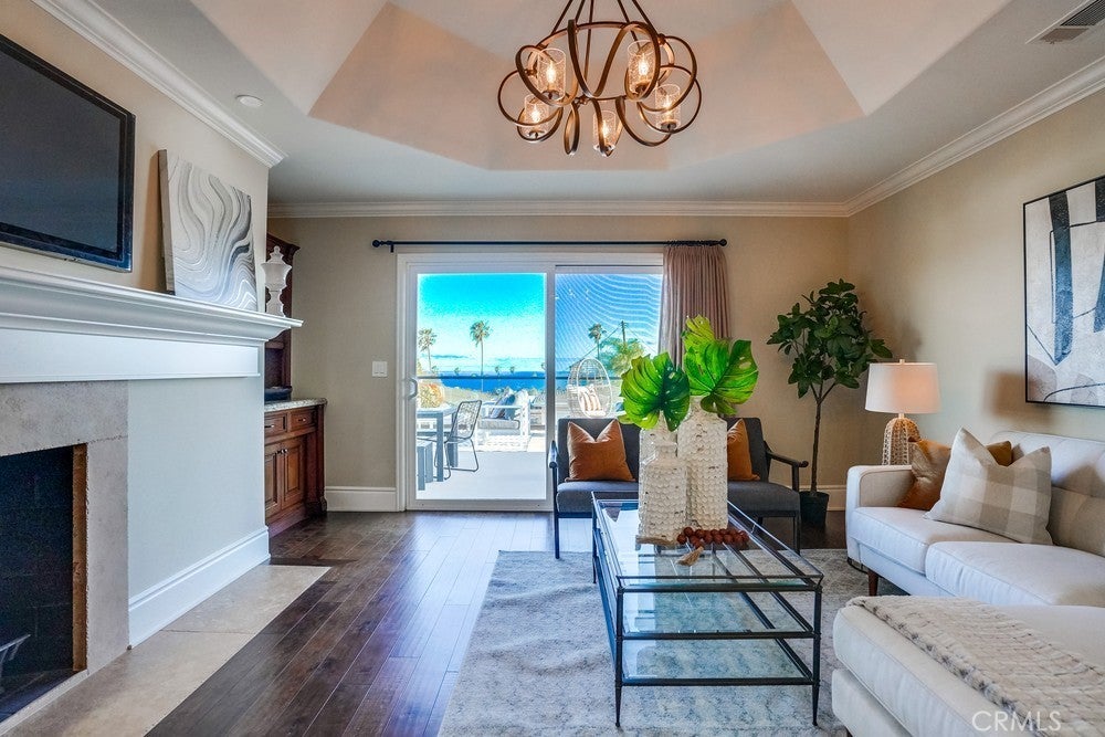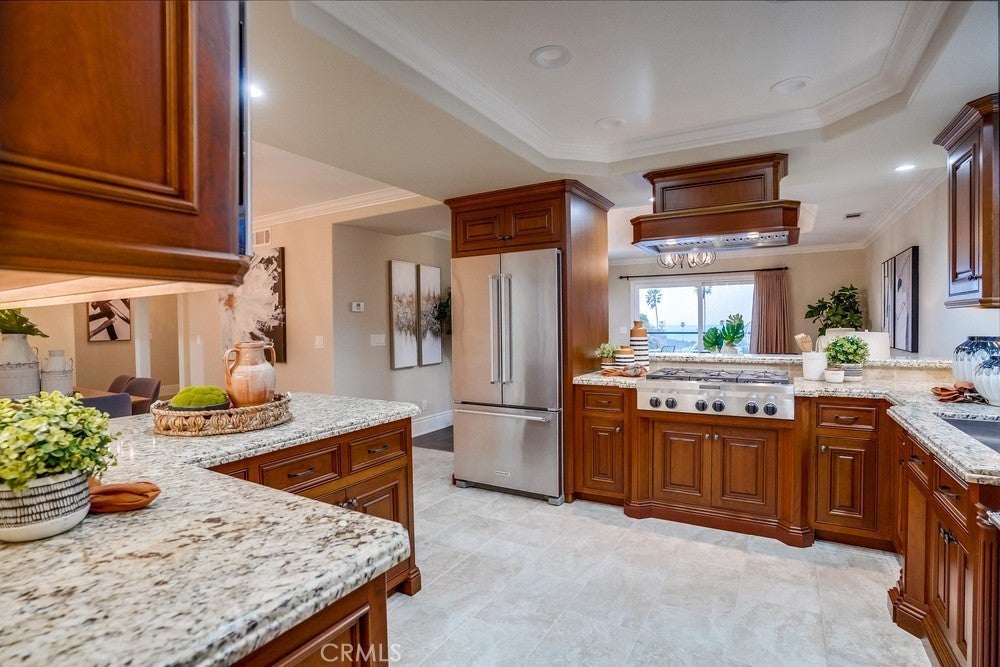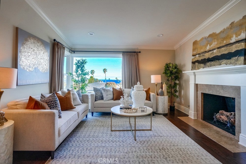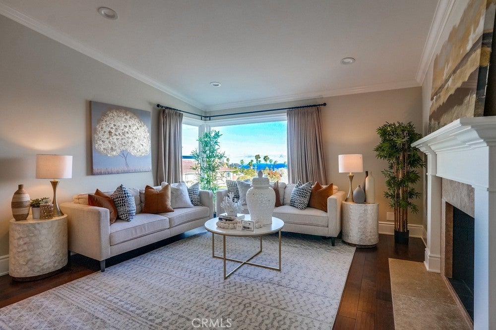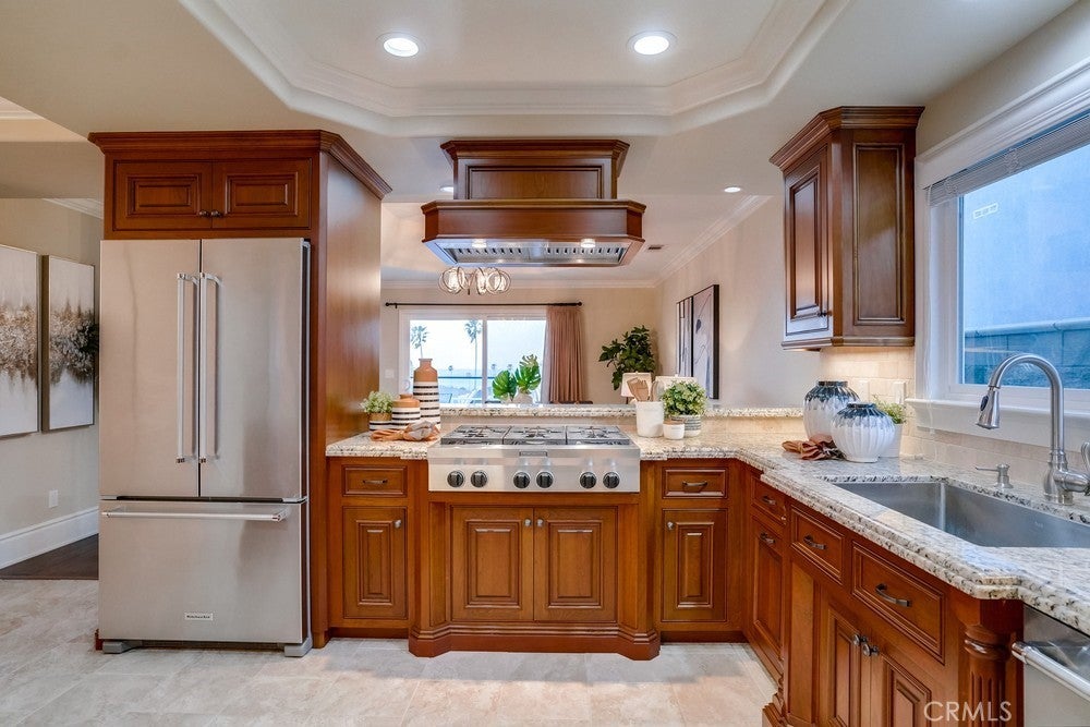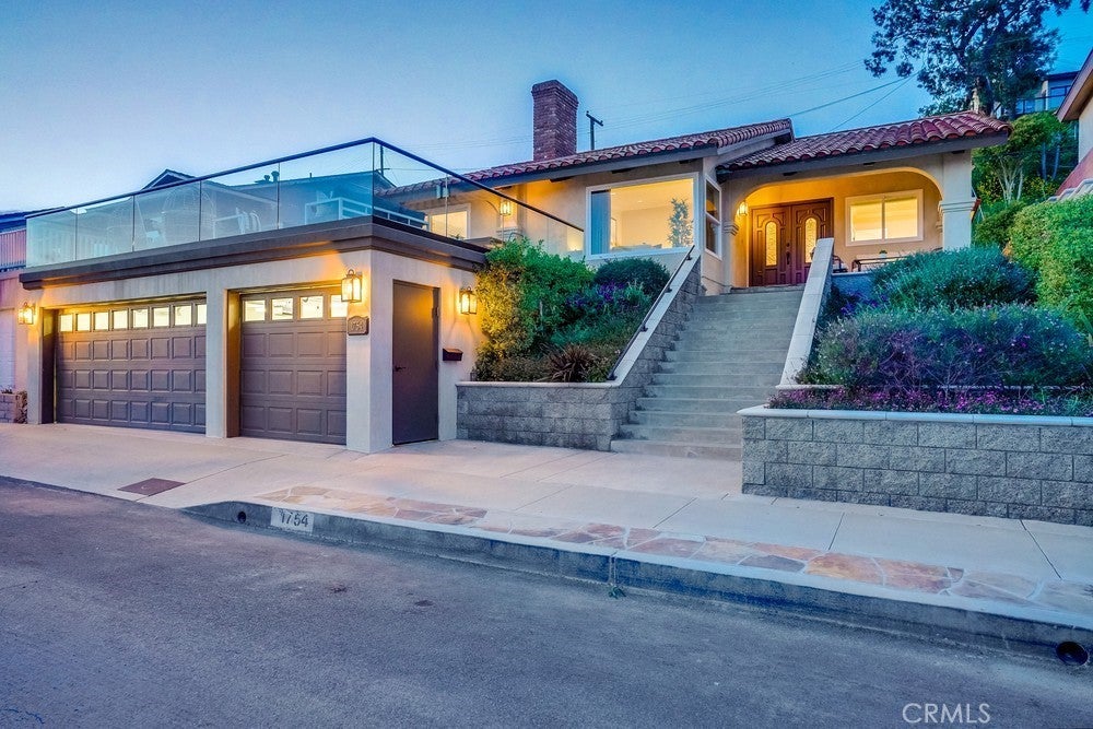 For the discerning buyer seeking a refined, low-maintenance coastal lifestyle, this Mediterranean-inspired villa delivers on every level. Nestled on a quiet cul-de-sac in the coveted Upper South Shores, the home enjoys unobstructed ocean and Catalina Island views from nearly every main living space. Cool afternoon breezes complete the relaxed, elevated feel of this special property. Completely reimagined with a focus on quality, this home offers timeless sophistication. It’s not for someone chasing fleeting trends—no stark whites or grays here. Instead, rich natural finishes and craftsmanship take center stage. Designed for those who value elegance and ease over excess outdoor space, this residence is effortless coastal living at its finest. Curb appeal is instant. A wide stone staircase leads through lush, manicured landscaping to a covered front porch trimmed in natural stone. Smooth stucco, a red tile roof, and patina copper accents complete the classic Mediterranean exterior. Through the double-door entry, you’re welcomed by soaring 10-foot ceilings and a large coat closet in the foyer. The formal living room features vaulted ceilings, a natural stone fireplace, built-in bookshelf and a large picture window showcasing panoramic views. An arched opening leads into the formal dining area and the upgraded kitchen, outfitted with custom wood cabinetry, granite countertops, walk-in pantry, and a travertine backsplash. Stainless steel appliances include a six-burner cooktop, counter-depth refrigerator, double oven, dishwasher, and custom hood. The adjacent family room offers a second fireplace, attractive tray ceiling, and sliding glass doors that open to a 600+ sq ft deck. With frameless glass railings and jaw-dropping views, it’s an ideal spot to relax or entertain. The private wing includes a spacious primary suite and two additional bedrooms, all with vaulted ceilings, wide-plank hardwood floors, and generous closets. Both bathrooms feature natural stone, granite, and custom cabinetry. A large indoor laundry room adds ample storage, a utility sink—and even an ocean view. Crown molding, Baldwin hardware, designer lighting, recessed lighting, and a spotless three-car garage complete this truly special home. ALSO FOR LEASE AT $5500/MONTH.