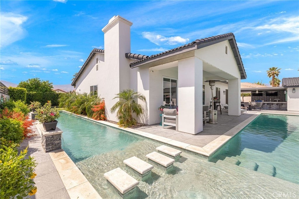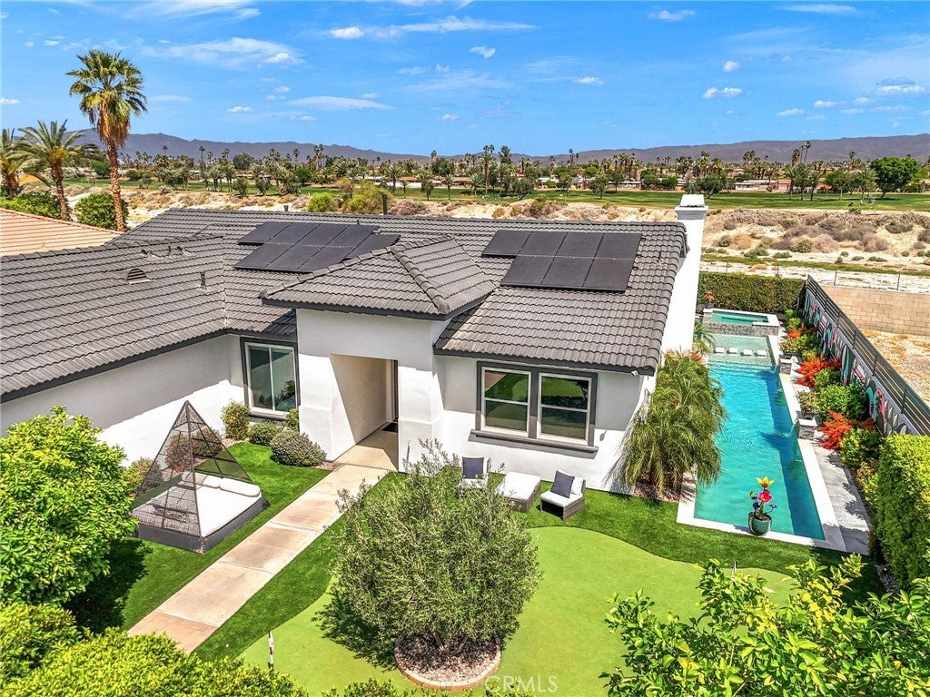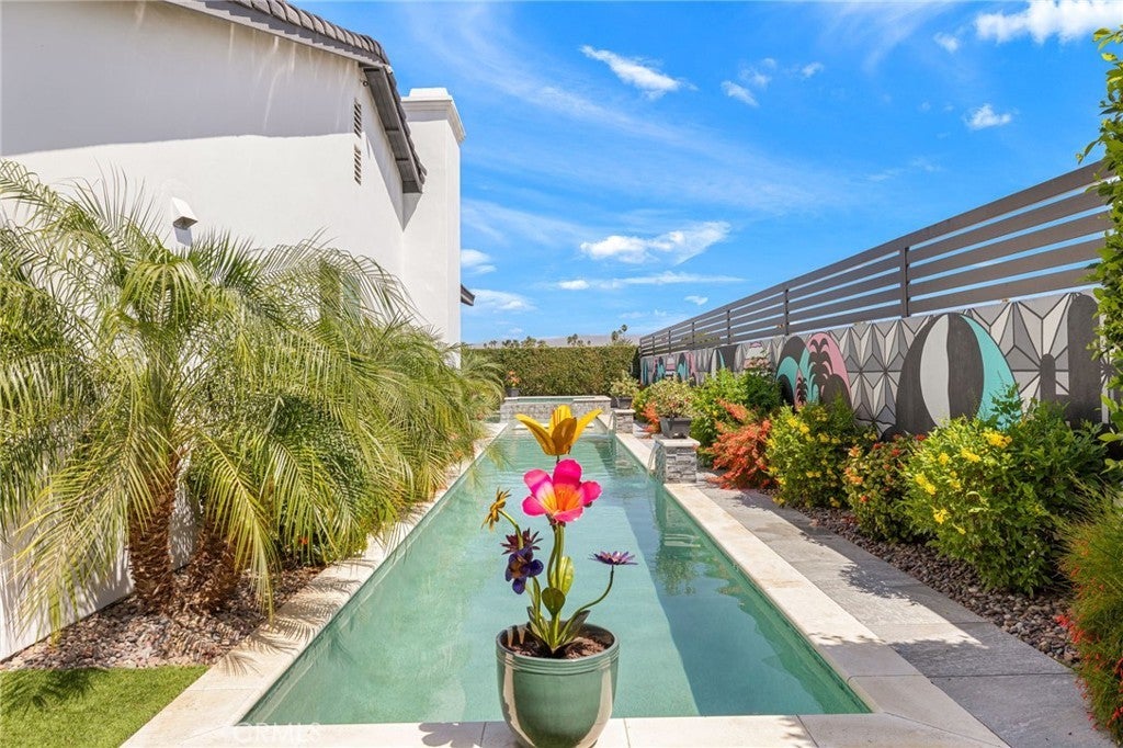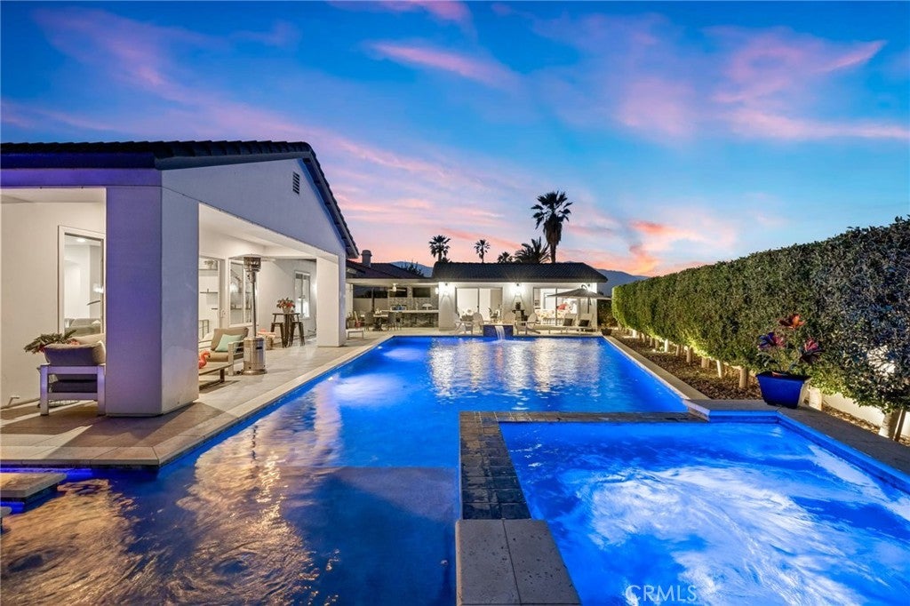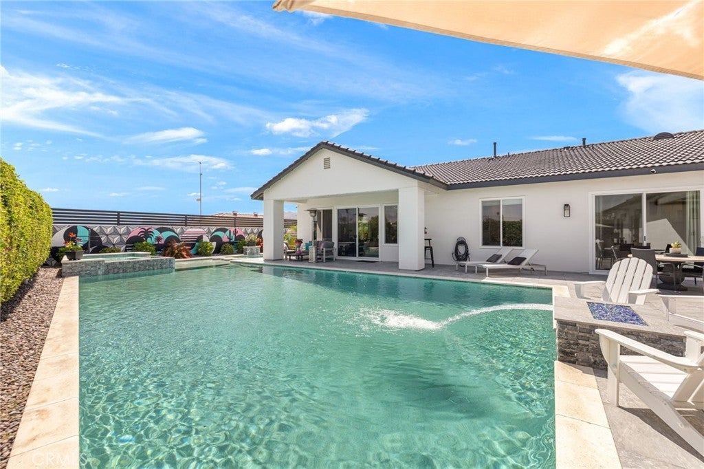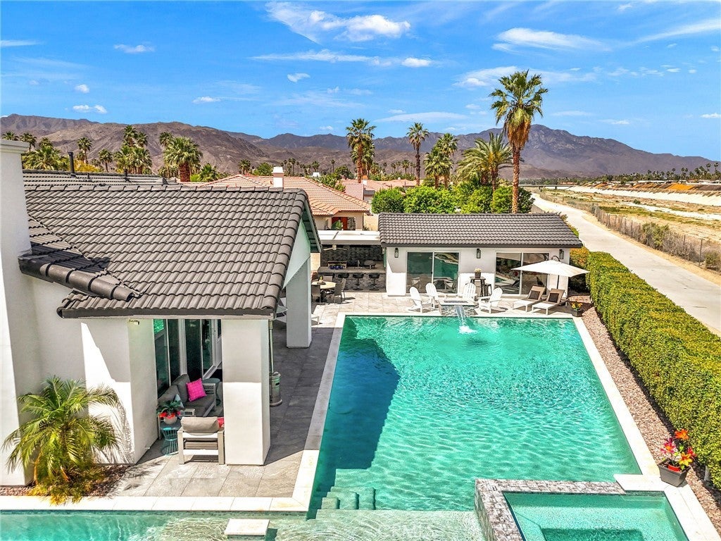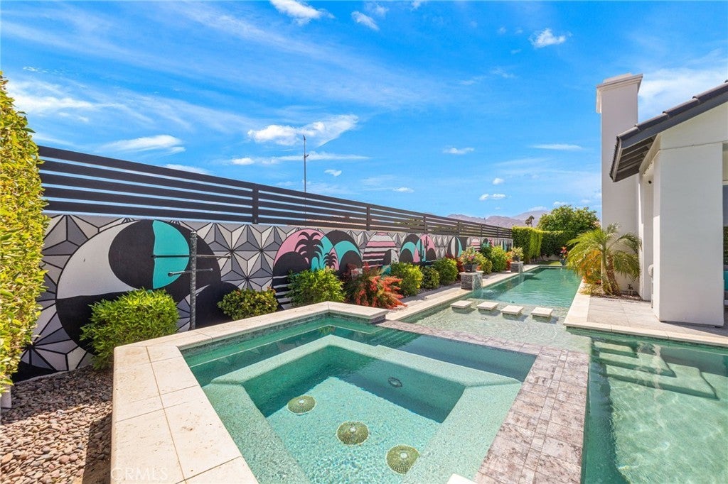 Welcome to one of Palm Desert’s most refined and private retreats, nestled on an expansive 10,454 sq. ft. lot in a coveted neighborhood setting. This newly reimagined home has been thoughtfully upgraded with luxury finishes and modern amenities, offering a seamless blend of indoor-outdoor living and resort-style sophistication. At the heart of the home is a designer kitchen outfitted with premium Viking appliances—elegant yet functional, ideal for both relaxed mornings and elevated entertaining. Natural light pours through brand-new windows and sliding glass doors, while newly remodeled showers and a brand-new A/C unit enhance everyday comfort. Outside, a private oasis awaits: a 52-foot lap pool, a stunning 40’x25’ smart-controlled designer pool, and a 10-person spa anchor the showstopping outdoor experience. A putting green, citrus trees, and lush hedging frame the grounds, while multiple dining and lounge areas—complete with a pizza oven, bar seating, and two LED TVs—set the tone for unforgettable gatherings. A striking 70-foot mural by celebrated artist Steven Van Art adds a one-of-a-kind Coachella-inspired backdrop. Previously a successful high-end vacation rental favored by celebrities, athletes, and musicians, this estate offers an extraordinary opportunity—whether as a full-time residence, seasonal escape, or investment.