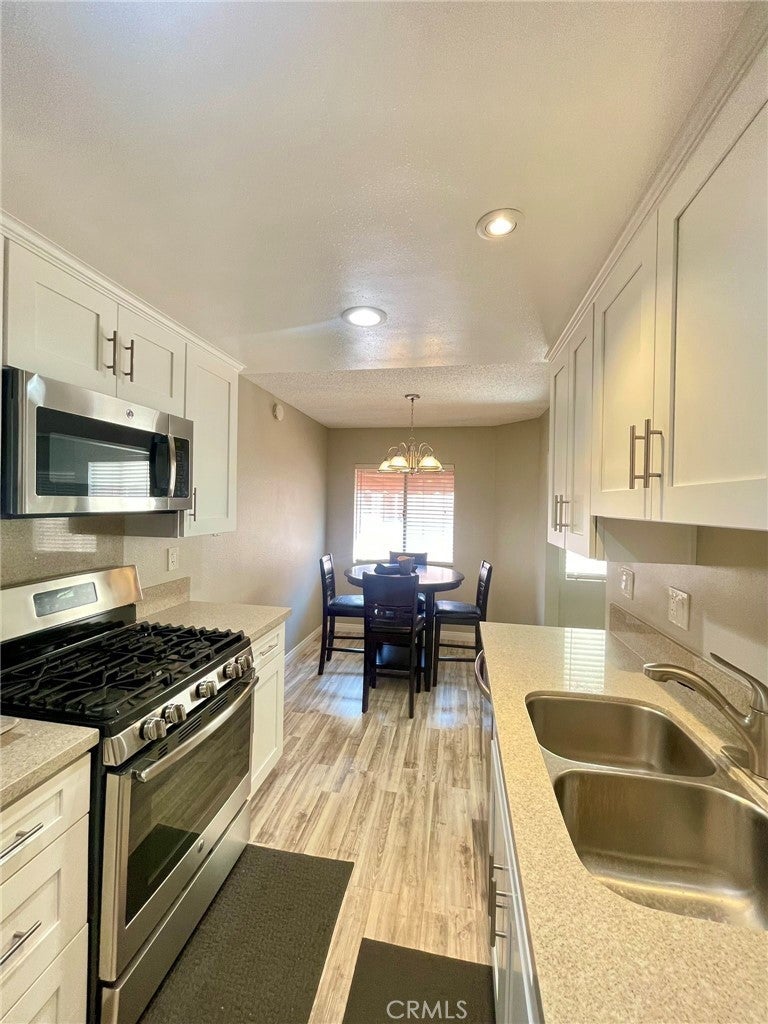 This spacious and beautifully updated top-floor unit offers 2 generous bedrooms and 2 full bathrooms. The updated and modern kitchen features stylish Shaker cabinets, Quartz countertops, a stainless steel sink, recessed lighting, and stainless steel appliances. It opens seamlessly into the dining area, highlighted by modern laminate flooring. The inviting living room boasts a gas fireplace, smooth ceilings, and recessed lighting. The primary bedroom offers soaring ceilings, mirrored wardrobe doors, and a private balcony. Newly installed HVAC & water heater in 2024. Additional features include an in-unit laundry room, central location at the rear of a charming garden-style complex, gated subterranean 2 car tandem parking, and access to a community pool. Conveniently located near the 405 freeway, with shopping, dining, and entertainment just minutes away—this home is perfect as a primary residence or an excellent investment opportunity.
