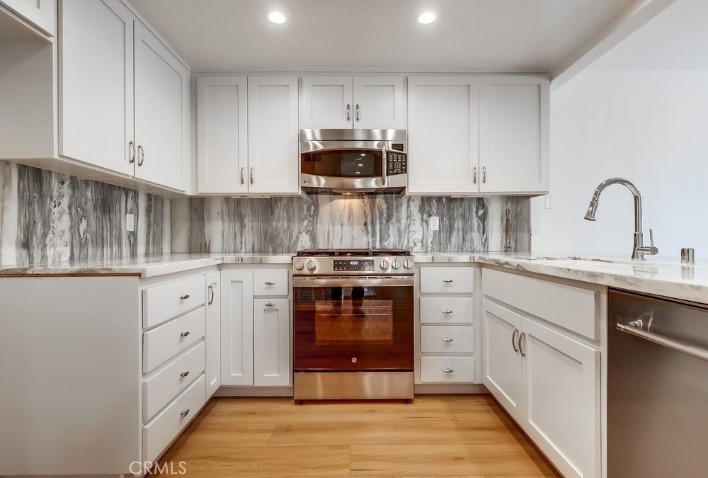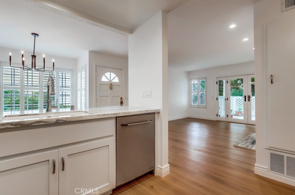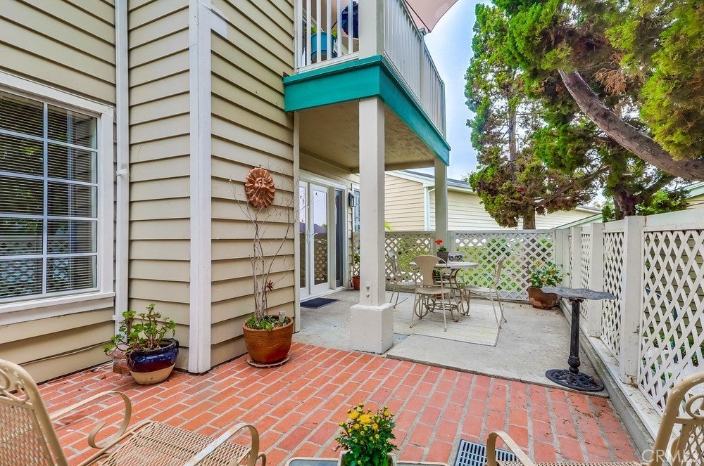 Enjoy a low-maintenance carefree lifestyle with this impeccably upgraded and move-in ready lower unit nestled amongst the mature landscaping that is a signature feature of the Harbor Gate North community. Spacious living area features an attractive fireplace with custom granite surround and upgraded French doors that open up to the wonderful private patio that is plenty large enough for weekend barbecues or just relaxing with a glass of wine after a hard days work. Attractive wide-plank vinyl flooring has just been installed throughout the living room, dining area, kitchen and hallway with plush low-ply carpeting warming up both bedrooms. Tastefully remodeled kitchen has been opened up to be more accessible to the living area and features custom white cabinetry, luxurious granite counters & backsplash, stainless steel appliances and a breakfast bar that has been altered to finish at the same heiight as the counters to create a more functional space. The sunlit dining area is perfectly located with easy access to both the kitchen and living area. Located at the end of the hall is the spacious primary suite that includes a walk-in closet and a nicely upgraded full bath. Second bedroom makes for the perfect guest bedroom, office or nursery and is located near the nicely upgraded hall bath that includes access to the conveniently located indoor laundry room. Additional interior amenities include fresh paint, recessed lighting and plantation shutters. Harbor Gate North is one of the few condominium complexes at this price point that offers a large PRIVATE two car tandem garage. With this particular unit the garage is in very close proximity to the unit so it's even more of a bonus.That's right, no common area subterranean parking to deal with on this one but there is plenty of guest parking for friends and relatives. No time to take a vacation? No worries, the cascading waterfalls and lush greenery that frame the community pool and spa area create a resort-like atmosphere that will make you feel like you're on vacation year round. This community is also in a very walkable location with grocery shopping, dining, banking and movie theatres only a few blocks away. For those who do still commute to work, there is quick and easy access to the freeways. If you're looking for a place you can move right into and immediately start enjoying the benefits of the lifestyle it offers, this unit is the one for you. HURRY!!