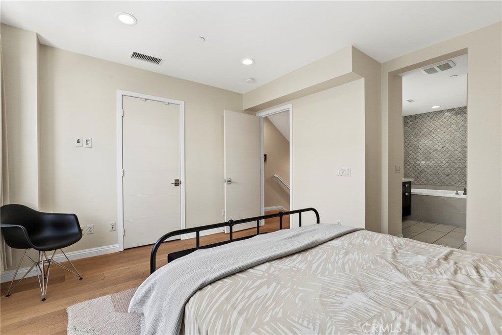 Welcome to this move in ready beautiful modern Craftsman home in the heart of Hollywood. Built in 2015 this wonderful property is listed as a Single family residence and there are no HOA fees, Each owner has there own Water and power separately metered, also a convenient short walk from Hollywood & Vine and Hollywood & Highland. The walkway to the home has a well maintained green space with hedges and drought tolerant plants throughout. The color palate of this home is soothing and can be mixed with many different decoration styles.. This amazing home also has Beautiful newer wood like flooring (with the exception of the Living room and Kitchen).The entry First floor has a bedroom as you walk in to the left with its own private full bathroom and is convenient when you have guests or as a personal office space/retreat. This first entry space has convenient direct access to the 2 Car garage with the added bonus of an EV charger. The second level will greet you with an open concept kitchen with Bosch stainless steel appliances, subway tile backsplash, and European quartz countertops. It's ample in size and spacious enough to have more than one cook in the kitchen at a time. The adjoining Living room area has an expansive layout with high ceilings and a small balcony area and lots of natural light, There is a built-in nook for your Large screen TV. Upstairs, on the Third level the primary suite also has an open feel with high ceilings and lots of natural light., a walk-in closet, and a view of the Hollywood sign. The ensuite bathroom is Beautiful— with shell-pattern marble mosaic tile and unique hardware. Of Course there are his-and-hers sinks, a deep soaking tub, and a glass-enclosed shower accented with the same shell-pattern marble mosaic tile and Brushed gold hardware.. The Hallway is where your stackable LG washer and dryer are located inside of its own space which makes it convenient to do the laundry instead of having to travel to a farther area of the house. The second bedroom also has the same inviting newer floors and large windows with lots of light coming through. There is also a third full bathroom. Head up to the rooftop deck large enough to entertain and Barbecue, and take in sweeping views of the Hollywood hills, Iconic Hollywood sign and the city views. This home is also centrally located and very walkable. In close proximity to all major shopping and cafes.