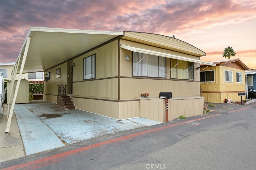 Welcome home to Space 197 in the desirable Knolls Lodge community! This well-maintained 3-bedroom, 2-bathroom home offers a comfortable layout and a great Torrance location close to shopping, restaurants, and schools. Step inside to a bright and welcoming living and dining area featuring a fireplace that adds warmth and charm to the space. Continue past the living room to find the laundry area, complete with a modern washer and dryer. To the right, the galley-style kitchen features laminate countertops and sparkling stainless-steel appliances, including a freestanding range, refrigerator, and microwave, all conveniently located opposite the sink and cabinetry for a practical and efficient setup. Just off the kitchen is the front bedroom, perfect for guests, a home office, or a flex space. Back through the living room, you’ll find a hallway leading to the second bedroom, the remodeled ¾ bathroom, and the primary bedroom suite at the end for added privacy, featuring a remodeled ensuite full bathroom and a spacious walk-in closet. Outside, enjoy a covered carport with parking for two vehicles and a storage shed for added convenience. Residents of Knolls Lodge enjoy access to two sparkling pools, a recreation room with a fireplace and game area, and beautifully maintained landscaping. The community is pet-friendly (with breed and size restrictions) and offers visitor parking for your guests. Don’t miss your chance to own this charming and thoughtfully designed home in one of Torrance’s most welcoming communities!