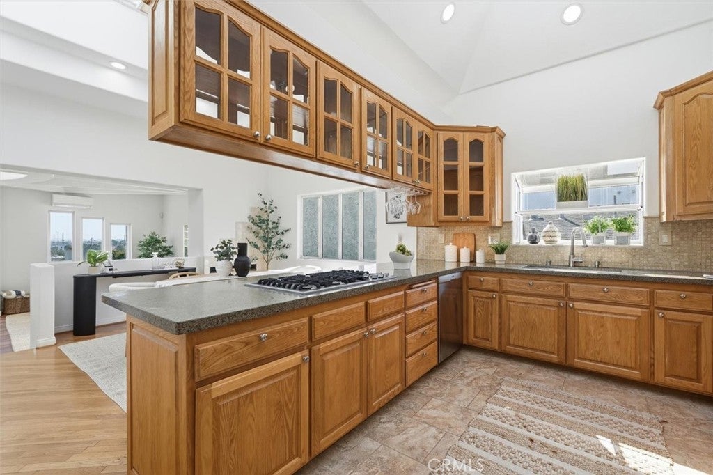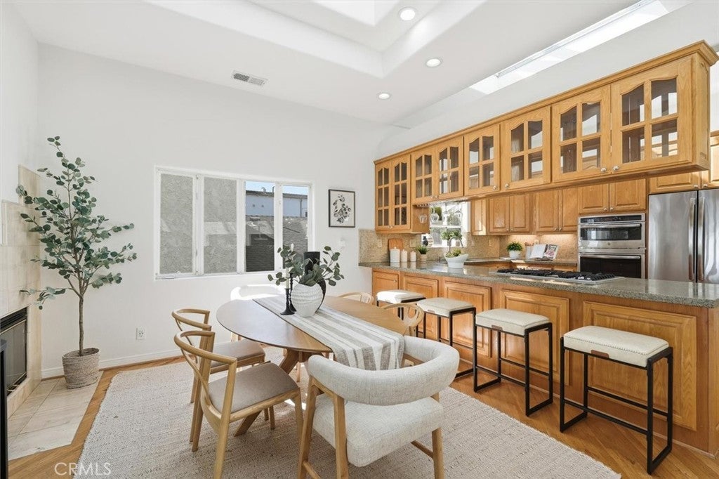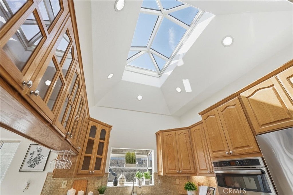 ** Amazing Rare Opportunity** This light-filled, unique contemporary home with many amenities offers elevated living experience in style, with soaring skylights and wide mountain and city views. The spacious, functional floor plan creates an effortless flow throughout. Picture yourself each morning in the spacious primary suite with extra sitting space, fireplace and walk-in closet, and adjacent bathroom where "starry sky" LED lights illuminate your ceiling and heated floors warm your feet. The newly-designed spa-like bathroom features Toto dual sinks, a rimless glass shower with Grohe fixtures and jacuzzi tub, while modern chandeliers and automatic Hunter-Douglas shades cocoon you in perfect tranquility. Your gourmet kitchen features professional-grade stainless steel appliances such as Bosch, Jen-Air, GE and a large skylight up above. The whisper-quiet full climate control with micro filtration system maintains perfect comfort. Smart home WiFi devices make maintenance effortless from the heat-reflecting roof to advanced water management, plus Ring security. Move-in ready with appliances including refrigerator, washer and dryer. Conveniently located near freeways, shops, schools, and LAX.