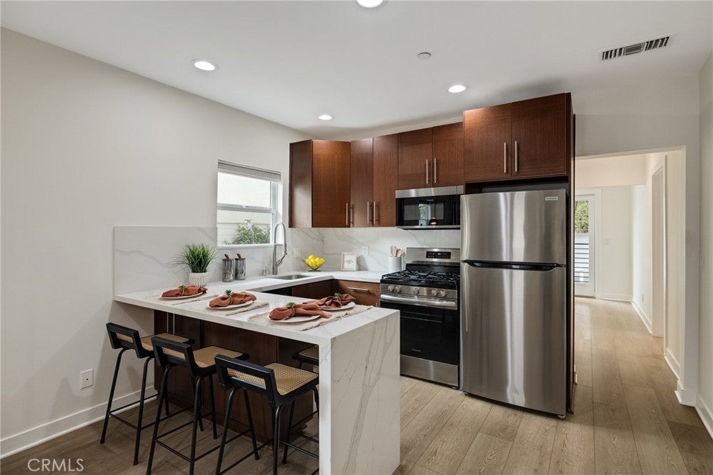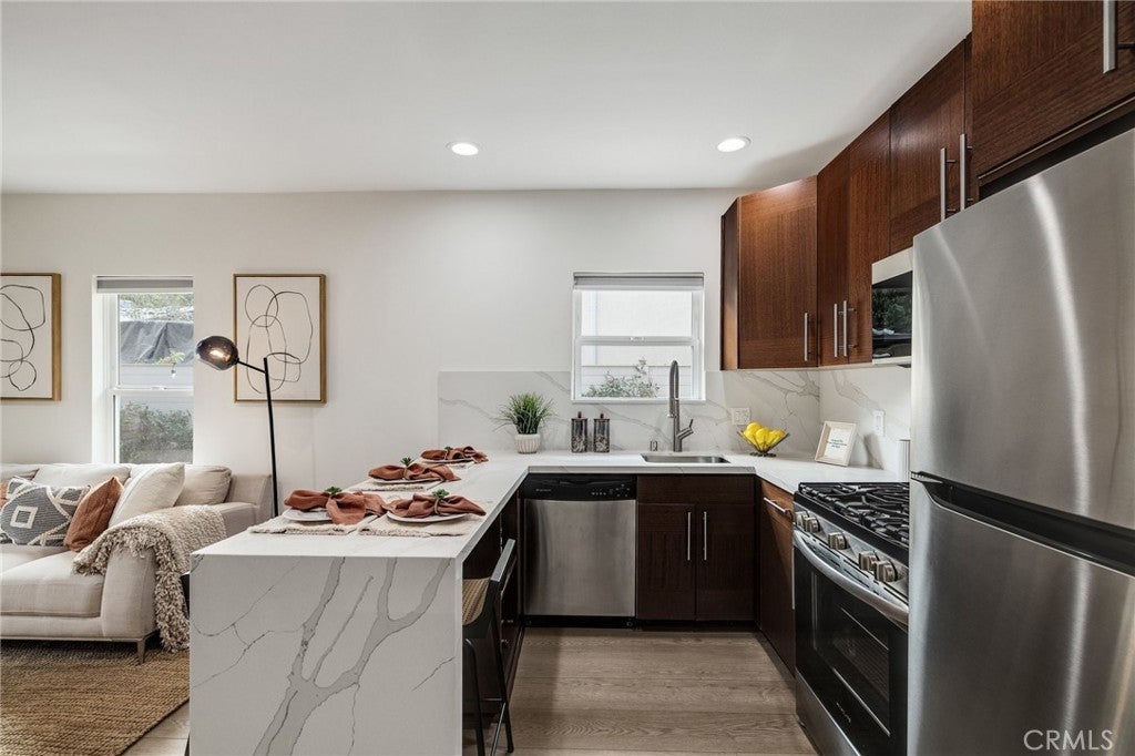 Welcome to 724 San Miguel Ave, a beautifully updated single-family home nestled in the vibrant heart of Venice. Just a short walk from the iconic Abbott Kinney Blvd and the stunning Venice Beach, this residence offers the perfect blend of charm and modern convenience. This recently renovated 3-bedroom, 3-bathroom home boasts a host of upgrades, including new quartz kitchen countertops, state-of-the-art kitchen appliances, a brand-new HVAC system, and elegant engineered hardwood floors. The interior and exterior have been freshly painted, complemented by recessed lighting throughout. Upon entering, you'll find an open-concept living area that seamlessly connects the kitchen and living room. The entry-level features two bedrooms, each with large walk-in closets and dual-pane windows that flood the rooms with natural light. The back primary bedroom includes an en-suite bathroom and opens up to a private backyard patio and charming yard. Additional storage is available in the spacious attic, easily accessible via a pulldown ladder. Upstairs, discover a bright and cheerful third bedroom with its own en-suite bathroom, ample closet space, and a private porch—perfect for enjoying your morning coffee. Outdoor enthusiasts will appreciate the ultra-private fenced-in yard with multiple areas for entertaining. Parking is convenient with space for two cars in tandem in the driveway and additional street parking available. Don't miss your chance to own this stunning home in one of Venice's most sought-after locations. Schedule a viewing today before it's SOLD!