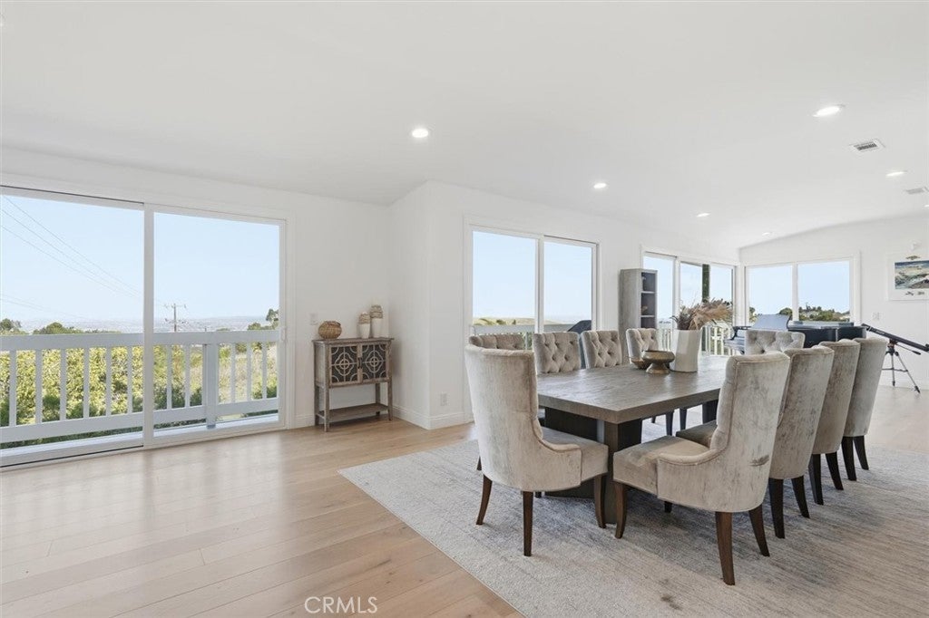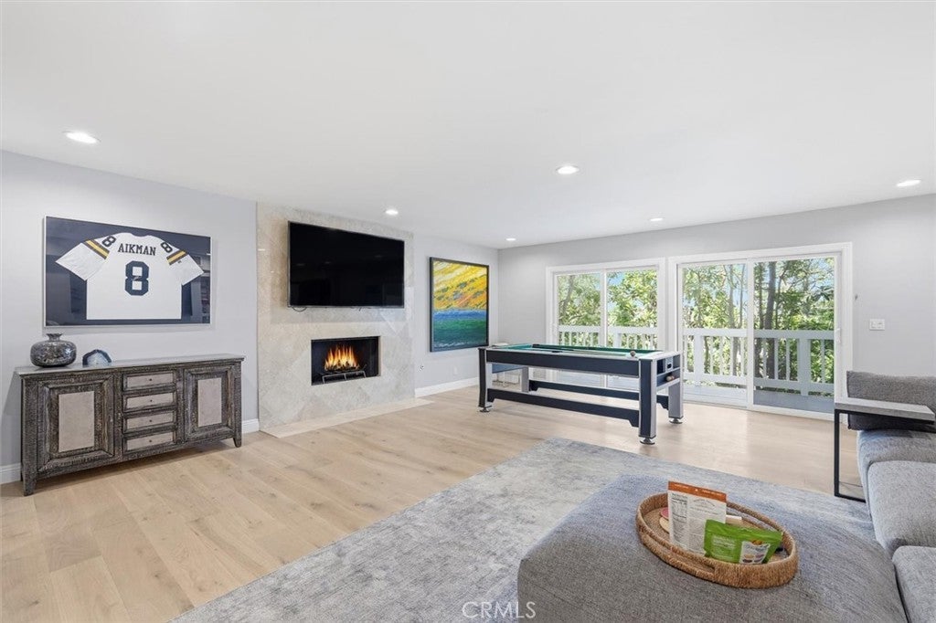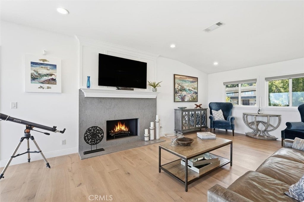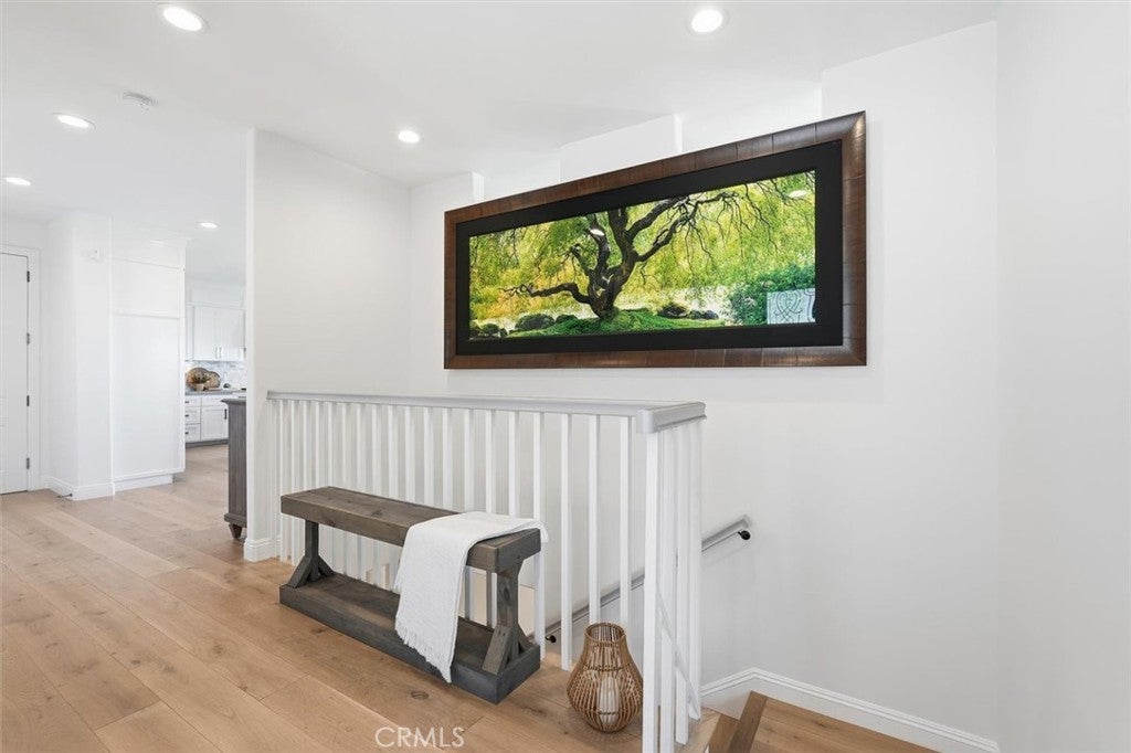 From the moment you walk through the front door, this home unfolds in layers—from a quiet entryway to a sweeping hillside and city-lights view that catches you completely by surprise. It’s the kind of setting that feels worlds away, yet remains close to everything. Surrounded by mature trees and parkland, the property enjoys rare privacy and an open, natural backdrop—an uncommon luxury for “L.A. living.” Natural light pours across wide-plank white oak floors, guiding you through an open, connected main level where the living, dining, and kitchen flow effortlessly toward a continuous view deck. Expansive windows frame the hills and shimmering skyline beyond the park, filling the home with a sense of calm and space that only the Palos Verdes hills can offer. The kitchen was designed for those who love to cook, host, and gather. Outfitted with premium Thermador appliances, dual dishwashers, under-cabinet wine refrigeration, and a walk-in pantry with extra pull-out storage, it blends beauty with function. Shaker cabinetry and natural stone counters tie it all together, leading to a living area anchored by a sleek modern fireplace—where evenings unfold with the distant glow of city lights as your backdrop. Downstairs, all bedrooms are thoughtfully grouped to create a peaceful retreat separate from the main living spaces—ideal for households that love to entertain. Two primary suites offer flexibility for guests or multi-generational living, while the main suite elevates the experience with dual mirrored closets, a walk-in, motorized blackout shades, and a spa-style bath with soaking tub and oversized shower. A large family/game room with second fireplace and wet bar opens to a private, low-maintenance yard. A dedicated office and laundry room—each framed by barn doors—add both charm and practicality. Smart-home features include dual-zone Nest climate control and a Ring doorbell system. The three-car garage with workshop provides direct access to the kitchen, plus ample additional parking. Beneath it all, a partially finished bonus area—currently used as a gym—offers even more potential. With its generous dimensions and separate access, it could easily evolve into an expanded living space, studio, or ADU. Balancing connection and seclusion, this home delivers the best of both worlds: the ease of everyday access, the prestige of Palos Verdes schools, and the peace of hillside living—complete with a front-row view of city lights behind the parkland.