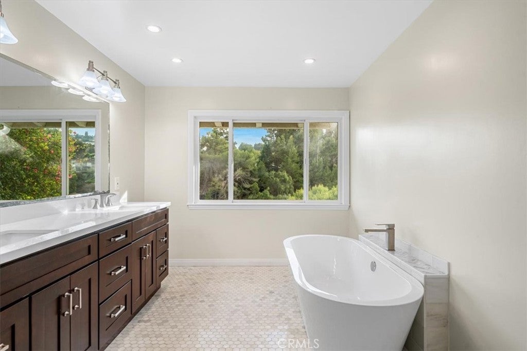 Experience exceptional Southern California living in this beautiful 4-bedroom 3-bathroom home with a versatile bonus room, offering 2,800 sq ft of interior living space set on an expansive 22,637 sq ft lot. Nestled on a tranquil tree lined street in one of Rolling Hills Estates’ most sought-after neighborhoods, this "Ranchview" home delivers an unmatched lifestyle of privacy and convenience. The open-concept living and dining areas are filled with natural light and designed for both relaxed everyday living and the epitome of indoor-outdoor entertaining. The well appointed kitchen flows directly out to the backyard where you're greeted with both open and covered patio areas, an outdoor BBQ island, and a gas firepit to make entertaining and dining alfresco a breeze. There are three spacious bedrooms downstairs to provide comfort for family and guests, while the bonus room offers flexibility for a home office, fitness room or a guest room. The cozy fireplace, which is situated in the middle of the living rooms, provides warmth and ambiance for those chilly evenings. Retreat to the primary suite upstairs, complete with a spa-inspired ensuite bathroom, walk-in closet, and peaceful garden views. In addition to the patio and grassy area, the backyard unfolds several levels down the canyon, creating a picturesque natural escape. Wander down through terraced gardens filled with a variety of mature fruit trees, offering the joy of homegrown produce and endless opportunities for gardening and exploration. With its generous lot size, natural surroundings, and spacious interior, this home is truly a rare find. Located minutes from top-rated schools, scenic equestrian and hiking trails, tennis clubs, and upscale shopping and dining, this timeless property captures the very best of Rolling Hills Estates living. Don't miss your chance to make this exceptional residence your own!