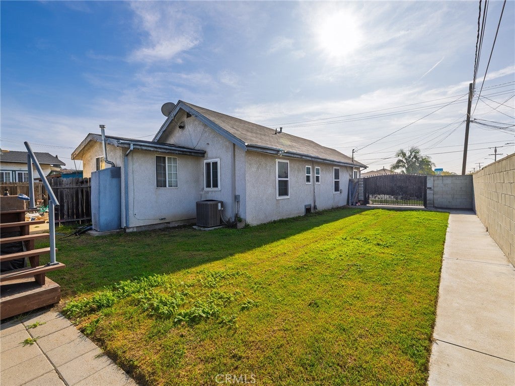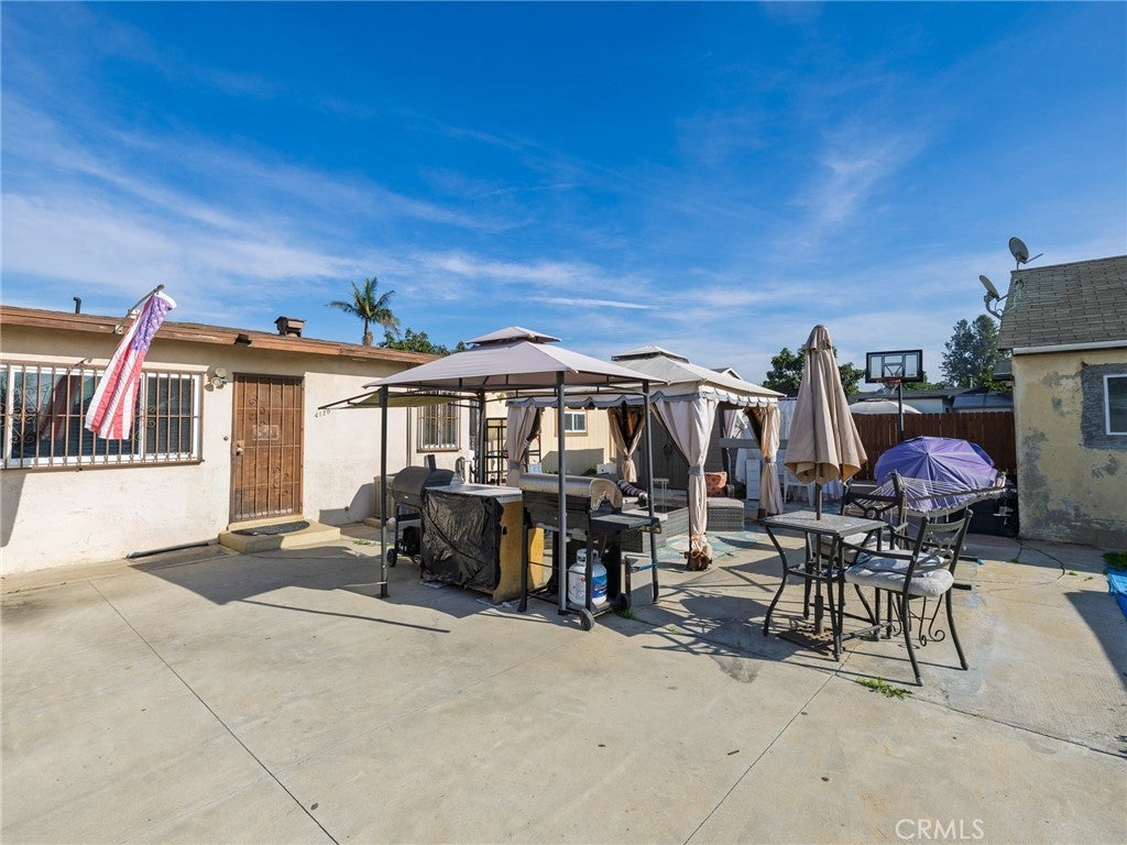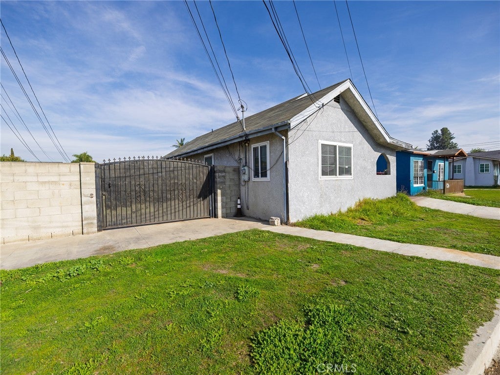Gated duplex on a 10,000+ square foot lot! This well-maintained duplex sits on a spacious lot and features two separate two bedroom, one bathroom residences. A large central courtyard, ideal for outdoor living and entertaining, sits between the two homes. The property includes a long driveway leading to a detached, oversized garage with built-in storage, additional sheds, and two washers and two dryers to accommodate the laundry needs of both units. A gazebo and outdoor barbecue island further enhance the outdoor space. The front residence features an entry nook that opens into a living area which flows directly into the dining room and kitchen. One bedroom off the living room includes built-in shelving and connects directly to a three-quarter bathroom with ample storage. The second bedroom has its own entrance off of the kitchen and similarly connects to the three-quarter bathroom. The kitchen is equipped with a gas stove and oven. A third bonus room is located on the north end of the home and could serve as another sleeping quarters, den, and/or office. The home showcases soundproof windows and doors as well as air conditioning. Two parking spaces are available in the front driveway. The rear unit offers a private entry leading into the living room, with a kitchen featuring a gas oven and stove. The layout includes two large bedrooms, tile flooring throughout, and a full bathroom. A third bonus room is located on the east end of the home and could serve as another sleeping quarters, den, and/or office. The home showcases soundproof windows and doors as well as air conditioning. With a generous courtyard separating the homes, multiple storage structures, ample parking, and gated access, this property presents a compelling opportunity for owner-occupants, multigenerational living, or investors seeking flexibility and outdoor amenities in a private setting.