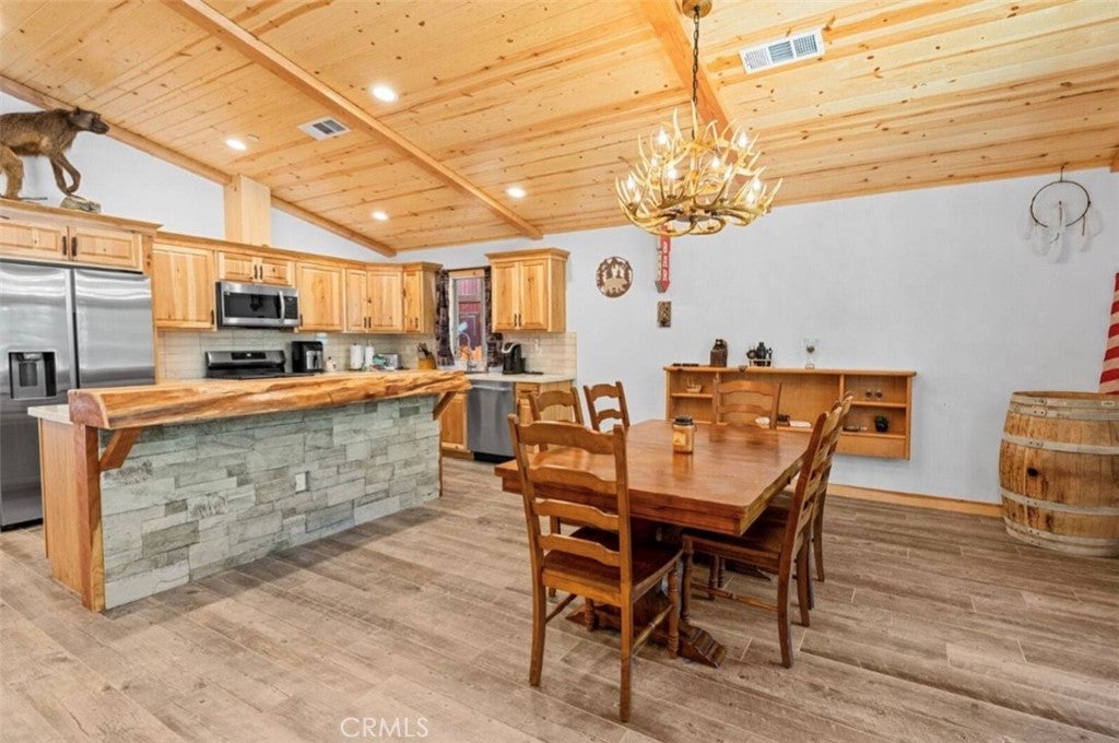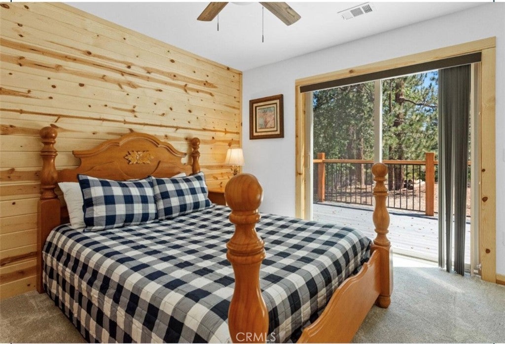 Accepting backup offers!!! Single-story log-style home ideally located between the Village and Snow Summit. This well-crafted mountain retreat features cedar siding, an open floor plan, and vaulted knotty pine ceilings. The kitchen offers granite slab countertops and stainless steel appliances, including refrigerator, range, dishwasher, and microwave. The home includes three bedrooms and two full baths, with a primary suite featuring an ensuite bath and sliding door to the back deck. Tile flooring accents the main living areas, with carpeted bedrooms for comfort. Hallway washer/dryer hookups and fire sprinklers add convenience and peace of mind. Enjoy owned solar panels for energy efficiency, a deep lot with a large flat backyard, and an attached one-car garage with tall ceilings and EV charging wiring. Ample off-street parking. Minutes from the Village, ski slopes, lake, shopping, and dining—offering modern comfort with classic mountain charm.