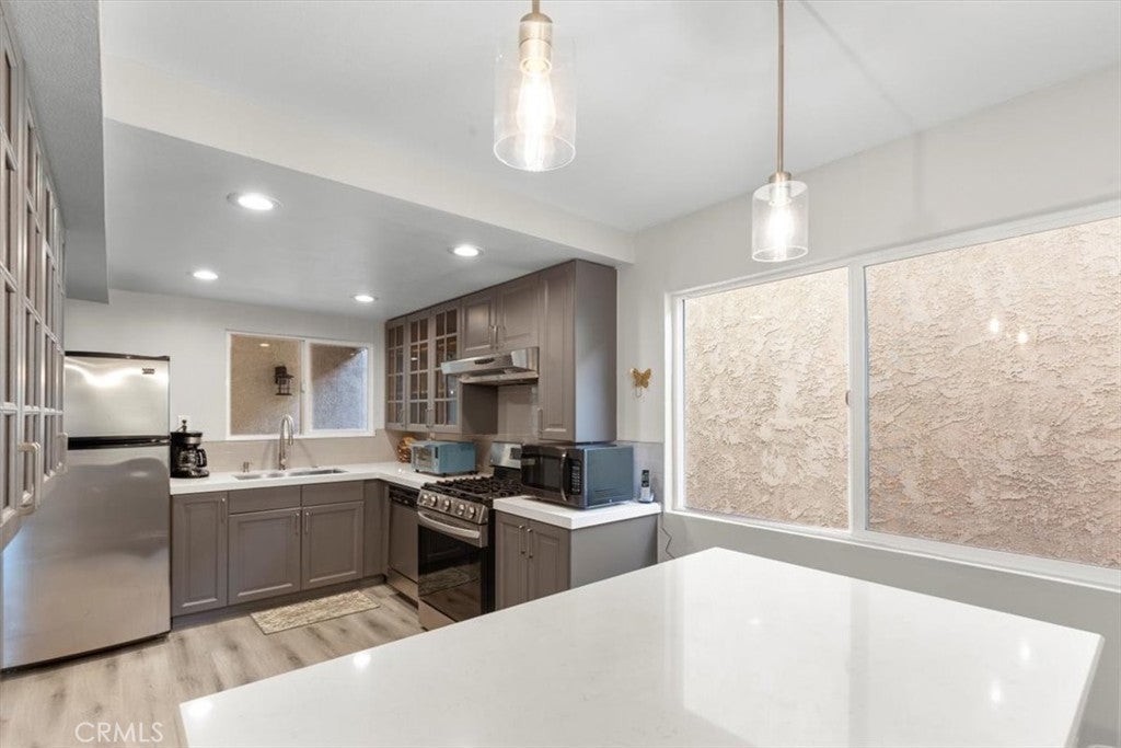 Welcome to 1353 Termino Ave, where modern living meets effortless charm! This beautifully remodeled 4-bedroom, 2-bathroom home sits on an R2 lot, offering potential for future opportunities, and boasts 1,701 square feet of thoughtfully designed space that’s ready to impress. Step inside to discover an inviting open-concept layout, illuminated by sleek recessed lighting and grounded by stylish vinyl flooring throughout. The living room exudes a modern touch and warmth with a living room fireplace, creating the perfect spot for relaxing evenings or ones made for entertaining. Downstairs, you’ll find three nice sized, comfortable bedrooms, each fitted with ceiling fans for year-round comfort, one bedroom with a spacious walk-in closet, as well as an updated bathroom featuring a full bath. Dual pane windows throughout. Upstairs, primary suite is a private retreat, complete with a spacious layout and an updated en-suite bathroom that includes a double vanity, walk-in shower—perfect for unwinding after a long day. Outdoors, the possibilities are endless! From the living area sliding door head to your large wood-slatted deck in the backyard, great for hosting and family gatherings. The deck leads to the detached 2-car garage, perfect for extra storage, workshop or ADU. Head up to the rooftop deck and soak in stunning city views—ideal for sunset gatherings or quiet morning coffee. Nestled in a prime Long Beach location, this home places you within moments of everything. Enjoy nearby restaurants, shopping plazas, and local favorites in Belmont Shore and Downtown Long Beach. Commutes are a breeze with quick access to freeways, public transportation, and Long Beach Airport. Plus, you’re just minutes from a golf course for weekend rounds or afternoon strolls. This is more than a home—it’s a lifestyle. Don’t miss your chance to make it yours!
