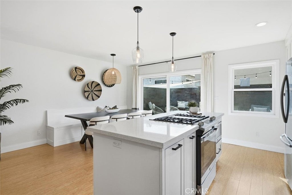 Set on a desirable corner lot in Redondo Beach, this immaculately maintained, thoughtfully updated home has a crisp modern feel and standout indoor-outdoor living. A striking contemporary front door opens to a bright living room with wood floors and a custom crafted TV nook that keeps the space polished and functional. The open layout flows into a beautifully refreshed kitchen featuring new cabinetry and quartz countertops, a farmhouse sink, designer tile backsplash, a spacious center island and a newer cooktop with griddle. A custom coffee nook adds everyday convenience, while built-in seating creates the perfect casual dining area with room for a large table. The bathrooms have been completely redone with fresh tile, paint, updated tub and shower surrounds and new vanities, delivering a clean, elevated look throughout. The downstairs bath showcases a glass shower, hex tile flooring, a floating wood vanity and herringbone tile detail in the shower. Sliding doors open to a custom tropical hardwood (cumaru) deck with built-in seating and plenty of space to grill, relax or gather around a fire pit, complemented by matching cumaru fencing for a warm, modern finish. Upstairs, a bonus space is ideal for an office or playroom and opens to a large patio for an additional outdoor escape. Three upstairs bedrooms feature wood floors, fresh paint and ample closet space, along with custom window coverings that complete the look. Behind the scenes, major upgrades provide comfort and peace of mind: new double-pane vinyl windows throughout, a new central A/C and heating system, new Pex/copper plumbing lines, a hot water recirculation system for instant hot water at every faucet, whole house water filtration, a 200-amp electrical panel and a water heater replaced in 2020. Recessed lighting, a skylight, custom railings and clean horizontal fencing tie it all together—this is a turn-key Redondo Beach opportunity with style, function and upgrades already done.