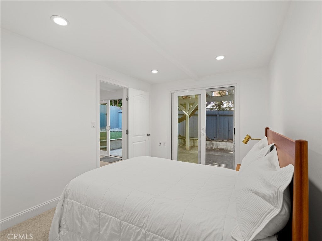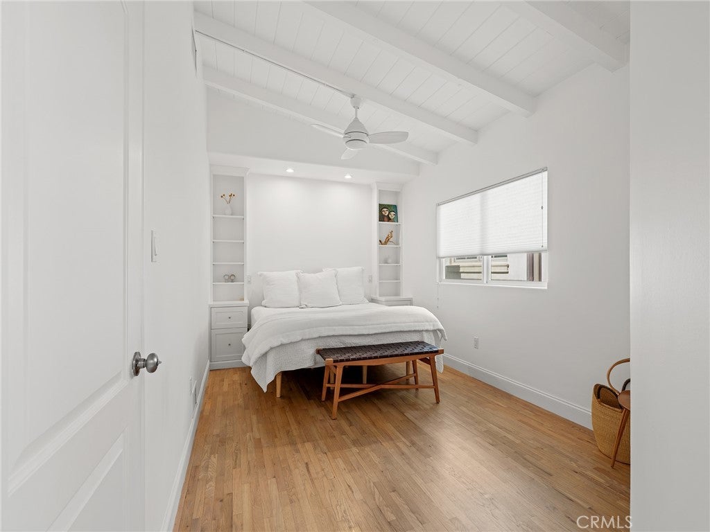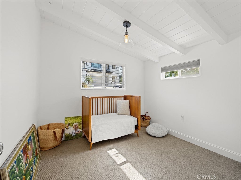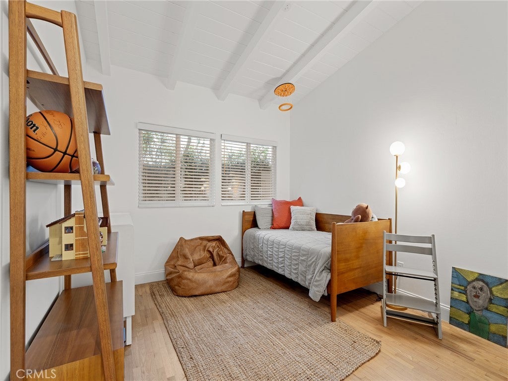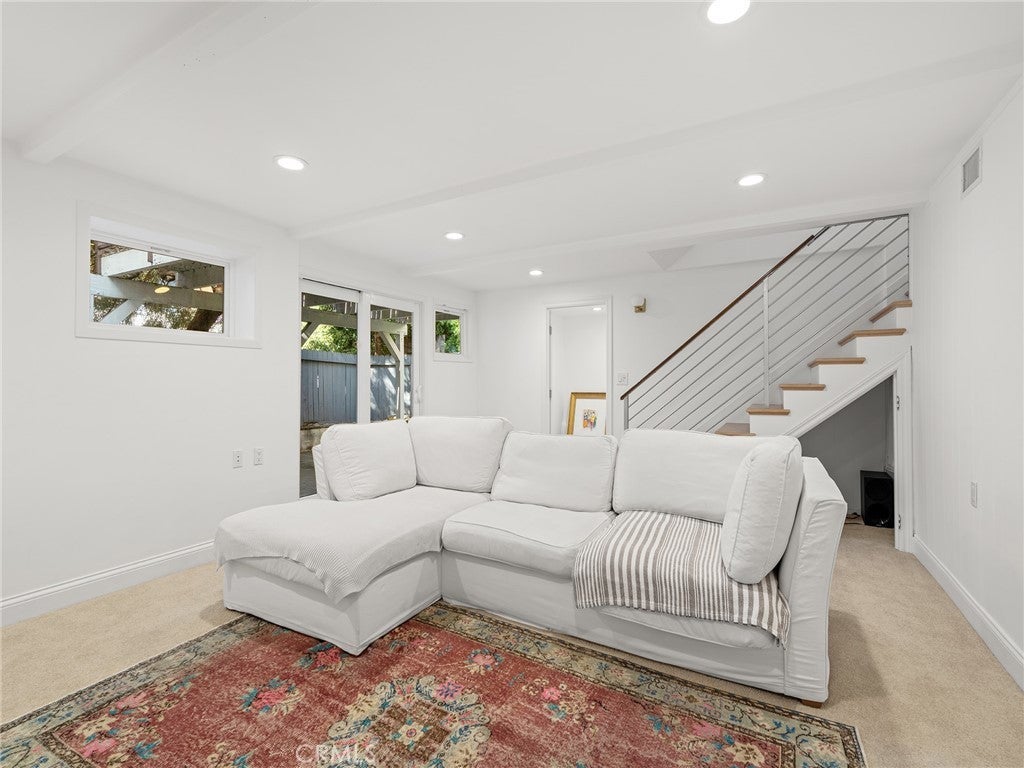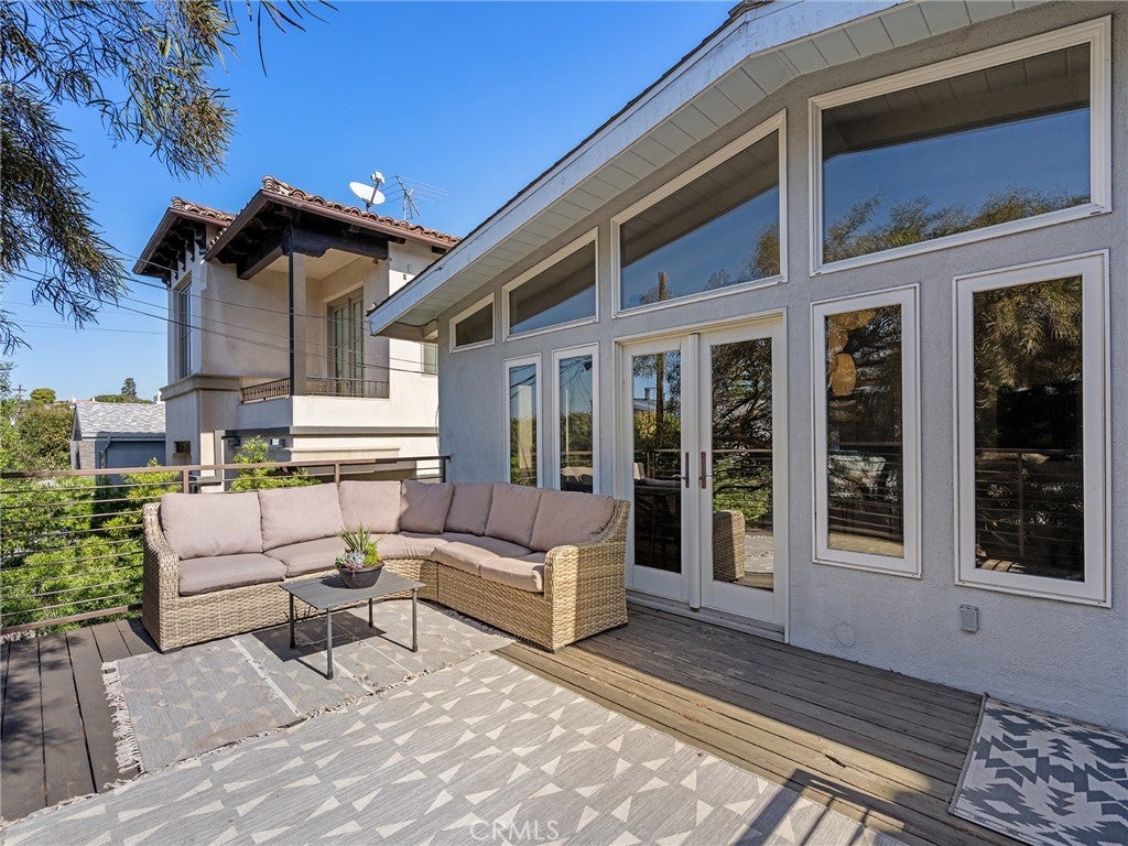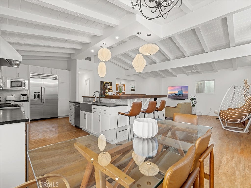 California coastal street presence with a bright, mid century modern interior. The main level features a vaulted ceiling great room with exposed beams, wood floors, and abundant natural light. An open layout connects the living area to the kitchen and dining space, where large glass windows and doors frame the rear deck and yard, creating a strong indoor outdoor connection. The kitchen and dining area include bar seating and direct access to the outdoor deck for easy entertaining. Three bedrooms and two bathrooms, including the primary suite, are all located on the main level, along with an office and laundry area. The lower level offers a second living or media room, a fourth bedroom, and access to a private yard and covered patio, providing flexible space for guests, work, or recreation. Additional features include central air conditioning, an attached two car garage with direct access, and a convenient Tree Section location close to Manhattan Beach schools, restaurants, shopping and the beach.