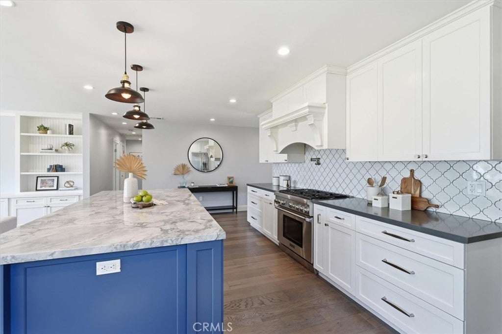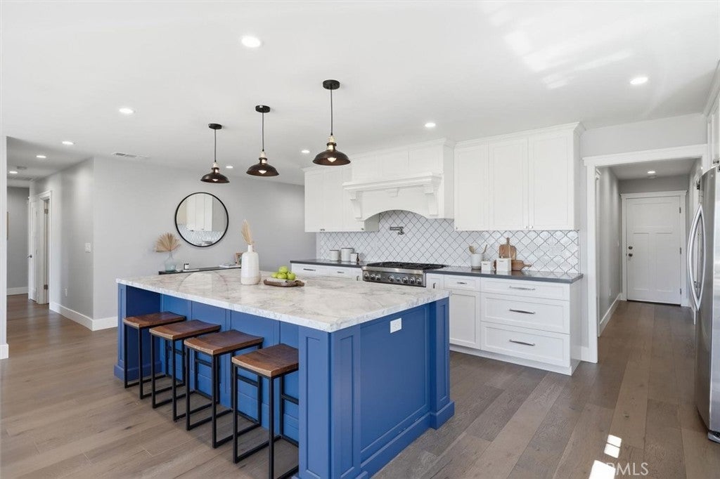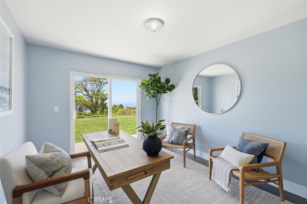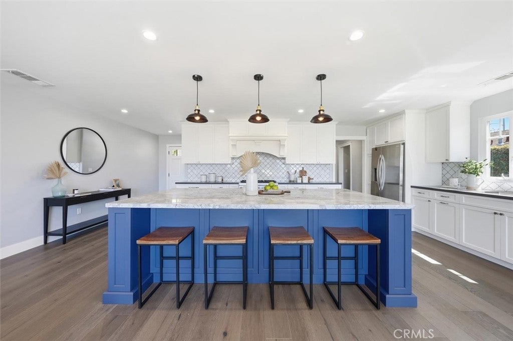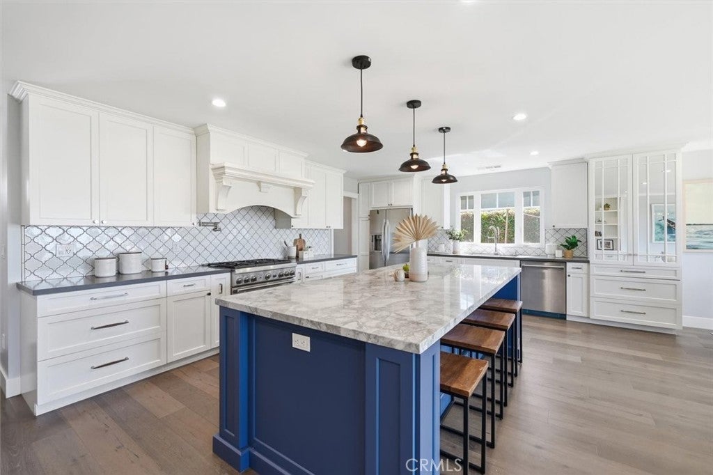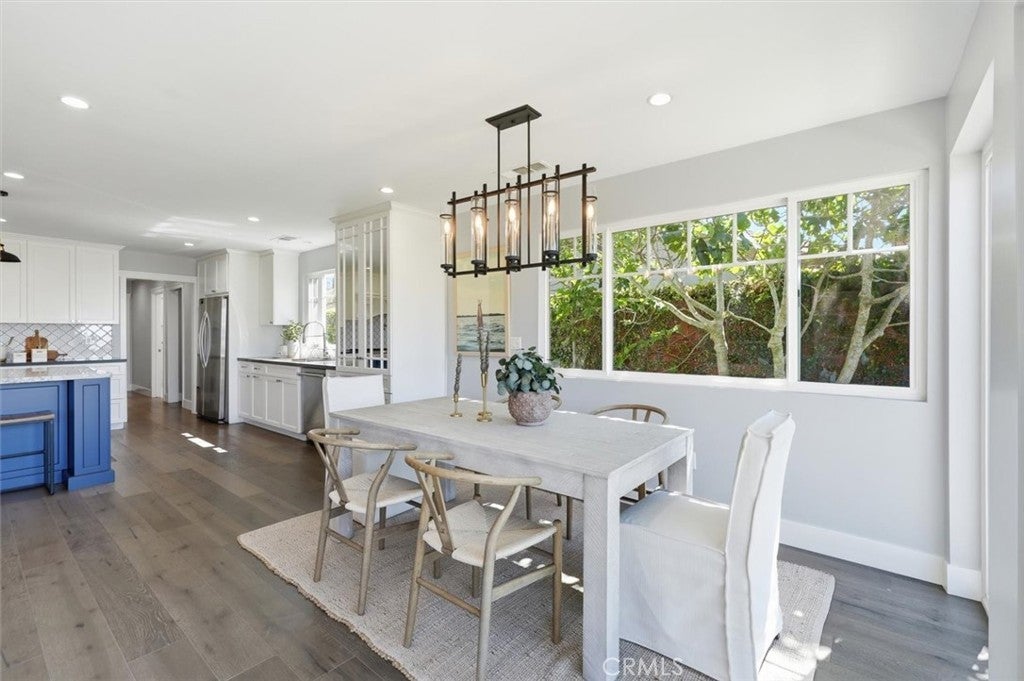 Perched above the Pacific in Rancho Palos Verdes’ sought after Los Verdes neighborhood, this beautifully renovated home captures sweeping ocean views and the kind of sunsets that define coastal California living. Inside, a bright open layout unfolds across wide plank flooring, with a wall of glass that draws the horizon into the main living spaces and opens to an expansive, flat backyard. The effect is easy and relaxed, with the indoor and outdoor experience blending naturally as light moves through the home throughout the day. At the center of the home, the kitchen is anchored by a sculptural Dolomite stone island, balanced by clean lined cabinetry, a Thermador six burner range, wine fridge, and a generous butler’s pantry. The layout opens seamlessly to the living and dining areas, creating one expansive gathering space with uninterrupted sightlines toward the ocean. Five bedrooms provide flexibility for a range of living arrangements. One bedroom and full bath are positioned privately on the opposite side of the home, well suited for guests, extended family, or a quiet work from home space. Four additional bedrooms extend down the main hallway, including two that capture west facing ocean views. The primary suite offers a calm retreat with sliding doors that open to the backyard and sunset views beyond, while the ensuite bath features dual sinks and a spacious walk in shower. The bathrooms throughout the home have been tastefully updated to match the home’s fresh coastal palette. Outside, the backyard offers a rare stretch of flat lawn and patio space, ideal for outdoor dining, gatherings with friends, or simply taking in the wide open view of the Pacific. Located in the heart of the Palos Verdes Peninsula, residents enjoy close proximity to coastal parks, scenic hiking and riding trails, golf courses, and everyday conveniences. Vista Grande Elementary, Fred Hesse Community Park, and the Palos Verdes Promenade are all just minutes away.
